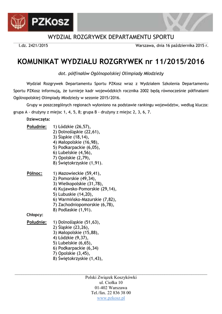 WYDZIAŁ ROZGRYWEK DEPARTAMENTU SPORTU ______________________________________________________________________________________________________________________________________________________________________________ l.dz. 2421/2015 Warszawa, dnia 16 października 2015 r. KOMUNIKAT WYDZIAŁU ROZGRYWEK nr 11/2015/2016 dot. półfinałów Ogólnopolskiej Olimpiady Młodzieży Wydział Rozgrywek Departamentu Sportu PZKosz wraz z Wydziałem Szkolenia Departamentu Sportu PZKosz informują, że turnieje kadr wojewódzkich rocznika 2002 będą równocześnie półfinałami Ogólnopolskiej Olimpiady Młodzieży w sezonie 2015/2016. Grupy w poszczególnych regionach wyłoniono na podstawie rankingu województw, według klucza: grupa A - drużyny z miejsc 1, 4, 5, 8; grupa B - drużyny z miejsc 2, 3, 6, 7. Dziewczęta: Południe: 1) 2) 3) 4) 5) 6) 7) 8) Łódzkie (26,57), Dolnośląskie (22,61), Śląskie (18,14), Małopolskie (16,98), Podkarpackie (6,05), Lubelskie (4,56), Opolskie (2,79), Świętokrzyskie (1,91). Północ: 1) 2) 3) 4) 5) 6) 7) 8) Mazowieckie (59,41), Pomorskie (49,34), Wielkopolskie (31,78), Kujawsko-Pomorskie (29,14), Lubuskie (14,20), Warmińsko-Mazurskie (7,82), Zachodniopomorskie (6,78), Podlaskie (1,91). 1) 2) 3) 4) 5) 6) 7) 8) Dolnośląskie (51,63), Śląskie (23,26), Małopolskie (15,88), Łódzkie (9,37), Lubelskie (6,65), Podkarpackie (6,34) Opolskie (3,45), Świętokrzyskie (1,43), Chłopcy: Południe: ______________________________________________________________________________________ Polski Związek Koszykówki ul. Ciołka 10 01-402 Warszawa Tel./fax. 22 836 38 00 www.pzkosz.pl WYDZIAŁ ROZGRYWEK DEPARTAMENTU SPORTU ______________________________________________________________________________________________________________________________________________________________________________ Północ: 1) 2) 3) 4) 5) 6) 7) 8) Mazowieckie (50,43), Pomorskie (47,27), Wielkopolskie (28,02), Kujawsko-Pomorskie (21,18), Lubuskie (13,34), Podlaskie (7,73), Zachodniopomorskie (7,14), Warmińsko-Mazurskie (6,87). Turnieje odbędą się w terminach i lokalizacjach podanych poniżej: TURNIEJE PÓŁFINAŁOWE - DZIEWCZĘTA REGION POŁUDNIE – COS Szczyrk, 06-08 listopada 2015 roku osoba odpowiedzialna: Roman Skrzecz, tel. 885 881 007, e-mail: [email protected] hala: COS Szczyrk, ul. Plażowa 8 GRUPA A - Łódzkie - Małopolskie - Podkarpackie - Świętokrzyskie 06.11.2015 (piątek) GRUPA B - Dolnośląskie - Śląskie - Lubelskie - Opolskie 07.11.2015 (sobota) Komisarz techniczny: Jan Gandor 08.11.2015 (niedziela) 9.00 Łódzkie - Świętokrzyskie 11.00 Małopolskie - Podkarpackie 13.00 Dolnośląskie - Opolskie 15.00 Śląskie - Lubelskie 17.00 Małopolskie - Świętokrzyskie 19.00 Podkarpackie - Łódzkie 9.00 Opolskie - Lubelskie 11.00 Dolnośląskie - Śląskie 13.00 Świętokrzyskie - Podkarpackie 15.00 Łódzkie - Małopolskie 17.00 Śląskie - Opolskie 19.00 Lubelskie - Dolnośląskie 8.00 o 7. miejsce A4 - B4 10.00 o awans A3 - B2 12.00 o awans A2 - B3 14.00 o 1. miejsce A1 - B1 ______________________________________________________________________________________ Polski Związek Koszykówki ul. Ciołka 10 01-402 Warszawa Tel./fax. 22 836 38 00 www.pzkosz.pl WYDZIAŁ ROZGRYWEK DEPARTAMENTU SPORTU ______________________________________________________________________________________________________________________________________________________________________________ REGION PÓŁNOC – COS Giżycko, 20-22 listopada 2015 roku osoba odpowiedzialna: Roman Skrzecz, tel. 885 881 007, e-mail: [email protected] hala: COS Giżycko, ul. Moniuszki 22 GRUPA A - Mazowieckie - Kujawsko-Pomorskie - Lubuskie - Podlaskie GRUPA B - Pomorskie - Wielkopolskie - Warmińsko-Mazurskie - Zachodniopomorskie Komisarz techniczny: Andrzej Antonow 20.11.2015 9.00 Mazowieckie - Podlaskie (piątek) 11.00 Kujawsko-Pomorskie - Lubuskie 13.00 Pomorskie - Zachodniopomorskie 15.00 Wielkopolskie - Warmińsko-Mazurskie 17.00 Kujawsko-Pomorskie - Podlaskie 19.00 Lubuskie - Mazowieckie 21.11.2015 9.00 Zachodniopomorskie - Warm.-Mazurskie (sobota) 11.00 Pomorskie - Wielkopolskie 13.00 Podlaskie - Lubuskie 15.00 Mazowieckie - Kujawsko-Pomorskie 17.00 Wielkopolskie - Zachodniopomorskie 19.00 Warmińsko-Mazurskie - Pomorskie 22.11.2015 8.00 o 7. miejsce A4 - B4 (niedziela) 10.00 o awans A3 - B2 12.00 o awans A2 - B3 14.00 o 1. miejsce A1 - B1 TURNIEJE PÓŁFINAŁOWE - CHŁOPCY REGION POŁUDNIE – COS Szczyrk, 27-29 listopada 2015 roku osoba odpowiedzialna: Bartosz Słomiński, tel. 506 849 728, mail [email protected] hala: COS Szczyrk, ul. Plażowa 8 GRUPA A - Dolnośląskie - Łódzkie - Lubelskie - Świętokrzyskie 27.11.2015 (piątek) GRUPA B - Śląskie - Małopolskie - Podkarpackie - Opolskie 28.11.2015 (sobota) Komisarz techniczny: Jan Gandor 29.11.2015 (niedziela) 9.00 Dolnośląskie - Świętokrzyskie 11.00 Łódzkie - Lubelskie 13.00 Śląskie - Opolskie 15.00 Małopolskie - Podkarpackie 17.00 Łódzkie - Świętokrzyskie 19.00 Lubelskie - Dolnośląskie 9.00 Opolskie - Podkarpackie 11.00 Śląskie - Małopolskie 13.00 Świętokrzyskie - Lubelskie 15.00 Dolnośląskie - Łódzkie 17.00 Małopolskie - Opolskie 19.00 Podkarpackie - Śląskie 8.00 o 7. miejsce A4 - B4 10.00 o awans A3 - B2 12.00 o awans A2 - B3 14.00 o 1. miejsce A1 - B1 ______________________________________________________________________________________ Polski Związek Koszykówki ul. Ciołka 10 01-402 Warszawa Tel./fax. 22 836 38 00 www.pzkosz.pl WYDZIAŁ ROZGRYWEK DEPARTAMENTU SPORTU ______________________________________________________________________________________________________________________________________________________________________________ REGION PÓŁNOC – COS Giżycko, 13-15 listopada 2014 roku osoba odpowiedzialna: Bartosz Słomiński, tel. 506 849 728, mail [email protected] hala: COS Giżycko, ul. Moniuszki 22 GRUPA A - Mazowieckie - Kujawsko-Pomorskie - Lubuskie - Warmińsko-Mazurskie GRUPA B - Pomorskie - Wielko