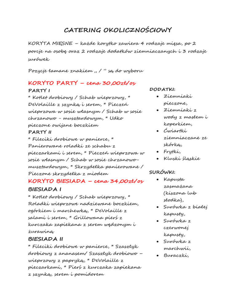CATERING OKOLICZNOŚCIOWY KORYTA MIĘSNE – każde korytko zawiera 4 rodzaje mięsa, po 2 porcje na osobę oraz 2 rodzaje dodatków ziemniaczanych i 3 rodzaje surówek Pozycje łamane znakiem „ / ” są do wyboru KORYTO PARTY – cena 30,00zł/os PARTY I * Kotlet drobiowy / Schab wieprzowy, * DODATKI: pieczone, DeVolaille z szynką i serem, * Pieczeń wieprzowa w sosie własnym / Schab w sosie Ziemniaki z wody z masłem i chrzanowo - musztardowym, * Udko koperkiem, pieczone owijane boczkiem PARTY II Ziemniaki Ćwiartki ziemniaczane ze * Fileciki drobiowe w panierce, * skórką, Panierowane roladki ze schabu z pieczarkami i serem, * Pieczeń wieprzowa w Frytki, sosie własnym / Schab w sosie chrzanowo- Kluski śląskie musztardowym, * Skrzydełka panierowane / Pieczone skrzydełka z miodem KORYTO BIESIADA – cena 34,00zł/os SURÓWKI: zasmażana BIESIADA I (kiszona lub * Kotlet drobiowy / Schab wieprzowy, * Roladki wieprzowe nadziewane boczkiem, ogórkiem i marchewką, * DeVolaille z salami i serem, * Grillowana pierś z kurczaka zapiekana z serem wędzonym i słodka), * Fileciki drobiowe w panierce, * Szaszłyk drobiowy z ananasem/ Szaszłyk drobiowo – wieprzowy z papryką, * DeVolaille z pieczarkami, * Pierś z kurczaka zapiekana z szynką, serem i pomidorem Surówka z białej kapusty, Surówka z czerwonej żurawiną BIESIADA II Kapusta kapusty, Surówka z marchwii, Buraczki, KORYTO EXTRA – cena 3 38,00zł/os Sałatka wiosenna z EXTRA I kapusty * Golonko pieczone, * Roladki wieprzowe nadziewane z boczkiem, ogórkiem i marchewką, * Roladka z piersi z kurczaka pekińskiej, lodowej z sosem ze szpinakiem i fetą, * Panierowana roladka ze schabu nadziewana boczkiem, serem i cukinią Sałatka z sałaty musztardowym, Surówka z kiszonej kapusty, Mizeria EXTRA II * Golonko pieczone, * Żeberka w miodzie, *Pierś zapiekana brokułami i serem lazur, *Panierowane roladki drobiowe z salami, papryką i serem JAK ZAMÓWIĆ: Korytka można zamawiać pod numerem: tel.728 973 456 Korytka najlepiej zamawiać z wyprzedzeniem, ponieważ ilość zamówień dostosowujemy do ilości i charakteru przyjęć okolicznościowych, które odbywają się w lokalu. WAŻNE INFORMACJE: 8. Minimalna liczba osób do przygotowania koryta: Mięsa i dodatki podawane są na drewnianych korytach/ innej zastawie, przybrane, gotowe do wyłożenia na stół. Wydawane koryta są gorące, gotowe do spożycia. Jeżeli istnieje konieczność późniejszego podania potraw, wtedy przygotujemy mięsa i dodatki w ten sposób żeby można je było podgrzać i wyłożyć na stół samodzielnie. DOWÓZ: W tygodniu koryta dowozimy pod wskazany adres na umówioną godzinę. Weekend – dowozimy koryta przy zamówieniu dla powyżej 20 osób, poniżej 20 osób odbiór własny, chyba że uda się ustalić inaczej.