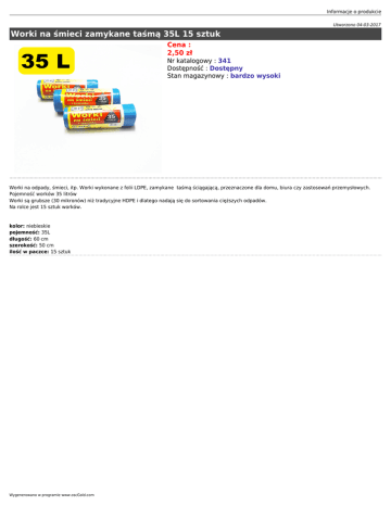 Informacje o produkcie Utworzono 04-03-2017 Worki na śmieci zamykane taśmą 35L 15 sztuk Cena : 2,50 zł Nr katalogowy : 341 Dostępność : Dostępny Stan magazynowy : bardzo wysoki Worki na odpady, śmieci, itp. Worki wykonane z folii LDPE, zamykane taśmą ściągającą, przeznaczone dla domu, biura czy zastosowań przemysłowych. Pojemność worków 35 litrów Worki są grubsze (30 mikronów) niż tradycyjne HDPE i dlatego nadają się do sortowania cięższych odpadów. Na rolce jest 15 sztuk worków. kolor: niebieskie pojemność: 35L długość: 60 cm szerokość: 50 cm ilość w paczce: 15 sztuk Wygenerowano w programie www.oscGold.com