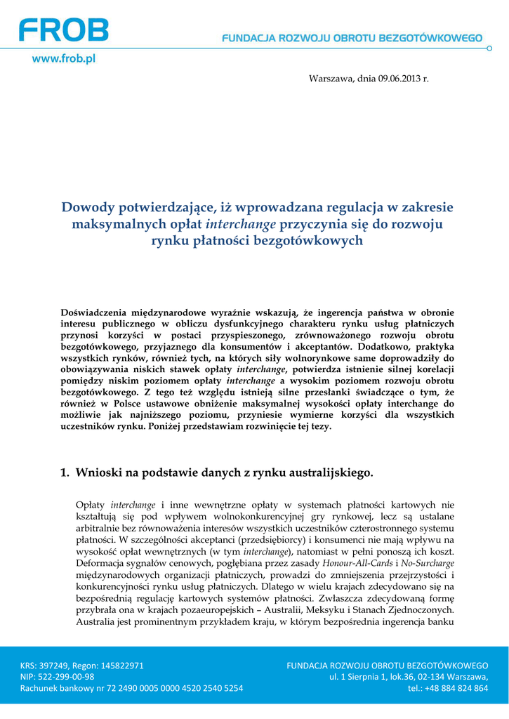 Warszawa, dnia 09.06.2013 r. Dowody potwierdzające, iż wprowadzana regulacja w zakresie maksymalnych opłat interchange przyczynia się do rozwoju rynku płatności bezgotówkowych Doświadczenia międzynarodowe wyraźnie wskazują, że ingerencja państwa w obronie interesu publicznego w obliczu dysfunkcyjnego charakteru rynku usług płatniczych przynosi korzyści w postaci przyspieszonego, zrównoważonego rozwoju obrotu bezgotówkowego, przyjaznego dla konsumentów i akceptantów. Dodatkowo, praktyka wszystkich rynków, również tych, na których siły wolnorynkowe same doprowadziły do obowiązywania niskich stawek opłaty interchange, potwierdza istnienie silnej korelacji pomiędzy niskim poziomem opłaty interchange a wysokim poziomem rozwoju obrotu bezgotówkowego. Z tego też względu istnieją silne przesłanki świadczące o tym, że również w Polsce ustawowe obniżenie maksymalnej wysokości opłaty interchange do możliwie jak najniższego poziomu, przyniesie wymierne korzyści dla wszystkich uczestników rynku. Poniżej przedstawiam rozwinięcie tej tezy. 1. Wnioski na podstawie danych z rynku australijskiego. Opłaty interchange i inne wewnętrzne opłaty w systemach płatności kartowych nie kształtują się pod wpływem wolnokonkurencyjnej gry rynkowej, lecz są ustalane arbitralnie bez równoważenia interesów wszystkich uczestników czterostronnego systemu płatności. W szczególności akceptanci (przedsiębiorcy) i konsumenci nie mają wpływu na wysokość opłat wewnętrznych (w tym interchange), natomiast w pełni ponoszą ich koszt. Deformacja sygnałów cenowych, pogłębiana przez zasady Honour-All-Cards i No-Surcharge międzynarodowych organizacji płatniczych, prowadzi do zmniejszenia przejrzystości i konkurencyjności rynku usług płatniczych. Dlatego w wielu krajach zdecydowano się na bezpośrednią regulację kartowych systemów płatności. Zwłaszcza zdecydowaną formę przybrała ona w krajach pozaeuropejskich – Australii, Meksyku i Stanach Zjednoczonych. Australia jest prominentnym przykładem kraju, w którym bezpośrednia ingerencja banku KRS: 397249, Regon: 145822971 NIP: 522-299-00-98 Rachunek bankowy nr 72 2490 0005 0000 4520 2540 5254 FUNDACJA ROZWOJU OBROTU BEZGOTÓWKOWEGO ul. 1 Sierpnia 1, lok.36, 02-134 Warszawa, tel.: +48 884 824 864 centralnego, od 1998 r. upoważnionego ustawowo do regulowania systemu płatniczego, przyniosła szereg pozytywnych korzyści. Reformą banku centralnego Australii: • od listopada 2006 r. średnia ważona opłata interchange Visa i MasterCard nie może przekraczać 0,5% wartości transakcji płatniczej, • w przypadku debetowych kart Visa i MasterCard średnia ważona opłata interchange nie może przekraczać 12 centów australijskich, • w przypadku debetowych kart rodzimego systemu EFTPOS średnia ważona opłata interchange nie może przekraczać 4-5 centów australijskich w przypadku ustaleń dwustronnych i 12 centów w przypadku ustaleń wielostronnych, • zostały zakazane zasady Honour-All-Cards i No-Surcharge, akceptanci mogą wybierać, które karty danej organizacji płatniczej przyjmują (np. tylko debetowe) i mają prawo nakładać opłaty dodatkowe od transakcji płatniczych kartami Visa i MasterCard, • ułatwiono dostęp do systemów płatności Visa i MasterCard a także niebankowym podmiotom. Wprowadzone regulacje nie tylko nie zahamowały rozwoju rynku kartowych płatności bezgotówkowych, lecz sprawiły, że zaczął się on dynamicznie rozwijać przy niższych obciążeniach finansowych ponoszonych przez akceptantów i konsumentów. Pozytywne rezultaty reformy można dostrzec, analizując statystyki i informacje podawane przez australijski bank centralny i niezależne agencje badawcze. • Australia z 282 transakcjami bezgotówkowymi na osobę (dane na koniec 2010 r.) należy do światowej czołówki w użyciu instrumentów bezgotówkowych, w tym na karty płatnicze przypadają 172 transakcje – więcej niż np. w Belgii (98) Wielkiej Brytanii (139), Szwajcarii (71) i Niemczech (33). • Po wprowadzeniu zmian regulacyjnych i limitów na opłaty interchange debetowe karty płatnicze były najszybciej rozwijającym się bezgotówkowym instrumentem płatniczym w Australii – średnioroczny wzrost liczby i wartości transakcji w okresie 2006/072011/12 wyniósł odpowiednio 14,6% i 12,8%. Rosły również statystyki kart kredytowych, chociaż wolniej – średnioroczny wzrost liczby i wartości transakcji w okresie 2006/07-2011/12 wyniósł odpowiednio 5,8% i 6,6%. • Wprowadzenie limitu opłaty interchange w żaden sposób nie spowolniło rozwoju australijskiego rynku kartowych płatności bezgotówkowych. Nieprzerwanie rosły wszystkie główne wskaźniki. Od listopada 2003 r. do listopada 2011 r. liczba transakcji kartowych wzrosła o 113%, wartość płatności o 111%, liczba wyemitowanych kart o 31%. • Istotnie zmniejszyły się koszty akceptantów z tytułu płatności kartowych. Łączna średnia opłata akceptanta (Merchant Services Charge) dla kart Visa i MasterCard spadła z 1,40% wartości transakcji w 2003 r. do 0,81% w 2012 r. Warto nadmienić, że poziom ok. 0,8-0,9% osiągnęła już w 2007 r. • Opłaty posiadacza kart kredytowych rosły szybciej przed wprowadzeniem reformy niż po wprowadzeniu reformy. Natomiast, szacuje się, że opłaty posiadacza kart KRS: 397249, Regon: 145822971 NIP: 522-299-00-98 Rachunek bankowy nr 72 2490 0005 0000 4520 2540 5254 FUNDACJA ROZWOJU OBROTU BEZGOTÓWKOWEGO ul. 1 Sierpnia 1, lok.36, 02-134 Warszawa, tel.: +48 884 824 864 debetowych w ostatniej dekadzie uległy zmniejszeniu. Należy przy tym wspomnieć, że w rozrachunku ogólnym wydawcy kart płatniczych w Australii nie zarabiają na opłatach interchange od transakcji kartami debetowymi. • Udział debetowych kart Visa i MasterCard (VMC) stopniowo się zwiększa kosztem rodzimego australijskiego systemu kart debetowych, który mimo to nadal dominuje. W 2012 r. udział