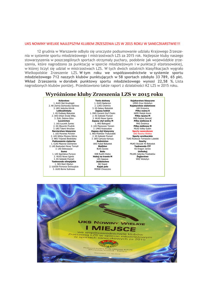 UKS NOWINY WIELKIE NAJLEPSZYM KLUBEM ZRZESZENIA LZS W 2015 ROKU W SANECZKARSTWIE!!! 12 grudnia w Warszawie odbyło się uroczyste podsumowanie udziału Krajowego Zrzeszenia w systemie sportu młodzieżowego i mistrzostwach LZS za 2015 rok. Najlepsze kluby naszego stowarzyszenia w poszczególnych sportach otrzymały puchary, podobnie jak wojewódzkie zrzeszenia, które nagrodzono za punktację w sporcie młodzieżowym i w punktacji elzetesowskiej, w której liczył się udział w mistrzostwach LZS. W tych dwóch ostatnich klasyfikacjach wygrało Wielkopolskie Zrzeszenie LZS. W tym roku we współzawodnictwie w systemie sportu młodzieżowego 712 naszych klubów punktujących w 58 sportach zdobyło 33 789, 65 pkt. Wkład Zrzeszenia w dorobek punktowy sportu młodzieżowego wynosi 22,58 %. Lista nagrodzonych klubów poniżej. Przedstawiono także raport z działalności KZ LZS w 2015 roku. Wyróżnione kluby Zrzeszenia LZS w 2015 roku Kolarstwo 1. ALKS Stal Grudziądz 2. KK Ziemia Darłowska Darłowo 3. UKS Jedynka Kórnik Lekkoatletyka 1. KS Podlasie Białystok 2. UKS Orkan Środa Wlkp. 3. ZLKL Zielona Góra Łucznictwo 1. LKS Łucznik Żywiec 2. KS Obuwnik Prudnik 3. UKS Talent Wrocław Narciarstwo klasyczne 1. LKS Poroniec Poronin 2. LKS Witów Mszana Górna 3. NKS Trójwieś Bieskidzka Podnoszenie ciężarów 1. CLKS Mazovia Ciechanów 2. LKS Budowlani Nowy Tomyśl 3. LKS Dobryszyce Sumo 1. LKS Spartakus Pyrzyce 2. WLKS Nowe Iganie 3. KS Sobieski Poznań Taekwondo olimpijskie 1. SKS Start Olsztyn 2. ULKSW Pomorze Świnoujście 3. ULKS Borne Sulinowo Tenis stołowy 1. GLKS Nadarzyn 2. LUKS Chełmno 3. KS Galaxy Białystok Zapasy kobiet 1. MKS Cement Gryf Chełm 2. KS Sobieski Poznań 3. WLKS Nowe Iganie Zapasy styl wolny M 1. AKS Białogard 2. LKS Mazowsze Teresin 3. LMKS Krasnystaw Zapasy styl klasyczny 1. AKS Piotrków Trybunalski 2. KS Sobieski Poznań 3. GKS Cartusia Kartuzy Badminton UKS Hubal Białystok Biathlon BLKS Żywiec Boks KKB Rushh Kielce Hokej na trawie M LKS Gąsawa Jeździectwo SKJ Sopot Kajak polo MOSW Choszczno Kajakarstwo klasyczne UMKS Zryw Wolsztyn Kajakarstwo slalomowe LKK Drzewica Piłka nożna K KKPK Medyk Konin Piłka ręczna M MKS Padwa Zamość Piłka siatkowa K MKS Świdnica Piłka siatkowa M MLKS Volley Gubin Sporty saneczkowe UKS Nowiny Wielkie Sporty wrotkarskie TUKS Roztocze Tomaszów Lubelski Szachy MUKS Stoczek 45 Białystok Taekwondo ITF KS Dragon Janów Unihokej MLUKS Jedynka Trzebiatów Żeglarstwo WKŻ Wolsztyn