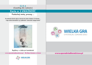 GRA (Coaching dla rodziców) Karta nr 2 UWAŻNOŚĆ Posłuchaj mnie, proszę… W wychowaniu dziecka większe znaczenie ma uważne słuchanie, niż mówienie… Czego ostatnio dowiedziałeś się o problemach i smuteczkach swojego dziecka? Bądźmy w dobrym kontakcie! www.eporadniadlarodzicow.pl FB: Mam Dziecko w Szkole www.eporadniadlarodzicow.pl