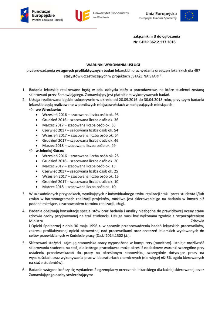 załącznik nr 3 do ogłoszenia Nr K-DZP.362.2.137.2016 WARUNKI WYKONANIA USŁUGI przeprowadzenia wstępnych profilaktycznych badań lekarskich oraz wydania orzeczeń lekarskich dla 497 stażystów uczestniczących w projektach „STAŻE NA START”: 1. Badania lekarskie realizowane będą w celu odbycia staży u pracodawców, na które studenci zostaną skierowani przez Zamawiającego. Zamawiający jest płatnikiem wykonywanych badań. 2. Usługa realizowana będzie sukcesywnie w okresie od 20.09.2016 do 30.04.2018 roku, przy czym badania lekarskie będą realizowane w poniższych miejscowościach w następujących miesiącach: we Wrocławiu: Wrzesień 2016 – szacowana liczba osób ok. 93 Grudzień 2016 – szacowana liczba osób ok. 36 Marzec 2017 – szacowana liczba osób ok. 35 Czerwiec 2017 – szacowana liczba osób ok. 54 Wrzesień 2017 – szacowana liczba osób ok. 64 Grudzień 2017 – szacowana liczba osób ok. 46 Marzec 2018 – szacowana liczba osób ok. 49 w Jeleniej Górze: Wrzesień 2016 – szacowana liczba osób ok. 25 Grudzień 2016 – szacowana liczba osób ok. 20 Marzec 2017 – szacowana liczba osób ok. 15 Czerwiec 2017 – szacowana liczba osób ok. 25 Wrzesień 2017 – szacowana liczba osób ok. 15 Grudzień 2017 – szacowana liczba osób ok. 10 Marzec 2018 – szacowana liczba osób ok. 10 3. W uzasadnionych przypadkach, wynikających z indywidualnego trybu realizacji stażu przez studenta i/lub zmian w harmonogramach realizacji projektów, możliwe jest skierowanie go na badania w innych niż podane miesiące, z zachowaniem terminu realizacji usługi. 4. Badania obejmują konsultacje specjalistów oraz badania i analizy niezbędne do prawidłowej oceny stanu zdrowia osoby przyjmowanej na staż studencki. Usługa musi być wykonana zgodnie z rozporządzeniem Ministra Zdrowia i Opieki Społecznej z dnia 30 maja 1996 r. w sprawie przeprowadzenia badań lekarskich pracowników, zakresu profilaktycznej opieki zdrowotnej nad pracownikami oraz orzeczeń lekarskich wydawanych do celów przewidzianych w Kodeksie pracy (Dz.U.2014.1502 j.t.). 5. Skierowani stażyści zajmują stanowiska pracy wyposażone w komputery (monitory). Istnieje możliwość skierowania studenta na staż, dla którego pracodawca może określić dodatkowe warunki szczególne przy ustaleniu przeciwwskazań do pracy na określonym stanowisku, szczególnie dotyczące pracy na wysokościach oraz wykonywania prac w laboratoriach chemicznych (nie więcej niż 5% ogółu kierowanych na staże studentów). 6. Badanie wstępne kończy się wydaniem 2 egzemplarzy orzeczenia lekarskiego dla każdej skierowanej przez Zamawiającego osoby stwierdzającym: brak przeciwwskazań zdrowotnych do pracy na określonym stanowisku pracy lub przeciwwskazania zdrowotne do pracy na określonym stanowisku pracy. 7. Zamawiający wymaga, aby pobieranie materiału do badań laboratoryjnych oraz wszystkie badania były wykonywane w jednym ośrodku leczniczym Wykonawcy we Wrocławiu lub Jeleniej Górze w zależności od projektu w ramach którego studenci będą skierowani na badania (3 projekty obejmujące kierunki we Wrocławiu, a 1 projekt obejmujący kierunki w Jelenie Górze – zgodnie z zapisami zawartymi w punkcie 1 Przedmiot zamówienia). 8. Organizacja świadczenia usług lekarskich: Wykonawca przeprowadzi badania profilaktyczne na podstawie skierowania wystawionego przez Zamawiającego, na którym Zamawiający określi zakład pracy, w którym odbywany będzie staż; termin rozpoczęcia badań zaproponowany przez Wykonawcę nie może przypadać później niż w ciągu 3 dni roboczych od dnia zgłoszenia się skierowanej osoby; badania zakończone będą niezwłocznie, nie później niż następnego dnia roboczego po dniu rozpoczęcia badań; w przypadku stwierdzenia konieczności wykonania badań specjalistycznych, termin oczekiwania na to badanie nie przekroczy 7 dni roboczych; Wykonawca zapewni bieżącą realizację usług medycznych. Zamawiający zastrzega sobie możliwość niewykorzystania umowy w całości. 9. Zamawiający zastrzega sobie prawo niewykorzystania umowy w całości poprzez zmniejszenie liczby studentów skierowanych na badania do 85% przewidywanej początkowej liczby studentów. Wykonawca wystawi fakturę VAT obejmującą rzeczywistą zrealizowaną liczbę badań. 10. Wykonawca jest zobowiązany wykazać, że w okresie ostatnich trzech lat przed upływem terminu składania ofert, a jeżeli okres prowadzenia działalności jest krótszy, w tym okresie – wykonał należycie co najmniej 2 usługi odpowiadające swoim rodzajem usłudze stanowiącej przedmiot zamówienia, o wartości nie mniejszej niż 50 000 PLN brutto każda. W celu wykazania spełniania w/w warunku Wykonawca przedstawi Wykaz wykonanych usług (załącznik nr 2) wraz z dowodami określającymi, czy usługa została wykonana w sposób należyty. 11. Wykonawca ponosi odpowiedzialność za szkody powstałe przy wykonywaniu zadania. 12. Jeżeli Wykonawca nie będzie wykonywał zamówienia lub będzie wykonywał zamówienie w sposób wadliwy lub sprzeczny z umową, Zamawiający wezwie Wykonawcę i wyznaczy mu termin do niezwłocznej zmiany sposobu wykonania zamówienia. Po bezskutecznym upływie w/w terminu Zamawiającemu będzie przysługiwało prawo do odstąpienia, rozwiązania lub wypowiedzenia umowy oraz uprawnienie do powierzenia wykonania niniejszego zamówienia osobie trzeciej, na koszt i ryzyko Wykonawcy. 13. Warunki fakturowania i płatności: fakturowanie po odebraniu usługi. Faktury będą wystawiane odrębnie po każdym zakończonym miesiącu, odrębnie dla każdego projektu. Termin płatności 30 dni po dokonaniu odbioru usługi i dostarczeniu prawidłowo wystawionej faktury VAT. 14. Okres związania ofertą: 30 dni od terminu składania ofert. 15. Informacja o wyborze Wykonawcy zostanie umieszczona na stronie internetowej Zamawiającego. 16. Informacje dla Wykonawców o złożonych ofertach udziela telefonicznie o