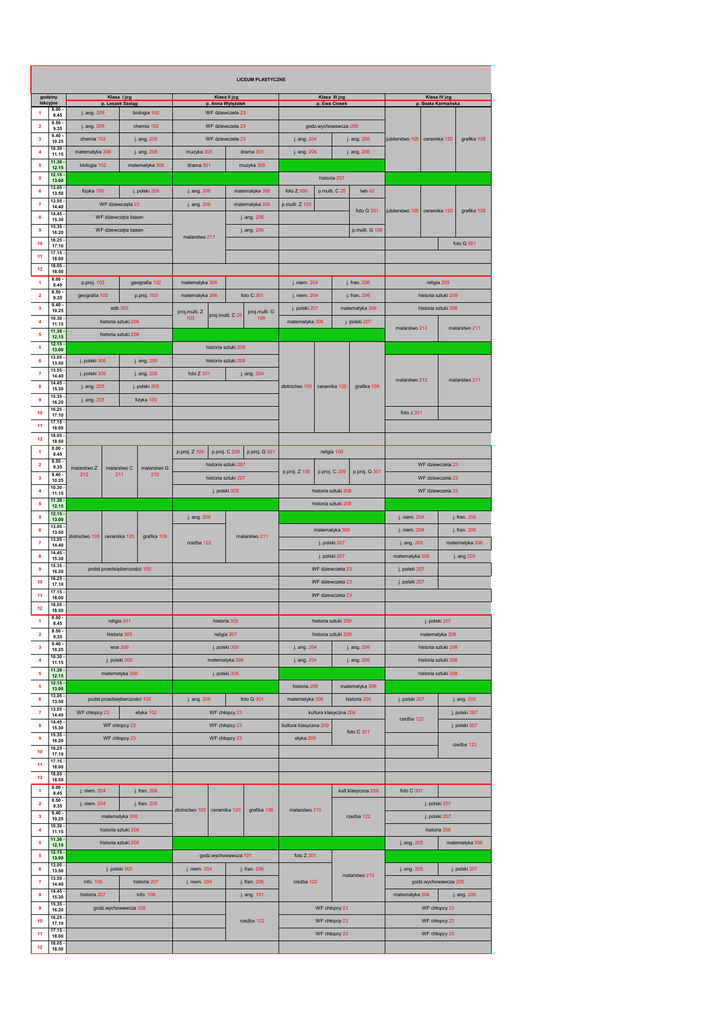 LICEUM PLASTYCZNE godziny lekcyjne 8.00 8.45 1 Klasa I jcg p. Leszek Szeląg Klasa II jcg p. Anna Wylężałek j. ang. 205 biologia 102 WF dziewczeta 23 Klasa III jcg p. Ewa Ciosek 2 8.50 9.35 j. ang. 205 chemia 102 WF dziewczeta 23 3 9.40 10.25 chemia 102 j. ang. 205 WF dziewczeta 23 4 10.30 11.15 matematyka 306 j. ang. 205 muzyka 305 drama 301 5 11.30 12.15 biologia 102 matematyka 306 drama 301 muzyka 305 5 12.15 13.00 6 13.05 13.50 fizyka 100 j. polski 209 j. ang. 206 matematyka 306 foto Z 300 7 13.55 14.40 WF dziewczęta 23 j. ang. 206 matematyka 306 p.multi. Z 103 8 14.45 15.30 WF dziewczęta basen WF dziewczęta basen Klasa IV jcg p. Beata Karmańska godz.wychowawcza 208 j. ang. 204 j. ang. 206 j. ang. 204 j. ang. 206 jubilerstwo 105 ceramika 120 grafika 108 jubilerstwo 105 ceramika 120 grafika 108 historia 207 p.multi. C 25 lwb 42 foto G 301 j. ang. 206 9 15.35 16.20 10 16.25 17.10 11 17.15 18.00 12 18.05 18.50 1 8.00 8.45 p.proj. 103 geografia 102 matematyka 306 2 8.50 9.35 geografia 102 p.proj. 103 matematyka 306 j. ang. 206 p.multi. G 106 malarstwo 211 foto G 301 3 9.40 10.25 edb 305 4 10.30 11.15 historia sztuki 208 5 11.30 12.15 historia sztuki 208 5 12.15 13.00 6 13.05 13.50 j. polski 305 j. ang. 205 7 13.55 14.40 j. polski 305 j. ang. 205 8 14.45 15.30 j. ang. 205 j. polski 305 j. ang. 205 fizyka 100 proj.multi. Z 103 foto C 301 proj.multi. C 25 proj.multi. G 109 j. niem. 204 j. fran. 206 religia 209 j. niem. 204 j. fran. 206 historia sztuki 209 j. polski 207 matematyka 306 historia sztuki 209 matematyka 306 j. polski 207 malarstwo 212 malarstwo 211 malarstwo 212 malarstwo 211 historia sztuki 208 historia sztuki 208 foto Z 301 j. ang. 204 złotnictwo 105 ceramika 120 grafika 109 9 15.35 16.20 10 16.25 17.10 11 17.15 18.00 12 18.05 18.50 1 8.00 8.45 2 8.50 9.35 3 9.40 10.25 4 10.30 11.15 5 11.30 12.15 5 12.15 13.00 6 13.05 13.50 7 13.55 14.40 8 14.45 15.30 9 15.35 16.20 10 11 12 18.05 18.50 1 8.00 8.45 religia 301 historia 305 historia sztuki 209 j. polski 207 2 8.50 9.35 historia 305 religia 207 historia sztuki 209 matematyka 306 foto J 301 p.proj. Z 106 malarstwo Z 212 malarstwo C 211 p.proj. C 209 p.proj. G 301 religia 100 historia sztuki 207 malarstwo G 210 WF dziewczeta 23 p.proj. Z 106 p.proj. C 209 p.proj. G 301 historia sztuki 207 WF dziewczeta 23 j. polski 305 historia sztuki 208 WF dziewczeta 23 historia sztuki 208 j. ang. 209 złotnictwo 105 ceramika 120 j. niem. 204 grafika 109 j. fran. 206 matematyka 306 j. niem. 204 j. fran. 206 j. polski 207 j. ang. 205 matematyka 306 j. ang 205 malarstwo 211 rzeźba 122 j. polski 207 matematyka 306 WF dziewczeta 23 j. polski 207 16.25 17.10 WF dziewczeta 23 j. polski 207 17.15 18.00 WF dziewczeta 23 podst.przedsiębierczości 100 3 9.40 10.25 wos 306 j. polski 305 j. ang. 204 j. ang. 206 historia sztuki 208 4 10.30 11.15 j. polski 305 matematyka 306 j. ang. 204 j. ang. 206 historia sztuki 208 5 11.30 12.15 matematyka 306 j. polski 305 5 12.15 13.00 historia 209 matematyka 306 6 13.05 13.50 matematyka 306 historia 209 7 13.55 14.40 8 14.45 15.30 WF chłopcy 23 9 15.35 16.20 WF chłopcy 23 10 16.25 17.10 11 17.15 18.00 12 18.05 18.50 1 8.00 8.45 j. niem. 204 j. fran. 206 2 8.50 9.35 j. niem. 204 j. fran. 206 3 9.40 10.25 matematyka 306 4 10.30 11.15 historia sztuki 208 5 11.30 12.15 historia sztuki 208 5 12.15 13.00 6 13.05 13.50 7 13.55 14.40 info. 106 historia 207 8 14.45 15.30 historia 207 info. 106 9 15.35 16.20 10 16.25 17.10 11 17.15 18.00 12 18.05 18.50 podst.przedsiębierczości 100 WF chłopcy 23 historia sztuki 208 j. ang. 206 etyka 102 foto G 301 WF chłopcy 23 j. polski 207 j. ang. 205 kultura klasyczna 209 j. polski 207 rzeźba 122 WF chłopcy 23 kultura klasyczna 209 j. polski 207 foto C 301 WF chłopcy 23 etyka 209 rzeźba 122 kult.klasyczna 209 j. polski 207 złotnictwo 105 ceramika 120 grafika 108 malarstwo 210 rzeźba 122 j. polski 207 historia 306 godz.wychowawcza 101 j. polski 305 foto C 301 j. niem. 204 j. fran. 206 j. niem. 204 j. fran. 206 j. ang. 205 matematyka 306 j. ang. 205 j. polski 207 foto Z 301 malarstwo 210 rzeźba 122 j. ang. 101 godz.wychowawcza 305 rzeźba 122 godz.wychowawcza 205 matematyka 306 j. ang. 205 WF chłopcy 23 WF chłopcy 23 WF chłopcy 23 WF chłopcy 23 WF chłopcy 23 WF chłopcy 23