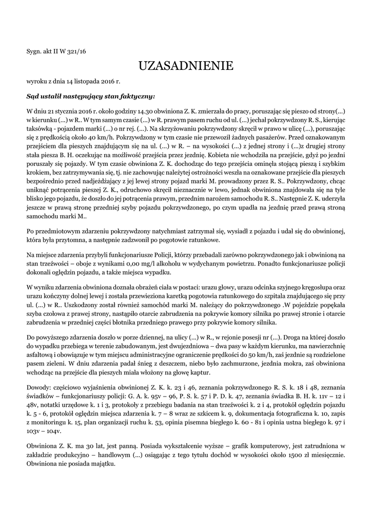 Sygn. akt II W 321/16 UZASADNIENIE wyroku z dnia 14 listopada 2016 r. Sąd ustalił następujący stan faktyczny: W dniu 21 stycznia 2016 r. około godziny 14.30 obwiniona Z. K. zmierzała do pracy, poruszając się pieszo od strony(...) w kierunku (...) w R.. W tym samym czasie (...) w R. prawym pasem ruchu od ul. (...) jechał pokrzywdzony R. S., kierując taksówką - pojazdem marki (...) o nr rej. (...). Na skrzyżowaniu pokrzywdzony skręcił w prawo w ulicę (...), poruszając się z prędkością około 40 km/h. Pokrzywdzony w tym czasie nie przewoził żadnych pasażerów. Przed oznakowanym przejściem dla pieszych znajdującym się na ul. (...) w R. – na wysokości (...) z jednej strony i (...)z drugiej strony stała piesza B. H. oczekując na możliwość przejścia przez jezdnię. Kobieta nie wchodziła na przejście, gdyż po jezdni poruszały się pojazdy. W tym czasie obwiniona Z. K. dochodząc do tego przejścia ominęła stojącą pieszą i szybkim krokiem, bez zatrzymywania się, tj. nie zachowując należytej ostrożności weszła na oznakowane przejście dla pieszych bezpośrednio przed nadjeżdżający z jej lewej strony pojazd marki M. prowadzony przez R. S.. Pokrzywdzony, chcąc uniknąć potrącenia pieszej Z. K., odruchowo skręcił nieznacznie w lewo, jednak obwiniona znajdowała się na tyle blisko jego pojazdu, że doszło do jej potrącenia prawym, przednim narożem samochodu R. S.. Następnie Z. K. uderzyła jeszcze w prawą stronę przedniej szyby pojazdu pokrzywdzonego, po czym upadła na jezdnię przed prawą stroną samochodu marki M.. Po przedmiotowym zdarzeniu pokrzywdzony natychmiast zatrzymał się, wysiadł z pojazdu i udał się do obwinionej, która była przytomna, a następnie zadzwonił po pogotowie ratunkowe. Na miejsce zdarzenia przybyli funkcjonariusze Policji, którzy przebadali zarówno pokrzywdzonego jak i obwinioną na stan trzeźwości – oboje z wynikami 0,00 mg/l alkoholu w wydychanym powietrzu. Ponadto funkcjonariusze policji dokonali oględzin pojazdu, a także miejsca wypadku. W wyniku zdarzenia obwiniona doznała obrażeń ciała w postaci: urazu głowy, urazu odcinka szyjnego kręgosłupa oraz urazu kończyny dolnej lewej i została przewieziona karetką pogotowia ratunkowego do szpitala znajdującego się przy ul. (...) w R.. Uszkodzony został również samochód marki M. należący do pokrzywdzonego .W pojeździe popękała szyba czołowa z prawej strony, nastąpiło otarcie zabrudzenia na pokrywie komory silnika po prawej stronie i otarcie zabrudzenia w przedniej części błotnika przedniego prawego przy pokrywie komory silnika. Do powyższego zdarzenia doszło w porze dziennej, na ulicy (...) w R., w rejonie posesji nr (...). Droga na której doszło do wypadku przebiega w terenie zabudowanym, jest dwujezdniowa – dwa pasy w każdym kierunku, ma nawierzchnię asfaltową i obowiązuje w tym miejscu administracyjne ograniczenie prędkości do 50 km/h, zaś jezdnie są rozdzielone pasem zieleni. W dniu zdarzenia padał śnieg z deszczem, niebo było zachmurzone, jezdnia mokra, zaś obwiniona wchodząc na przejście dla pieszych miała włożony na głowę kaptur. Dowody: częściowo wyjaśnienia obwinionej Z. K. k. 23 i 46, zeznania pokrzywdzonego R. S. k. 18 i 48, zeznania świadków – funkcjonariuszy policji: G. A. k. 95v – 96, P. S. k. 57 i P. D. k. 47, zeznania świadka B. H. k. 11v – 12 i 48v, notatki urzędowe k. 1 i 3, protokoły z przebiegu badania na stan trzeźwości k. 2 i 4, protokół oględzin pojazdu k. 5 - 6, protokół oględzin miejsca zdarzenia k. 7 – 8 wraz ze szkicem k. 9, dokumentacja fotograficzna k. 10, zapis z monitoringu k. 15, plan organizacji ruchu k. 53, opinia pisemna biegłego k. 60 - 81 i opinia ustna biegłego k. 97 i 103v – 104v. Obwiniona Z. K. ma 30 lat, jest panną. Posiada wykształcenie wyższe – grafik komputerowy, jest zatrudniona w zakładzie produkcyjno – handlowym (...) osiągając z tego tytułu dochód w wysokości około 1500 zł miesięcznie. Obwiniona nie posiada majątku. Z. K. nie była leczona psychiatrycznie, neurologicznie ani odwykowo. Obwiniona do chwili obecnej nie była karana. Dowód: dane osobopoznawcze k. 45v. Obwiniona Z. K. nie przyznała się do popełnienia zarzuconego jej czynu i wyjaśniła, że w dniu 21.01.2016 r. około godziny 14.30 była w drodze do pracy i kierowała się w stronę (...)od alei (...). Obwiniona podała, że kiedy zbliżyła się do przejścia dla pieszych na ul. (...) spojrzała w lewą stronę, aby ocenić sytuację panującą na jezdni wówczas dostrzegła zbliżający się czarny pojazd, jednak wywnioskowała, iż znajduje się na tyle daleko, że może bezpiecznie przejść przez przejście dla pieszych. Z. K. wyjaśniła, iż wykonała kilka kroków, po czym straciła przytomność. (k. 23) Na rozprawie obwiniona również nie przyznała się do popełnienia zarzucanego jej czynu, podtrzymała swoje powyższe wyjaśnienia oraz skorzystała z prawa do odmowy składania wyjaśnień. Z. K. podała jedynie, że cały czas jest leczona i pozostaje na zwolnieniu lekarskim, wyjaśniła również, że jak odzyskała przytomność była poza pasami, nie wie w jakiej odległości, a kiedy dochodziła do przejścia popatrzyła w lewo i dopiero weszła na pasy (k. 46). W ocenie Sadu wyjaśnienia obwinionej tylko częściowo zasługują na wiarę. Wiarygodna jest ta ich część, w której odnosi się ona do kierunku w jakim się poruszała, miejsca gdzie doszło do zdarzenia oraz następstw tego zdarzenia i sytuacji po zdarzeniu. W wymienionym zakresie znajdują one potwierdzenie w materiale dowodowym uznanym przez Sąd za wiarygodny. W pozostałej części treść wyjaśnień obwinionej jest niewiarygodna i zdaniem Sądu stanowi jedynie przyjętą przez Z. K. linię obrony mającą uchronić ją przed poniesieniem odpowiedzialności za zarzucany jej czyn. Przede wszystkim nie zasługują na wiarę wyjaśnienia obwinionej, w kt