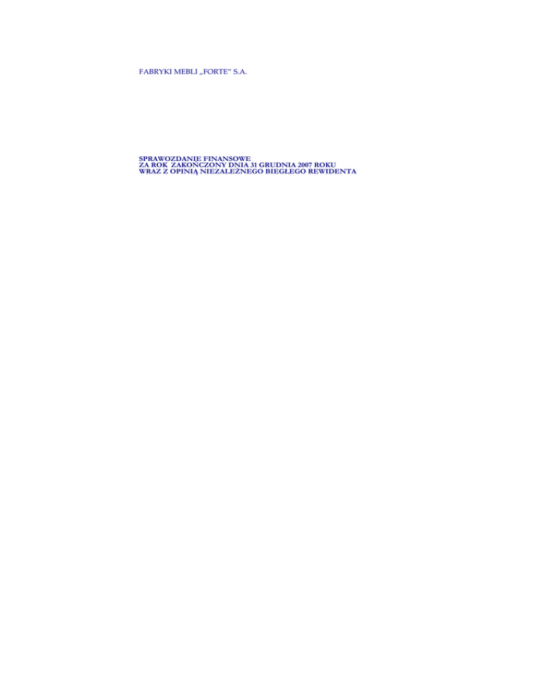 FABRYKI MEBLI „FORTE” S.A. SPRAWOZDANIE FINANSOWE ZA ROK ZAKOŃCZONY DNIA 31 GRUDNIA 2007 ROKU WRAZ Z OPINIĄ NIEZALEŻNEGO BIEGŁEGO REWIDENTA FABRYKI MEBLI „FORTE” S.A. Sprawozdanie finansowe za rok zakończony 31 grudnia 2007 roku (w tysiącach PLN) Rachunek zysków i strat .................................................................................................................................................. 3 Bilans.................................................................................................................................................................................. 3 Rachunek przepływów pieniężnych............................................................................................................................... 3 Sprawozdanie ze zmian w kapitałach własnych........................................................................................................... 3 Sprawozdanie ze zmian w kapitałach własnych........................................................................................................... 3 ZASADY (POLITYKI) RACHUNKOWOŚCI ORAZ DODATKOWE NOTY OBJAŚNIAJĄCE .............. 3 1. Informacje ogólne .................................................................................................................................................... 3 2. Identyfikacja skonsolidowanego sprawozdania finansowego............................................................................. 3 3. Skład Zarządu Spółki............................................................................................................................................... 3 4. Zatwierdzenie sprawozdania finansowego............................................................................................................ 3 5. Inwestycje Spółki...................................................................................................................................................... 3 6. Istotne wartości oparte na profesjonalnym osądzie i szacunkach...................................................................... 3 6.1. Profesjonalny osąd....................................................................................................................................... 3 6.2. Niepewność szacunków.............................................................................................................................. 3 7. Podstawa sporządzenia sprawozdania finansowego ............................................................................................ 3 7.1. Oświadczenie o zgodności ......................................................................................................................... 3 7.2. Waluta pomiaru i waluta sprawozdań finansowych ................................................................................ 3 8. Zmiany stosowanych zasad rachunkowości oraz korekty błędu........................................................................ 3 9. Nowe standardy i interpretacje, które zostały opublikowane, a nie weszły jeszcze w życie........................... 3 10. Korekta błędu ........................................................................................................................................................... 3 11. Zmiana szacunków................................................................................................................................................... 3 12. Istotne zasady rachunkowości ................................................................................................................................ 3 12.1. Przeliczanie pozycji wyrażonych w walucie obcej ................................................................................... 3 12.2. Rzeczowe aktywa trwałe ............................................................................................................................. 3 12.3. Nieruchomości inwestycyjne...................................................................................................................... 3 12.4. Wartości niematerialne................................................................................................................................ 3 12.5. Leasing........................................................................................................................................................... 3 12.6. Utrata wartości niefinansowych aktywów trwałych ................................................................................ 3 12.7. Koszty finansowania zewnętrznego .......................................................................................................... 3 12.8. Udziały i akcje w jednostkach zależnych, stowarzyszonych i wspólnych przedsięwzięciach ............ 3 12.9. Aktywa finansowe........................................................................................................................................ 3 12.10. Utrata wartości aktywów finansowych...................................................................................................... 3 12.11. Wbudowane instrumenty pochodne ......................................................................................................... 3 12.12. Pochodne instrumenty finansowe ............................................................................................................. 3 12.13. Zapasy ........................................................................................................................................................... 3 12.14. Należności z tytułu dostaw i usług oraz pozostałe należności.............................................................. 3 12.15. Środki pieniężne i ekwiwalenty środków pieniężnych ............................................................................ 3 12.16. Oprocentowane kredyty bankowe, pożyczki i papiery dłużne ...................