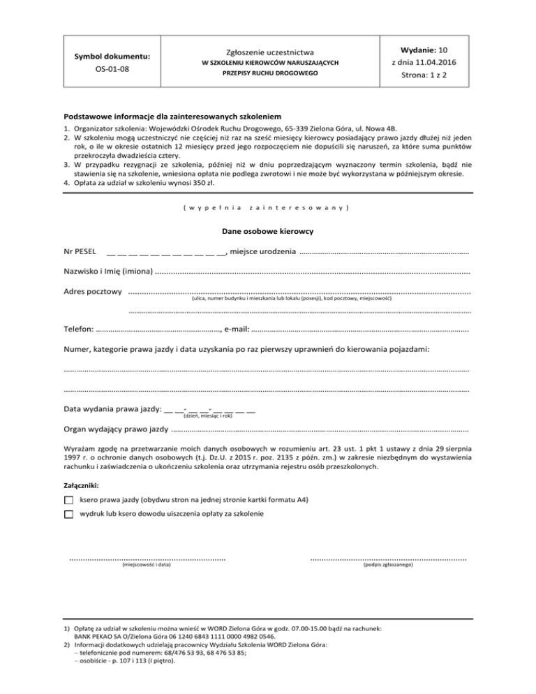 Symbol dokumentu: OS-01-08 Zgłoszenie uczestnictwa Wydanie: 10 W SZKOLENIU KIEROWCÓW NARUSZAJĄCYCH z dnia 11.04.2016 PRZEPISY RUCHU DROGOWEGO Strona: 1 z 2 Podstawowe informacje dla zainteresowanych szkoleniem 1. Organizator szkolenia: Wojewódzki Ośrodek Ruchu Drogowego, 65-339 Zielona Góra, ul. Nowa 4B. 2. W szkoleniu mogą uczestniczyć nie częściej niż raz na sześć miesięcy kierowcy posiadający prawo jazdy dłużej niż jeden rok, o ile w okresie ostatnich 12 miesięcy przed jego rozpoczęciem nie dopuścili się naruszeń, za które suma punktów przekroczyła dwadzieścia cztery. 3. W przypadku rezygnacji ze szkolenia, później niż w dniu poprzedzającym wyznaczony termin szkolenia, bądź nie stawienia się na szkolenie, wniesiona opłata nie podlega zwrotowi i nie może być wykorzystana w późniejszym okresie. 4. Opłata za udział w szkoleniu wynosi 350 zł. ( w y p e ł n i a z a i n t e r e s o w a n y ) Dane osobowe kierowcy Nr PESEL __ __ __ __ __ __ __ __ __ __ __, miejsce urodzenia ………………………….…………………………………………… Nazwisko i Imię (imiona) ........................................................................................................................................... Adres pocztowy ....................................................................................................................................................... (ulica, numer budynku i mieszkania lub lokalu (posesji), kod pocztowy, miejscowość) …………………………………………………………………………………………………………………………………………………………………. Telefon: ……………………………………………………, e-mail: ………………………………………………………………..…………………………. Numer, kategorie prawa jazdy i data uzyskania po raz pierwszy uprawnień do kierowania pojazdami: ……………………………………………………………………………………………………………………………………………………………………………. ……………………………………………………………………………………………………………………………………………………………………………. Data wydania prawa jazdy: __ __- __ __- __ __ __ __ (dzień, miesiąc i rok) Organ wydający prawo jazdy ……………………………………………………………………………………………………………………………… Wyrażam zgodę na przetwarzanie moich danych osobowych w rozumieniu art. 23 ust. 1 pkt 1 ustawy z dnia 29 sierpnia 1997 r. o ochronie danych osobowych (t.j. Dz.U. z 2015 r. poz. 2135 z późn. zm.) w zakresie niezbędnym do wystawienia rachunku i zaświadczenia o ukończeniu szkolenia oraz utrzymania rejestru osób przeszkolonych. Załączniki: ksero prawa jazdy (obydwu stron na jednej stronie kartki formatu A4) wydruk lub ksero dowodu uiszczenia opłaty za szkolenie ..................................................................... (miejscowość i data) ..................................................................... (podpis zgłaszanego) 1) Opłatę za udział w szkoleniu można wnieść w WORD Zielona Góra w godz. 07.00-15.00 bądź na rachunek: BANK PEKAO SA O/Zielona Góra 06 1240 6843 1111 0000 4982 0546. 2) Informacji dodatkowych udzielają pracownicy Wydziału Szkolenia WORD Zielona Góra: – telefonicznie pod numerem: 68/476 53 93, 68 476 53 85; – osobiście - p. 107 i 113 (I piętro). Symbol dokumentu: OS-01-08 Zgłoszenie uczestnictwa Wydanie: 10 W SZKOLENIU KIEROWCÓW NARUSZAJĄCYCH z dnia 11.04.2016 PRZEPISY RUCHU DROGOWEGO Strona: 1 z 2 Zgłoszenie uczestnictwa przyjęto dnia …………………………………….………………………….......... ……………………..……….. Termin szkolenia wyznaczono na dzień, godz.: ……………………………………...……..…………… …………………………….… O terminie szkolenia zainteresowanego powiadomiono ………………………………………….. ………………………….…… podpis organizatora szkolenia