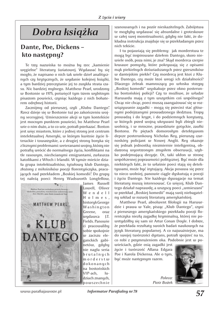 Z życia i wiary Dobra książka Dante, Poe, Dickens – kto następny? Te ty nazwiska to można by ec „kamienie węgielne” literatury światowej. Wydawać by się mogło, że napisano o nich tak wiele dzieł analitynych y krytynych, że wydanie kolejnej książki, a tym bardziej peytanie jej to zwykła strata asu. Nic bardziej mylnego. Matthew Pearl, urodzony w Bostonie w 1975, poświęcił tym tem wybitnym pisaom powieści, yniąc każdego z nich bohaterem odrębnej historii. Zanijmy od pierwszej, yli „Klubu Dantego”. Rze dzieje się w Bostonie tuż po zakońeniu wojny secesyjnej. Umieszenie akcji w tym kontekście jest mocnym punktem powieści, bo Matthew Pearl wie o nim dużo, a to co wie, potrafi pekazać. Boston jest więc miastem, które z jednej strony jest centrum intelektualnej Ameryki, w którym kwitnie życie literackie i towayskie, a z drugiej strony boryka się z linymi problemami: weteranami wojny, któy nie potrafią wrócić do normalnego życia, koniktami na tle rasowym, niechcianymi emigrantami, zwłasza katolikami z Włoch i Irlandii. W tymże mieście działa grupa intelektualistów, tytułowy klub Dantego, złożony z miłośników poezji orentyńyka, pracujących nad pekładem „Boskiej komedii”. Do grupy tej należą poeci: Henry Wadswoh Longfellow, James Russell Lowell, Oliver W e n d e l l H o l m e s , historyk George Washington Greene, oraz wydawca J.T. Fields. Panowie ci pracowaliby sobie okojnie w zaciszu eleganckich gabinetów, gdyby nie nagła seria brutalnych morderstw dokonanych na bostońskich VIP-ach, ludziach znanych, powszechnie www.parafiajawoe.pl szanowanych i na pozór nieskazitelnych. Zabójstwa te mogłyby wydawać się absurdalne i groteskowe w całej swej monstrualności, gdyby nie fakt, że dokładna instrukcja znajduje się w pekładanym pez nich tekście. I tu pojawiają się problemy: jak morderstwa te mogą być inirowane dziełem Dantego, skoro niewiele osób, poza nimi, je zna? Skąd morderca erpie krwawe pomysły, które pokrywają się z opisami mąk piekielnych doświadanych pez geszników w dantejskim piekle? Czy mordercą jest ktoś z Klubu Dantego, y może ktoś wrogi ich działalności? Dlaego żebrak mamroący po włosku stępy „Boskiej komedii” wyskakuje pez okno posterunku bostońskiej policji? Czy to możliwe, że władze Harwardu mają z tym wszystkim coś wólnego? Chcąc nie chcąc, poeci muszą zaangażować się w rozwiązywanie zagadki – mogą się pecież stać głównymi podejanymi prowadzonego śledztwa. Tropy prowadzą i do krypt, i do podziemnych korytay, w których ped wojną ukrywani byli zbiegli niewolnicy, i w mrone, prawdziwie gotyckie, zaułki Bostonu. Po piętach domorosłym detektywom depe posterunkowy Nicholas Rey, pierwszy arnoskóry policjant w Nowej Anglii. Rey okazuje się jednak jednostką niezmiernie inteligentną, obdaoną wyostonym zmysłem obserwacji, szybko podejmującą decyzje. Ot, taki ukłon w stronę wółesnej poprawności politynej. Być może dla niektórych fakt, że to właśnie poeci stają się detektywami, może być irytujący. Akcja posuwa się pez to nieco wolniej, panowie ciągle dyskutują o poezji i życiu Dantego. Nie każdego dywagacje na temat literatury muszą interesować. Co więcej, Klub Dantego działał naprawdę, a wszyscy poeci „wmieszani” w pekład „Boskiej komedii” mają swój niebagatelny wkład w rozwój literatury amerykańskiej. Matthew Pearl, absolwent filologii na Harwardzie i prawa w Yale, pisząc „Klub Dantego”, yni z pierwszego amerykańskiego pekładu poezji orentyka niezłą zagadkę kryminalną, której nie powstydziłby się sam sir Aur Conan Doyle. I dobe, że pekłada rezultaty swoich badań naukowych na język literatury popularnej. A co najważniejsze, ma do swojej twórości dystans, potrafi ojeć na to, co robi z pymrużeniem oka. Podobnie jest w powieściach, gdzie osią zagadki jest życie i twórość Allana Edgara Poe i Karola Dickensa. Ale o tym, być może następnym razem. Informator Paraalny nr 78 Poleca: Piotr Bożek 57