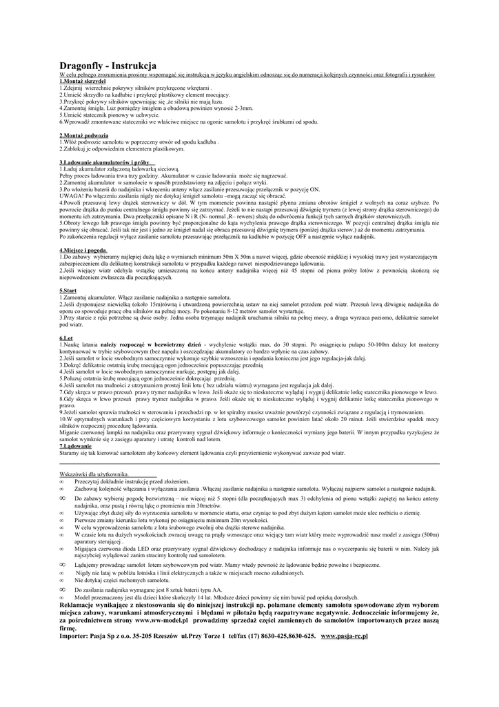 Dragonfly - Instrukcja W celu pełnego zrozumienia prosimy wspomagać się instrukcją w języku angielskim odnosząc się do numeracji kolejnych czynności oraz fotografii i rysunków 1.Montaż skrzydeł 1.Zdejmij wierzchnie pokrywy silników przykręcone wkrętami . 2.Umieść skrzydło na kadłubie i przykręć plastikowy element mocujący. 3.Przykręć pokrywy silników upewniając się ,że silniki nie mają luzu. 4.Zamontuj śmigła. Luz pomiędzy śmigłem a obudową powinien wynosić 2-3mm. 5.Umieść statecznik pionowy w uchwycie. 6.Wprowadź zmontowane stateczniki we właściwe miejsce na ogonie samolotu i przykręć śrubkami od spodu. 2.Montaż podwozia 1.Włóż podwozie samolotu w poprzeczny otwór od spodu kadłuba . 2.Zablokuj je odpowiednim elementem plastikowym. 3.Ładowanie akumulatorów i próby. 1.Ładuj akumulator załączoną ładowarką sieciową. Pełny proces ładowania trwa trzy godziny. Akumulator w czasie ładowania może się nagrzewać. 2.Zamontuj akumulator w samolocie w sposób przedstawiony na zdjęciu i połącz wtyki. 3.Po włożeniu baterii do nadajnika i wkręceniu anteny włącz zasilanie przesuwając przełącznik w pozycję ON. UWAGA! Po włączeniu zasilania nigdy nie dotykaj śmigieł samolotu –mogą zacząć się obracać. 4.Powoli przesuwaj lewy drążek sterowniczy w dół. W tym momencie powinna nastąpić płynna zmiana obrotów śmigieł z wolnych na coraz szybsze. Po powrocie drążka do punku centralnego śmigła powinny się zatrzymać. Jeżeli to nie nastąpi przesuwaj dźwignię trymera (z lewej strony drążka sterowniczego) do momentu ich zatrzymania. Dwa przełączniki opisane N i R (N- normal ,R– rewers) służą do odwrócenia funkcji tych samych drążków sterowniczych. 5.Obroty lewego lub prawego śmigła powinny być proporcjonalne do kąta wychylenia prawego drążka sterowniczego. W pozycji centralnej drążka śmigła nie powinny się obracać. Jeśli tak nie jest i jedno ze śmigieł nadal się obraca przesuwaj dźwignię trymera (poniżej drążka sterow.) aż do momentu zatrzymania. Po zakończeniu regulacji wyłącz zasilanie samolotu przesuwając przełącznik na kadłubie w pozycję OFF a następnie wyłącz nadajnik. 4.Miejsce i pogoda. 1.Do zabawy wybieramy najlepiej dużą łąkę o wymiarach minimum 50m X 50m a nawet więcej, gdzie obecność miękkiej i wysokiej trawy jest wystarczającym zabezpieczeniem dla delikatnej konstrukcji samolotu w przypadku każdego nawet niespodziewanego lądowania. 2.Jeśli wiejący wiatr odchyla wstążkę umieszczoną na końcu anteny nadajnika więcej niż 45 stopni od pionu próby lotów z pewnością skończą się niepowodzeniem zwłaszcza dla początkujących. 5.Start 1.Zamontuj akumulator. Włącz zasilanie nadajnika a następnie samolotu. 2.Jeśli dysponujesz niewielką (około 15m)równą i utwardzoną powierzchnią ustaw na niej samolot przodem pod wiatr. Przesuń lewą dźwignię nadajnika do oporu co spowoduje pracę obu silników na pełnej mocy. Po pokonaniu 8-12 metrów samolot wystartuje. 3.Przy starcie z ręki potrzebne są dwie osoby. Jedna osoba trzymając nadajnik uruchamia silniki na pełnej mocy, a druga wyrzuca poziomo, delikatnie samolot pod wiatr. 6.Lot 1.Naukę latania należy rozpocząć w bezwietrzny dzień - wychylenie wstążki max. do 30 stopni. Po osiągnięciu pułapu 50-100m dalszy lot możemy kontynuować w trybie szybowcowym (bez napędu ) oszczędzając akumulatory co bardzo wpłynie na czas zabawy. 2.Jeśli samolot w locie swobodnym samoczynnie wykonuje szybkie wznoszenia i opadania konieczna jest jego regulacja-jak dalej. 3.Dokręć delikatnie ostatnią śrubę mocującą ogon jednocześnie popuszczając przednią 4.Jeśli samolot w locie swobodnym samoczynnie nurkuje, postępuj jak dalej. 5.Poluzuj ostatnia śrubę mocującą ogon jednocześnie dokręcając przednią. 6.Jeśli samolot ma trudności z utrzymaniem prostej linii lotu ( bez udziału wiatru) wymagana jest regulacja jak dalej. 7.Gdy skręca w prawo przesuń prawy trymer nadajnika w lewo. Jeśli okaże się to nieskuteczne wyląduj i wygnij delikatnie lotkę statecznika pionowego w lewo. 8.Gdy skręca w lewo przesuń prawy trymer nadajnika w prawo. Jeśli okaże się to nieskuteczne wyląduj i wygnij delikatnie lotkę statecznika pionowego w prawo. 9.Jeżeli samolot sprawia trudności w sterowaniu i przechodzi np. w lot spiralny musisz uważnie powtórzyć czynności związane z regulacją i trymowaniem. 10.W optymalnych warunkach i przy częściowym korzystaniu z lotu szybowcowego samolot powinien latać około 20 minut. Jeśli stwierdzisz spadek mocy silników rozpocznij procedurę lądowania. Miganie czerwonej lampki na nadajniku oraz przerywany sygnał dźwiękowy informuje o konieczności wymiany jego baterii. W innym przypadku ryzykujesz że samolot wymknie się z zasięgu aparatury i utratę kontroli nad lotem. 7.Lądowanie Staramy się tak kierować samolotem aby końcowy element lądowania czyli przyziemienie wykonywać zawsze pod wiatr. Wskazówki dla użytkownika. • Przeczytaj dokładnie instrukcję przed złożeniem. • Zachowaj kolejność włączania i wyłączania zasilania .Włączaj zasilanie nadajnika a następnie samolotu. Wyłączaj najpierw samolot a następnie nadajnik. • • • • • • • Do zabawy wybieraj pogodę bezwietrzną – nie więcej niż 5 stopni (dla początkujących max 3) odchylenia od pionu wstążki zapiętej na końcu anteny nadajnika, oraz pustą i równą łąkę o promieniu min 30metrów. Używając zbyt dużej siły do wyrzucenia samolotu w momencie startu, oraz czyniąc to pod zbyt dużym kątem samolot może ulec rozbiciu o ziemię. Pierwsze zmiany kierunku lotu wykonuj po osiągnięciu minimum 20m wysokości. W celu wyprowadzenia samolotu z lotu śrubowego zwolnij oba drążki sterowe nadajnika. W czasie lotu na dużych wysokościach zwracaj uwagę na prądy wznoszące oraz wiejący tam wiatr który może wyprowadzić nas