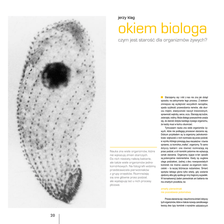 Starzejemy się i nikt z nas nie zna jak dotąd sposobu na zatrzymanie tego procesu. Z wiekiem zmniejsza się wydajność wszystkich narządów, spada szybkość przewodzenia nerwów, siła skurczu mięśni, elastyczność naczyń krwionośnych, sprawność wątroby, serca, oczu. Starzeją się ludzie, zwierzęta, rośliny. Może dlatego powszechnie uważa się, że starość dotyka każdego żywego organizmu, że każdy musi w końcu obumrzeć. Tymczasem nauka zna wiele organizmów żywych, które nie podlegają procesowi starzenia się. Dobrym przykładem są tu organizmy jednokomórkowe: większość z nich rozmnaża się przez podział, w wyniku którego powstają dwa niezależne i równie sprawne, co komórka-„matka”, organizmy. To samo dotyczy bakterii: one również rozmnażają się przez podział, a ich komórki potomne nie wykazują oznak starzenia. Organizmy żyjące w ten sposób są potencjalnie nieśmiertelne. Kiedy np. euglena ulega podziałowi, żadnej z dwu nowopowstałych komórek nie można uważać za organizm rodzicielski – to raczej bliźniacze rodzeństwo. Śmierć spotyka takiego glona tylko wtedy, gdy zostanie zjedzony albo gdy spotka go inny tragiczny wypadek. W konsekwencji żaden pierwotniak ani bakteria nie ma zmarłych przodków, bo zmarły pierwotniak nie pozostawia potomstwa. Proces starzenia się i nieuchronna śmierć dotyczy tych organizmów, które w trakcie rozwoju zarodkowego tworzą dwa typy komórek o wyraźnie oddzielonych 20 wszystkie il. w artykule: jerzy klag 21 funkcjach: komórki, które budują ciało (komórki somatyczne) i komórki przeznaczone do rozrodu (komórki płciowe). Los taki przypisany jest praktycznie wszystkim organizmom wielokomórkowym. Modelowym przykładem jest tutaj wielokomórkowy glon toczek (Volvox). Toczek jest glonem o kształcie kuli zbudowanej z zewnętrznej warstwy ok. 2000 zielonych komórek odżywiających całą kolonię i zaopatrzonych w wici służące do lokomocji. Pojedyncza warstwa tych komórek otacza galaretowatą substancję wypełniającą wnętrze kuli, w której tkwią nieliczne (16 sztuk), ogromne komórki przeznaczone do rozrodu. Toczek odróżnia się od swoich krewnych tym, że na wczesnym etapie jego rozwoju od komórek przeznaczonych do budowy kolonii, lokomocji i odżywiania oddziela się kilka komórek przeznaczonych wyłącznie do rozrodu. Po uzyskaniu dojrzałości, komórki rozrodcze zaczynają rozwój zarodkowy, przy czym na samym niemal początku dochodzi do rozdzielenia komórek „zarodka” na część somatyczną i rozrodczą. Po uzyskaniu odpowiedniego etapu rozwoju potomne osobniki wydostają się do otoczenia przez otwór w ścianie ciała „rodzica” i rozpoczynają samodzielne życie. Co dzieje siz вodzicem Otóż osobnik ten umiera i organizm jego się rozpada. Gorzej nawet: popełnia on samobójstwo, produkując zestaw trujących białek powodujących własną śmierć. Dokonując samozniszczenia, udostępnia jednak resztki swego ciała jako pokarm dla swego potomstwa. Badacz, który opisał cykl życiowy toczka, David Kirk, napisał: „Mamy tu do czynienia z odwiecznym motywem życia na Ziemi – ktoś musi umrzeć, aby inni mogli żyć”. Inny biolog, Joseph Wood Krutch, opisał przypadek toczka bardziej dramatycznie: „Ameba i pantofelek są potencjalnie nieśmiertelne, lecz dla toczka śmierć wydaje się tak nieunikniona, jak dla myszy czy człowieka. Toczek musi umrzeć, bo wydał na świat dzieci i nie jest już potrzebny. Kiedy nadchodzi jego czas, delikatnie opada na dno i odchodzi do swoich przodków”. Podobne zależności pomiędzy śmiercią rodziców a wydaniem potomstwa spotykamy u innych organizmów żywych, a zwłaszcza u zwierząt. Młode osobniki rozwijają się, rosną, wzmacniają, doskonalą swoją sprawność fizyczną, poszukują partnera do rozrodu, wydają na świat potomstwo, czasami opiekują się nim, karmią, bronią przed drapieżnikami, aby bezpiecznie dorosły. Po okresie rozrodczym sprawność fizyczna słabnie, zmniejsza się odporność na choroby i – zanim się porządnie zdąży zestarzeć – umiera. Wielu uczonych zastanawia się, jakie czynniki powodują starzenie się organizmów żywych i czy można tym mechanizmom przeciwdziałać. Pomimo 22 wieloletnich badań nie ma jednak na razie zgody co do mechanizmów biochemicznych odpowiedzialnych za stopniowe upośledzanie funkcji życiowych komórek. Niektórzy wskazują na mechanizm ograniczenia liczby podziałów komórkowych. Każda linia komórkowa ma molekularny licznik podziałów, który blokuje podziały po dojściu do określonej wartości. Jeśli licznik ten działa prawidłowo, to komórka jest chroniona przed transformacją nowotworową, ale jednocześnie się starzeje. Inni uczeni uważają, że przyczyną starzenia się organizmów są zmiany hormonalne, które prowadzą do osłabienia ich funkcji fizjologicznych. Jeszcze inni twierdzą, że o procesach starzenia decydują geny, których funkcje w młodym wieku są korzystne, a w starszym wieku szkodliwe. Geny takie zostały nazwane plejotropowymi. Uczeni dysponują licznymi danymi potwierdzającymi genetyczną teorię starzenia się. Najsłynniejsze dane uzyskano z badań nad długością życia nicienia Caenorhabditis elegans, u którego znaleziono mutacje genowe wydłużające życie tego robaka o 50, 100, a nawet o 300%. Istnieje wreszcie grupa badaczy, która za przyczynę starzenia się komórek (a tym samym organizmów) uznaje procesy wytwarzania energii potrzebnej do podtrzymywania procesów życiowych. W tym przypadku chodzi o to, że w procesie oddychania wszystkie organizmy wytwarzają szkodliwe substancje zwane wolnymi rodnikami. Wolne rodniki uszkadzają molekuły budujące komórki, uszkadzają enzymy, a z kolei wadliwe enzymy albo tracą aktywność, albo wręcz powodują wytwarzanie wielkiej liczby wadliwych cząsteczek. Tym sposobem z wiekiem gromadzą się źle funkcjonujące molekuły, które 