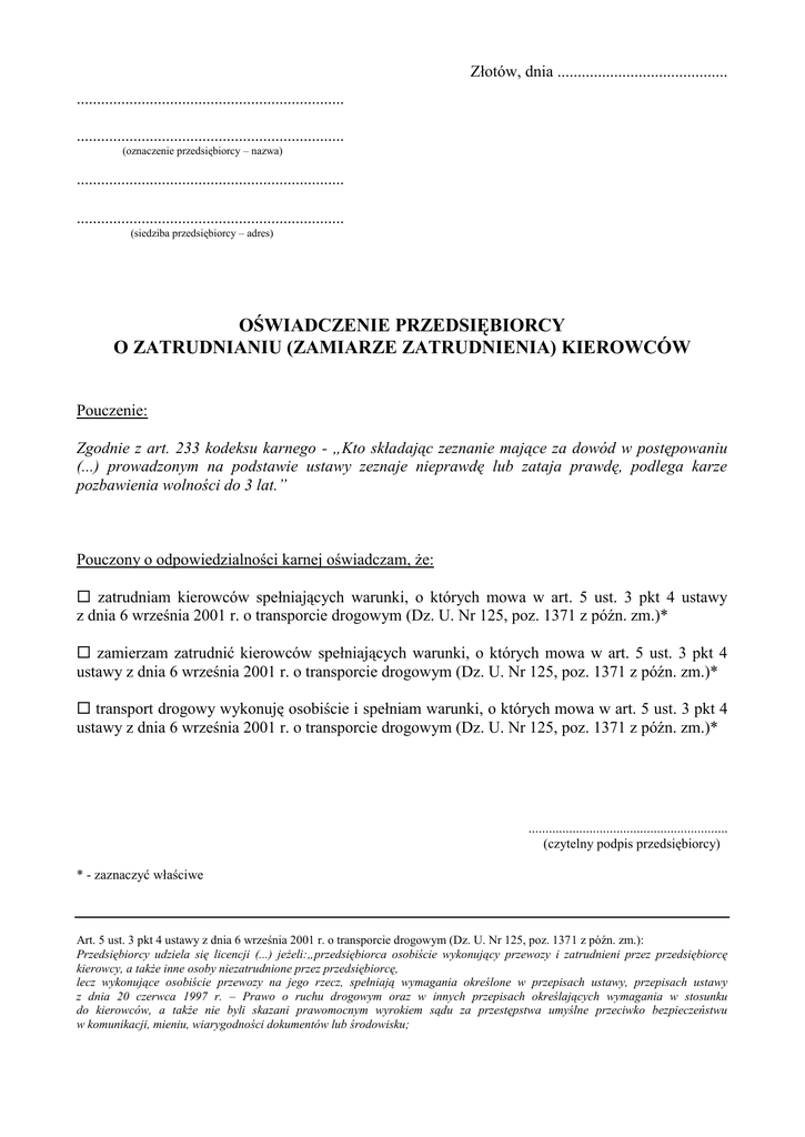Złotów, dnia .......................................... .................................................................. .................................................................. (oznaczenie przedsiębiorcy – nazwa) .................................................................. .................................................................. (siedziba przedsiębiorcy – adres) OŚWIADCZENIE PRZEDSIĘBIORCY O ZATRUDNIANIU (ZAMIARZE ZATRUDNIENIA) KIEROWCÓW Pouczenie: Zgodnie z art. 233 kodeksu karnego - „Kto składając zeznanie mające za dowód w postępowaniu (...) prowadzonym na podstawie ustawy zeznaje nieprawdę lub zataja prawdę, podlega karze pozbawienia wolności do 3 lat.” Pouczony o odpowiedzialności karnej oświadczam, że: zatrudniam kierowców spełniających warunki, o których mowa w art. 5 ust. 3 pkt 4 ustawy z dnia 6 września 2001 r. o transporcie drogowym (Dz. U. Nr 125, poz. 1371 z późn. zm.)* zamierzam zatrudnić kierowców spełniających warunki, o których mowa w art. 5 ust. 3 pkt 4 ustawy z dnia 6 września 2001 r. o transporcie drogowym (Dz. U. Nr 125, poz. 1371 z późn. zm.)* transport drogowy wykonuję osobiście i spełniam warunki, o których mowa w art. 5 ust. 3 pkt 4 ustawy z dnia 6 września 2001 r. o transporcie drogowym (Dz. U. Nr 125, poz. 1371 z późn. zm.)* ........................................................... (czytelny podpis przedsiębiorcy) * - zaznaczyć właściwe Art. 5 ust. 3 pkt 4 ustawy z dnia 6 września 2001 r. o transporcie drogowym (Dz. U. Nr 125, poz. 1371 z późn. zm.): Przedsiębiorcy udziela się licencji (...) jeżeli:„przedsiębiorca osobiście wykonujący przewozy i zatrudnieni przez przedsiębiorcę kierowcy, a także inne osoby niezatrudnione przez przedsiębiorcę, lecz wykonujące osobiście przewozy na jego rzecz, spełniają wymagania określone w przepisach ustawy, przepisach ustawy z dnia 20 czerwca 1997 r. – Prawo o ruchu drogowym oraz w innych przepisach określających wymagania w stosunku do kierowców, a także nie byli skazani prawomocnym wyrokiem sądu za przestępstwa umyślne przeciwko bezpieczeństwu w komunikacji, mieniu, wiarygodności dokumentów lub środowisku;
