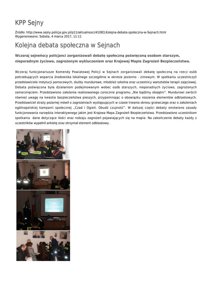 KPP Sejny Źródło: http://www.sejny.policja.gov.pl/p11/aktualnosci/41083,Kolejna-debata-spoleczna-w-Sejnach.html Wygenerowano: Sobota, 4 marca 2017, 11:11 Kolejna debata społeczna w Sejnach Wczoraj sejneńscy policjanci zorganizowali debatę społeczną poświęconą osobom starszym, nieporadnym życiowo, zagrożonym wykluczeniem oraz Krajowej Mapie Zagrożeń Bezpieczeństwa. Wczoraj funkcjonariusze Komendy Powiatowej Policji w Sejnach zorganizowali debatę społeczną na rzecz osób potrzebujących wsparcia środowiska lokalnego szczególnie w okresie jesienno - zimowym. W spotkaniu uczestniczyli przedstawiciele instytucji pomocowych, służby mundurowe, młodzież szkolna oraz uczestnicy warsztatów terapii zajęciowej. Debata poświęcona była działaniom podejmowanym wobec osób starszych, nieporadnych życiowo, zagrożonych zamarznięciem. Przedstawiono założenia realizowanego corocznie programu „Nie bądźmy obojętni”. Mundurowi zwrócili również uwagę na kwestie bezpieczeństwa pieszych, przypominając o obowiązku noszenia elementów odblaskowych. Przedstawiciel straży pożarnej mówił o zagrożeniach występujących w czasie trwania okresu grzewczego oraz o założeniach ogólnopolskiej kampanii społecznej „Czad i Ogień. Obudź czujność”. W dalszej części debaty omówiono zasady funkcjonowania narzędzia interaktywnego jakim jest Krajowa Mapa Zagrożeń Bezpieczeństwa. Przedstawiono uczestnikom spotkania dane dotyczące ilości oraz rodzaju zagrożeń pojawiających się na mapie. Na zakończenie debaty każdy z uczestników wypełnił ankietę oraz otrzymał element odblaskowy. Ocena: 0/5 (0) Tweetnij