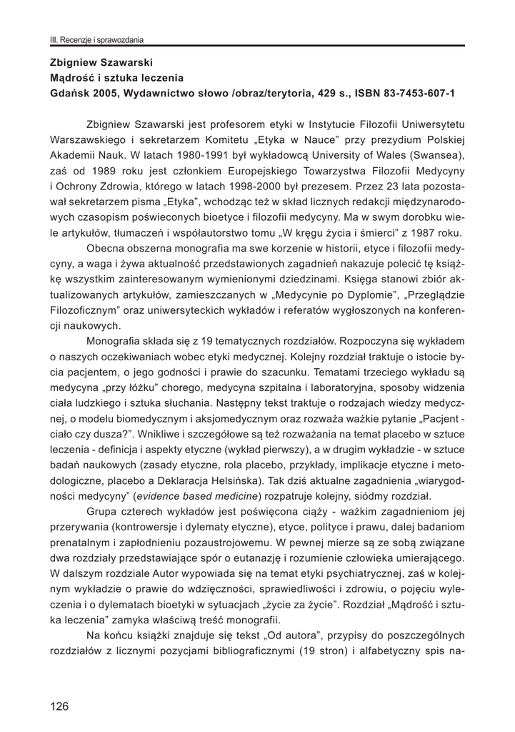 III. Recenzje i sprawozdania Zbigniew Szawarski Mądrość i sztuka leczenia Gdańsk 2005, Wydawnictwo słowo /obraz/terytoria, 429 s., ISBN 83-7453-607-1 Zbigniew Szawarski jest profesorem etyki w Instytucie Filozofii Uniwersytetu Warszawskiego i sekretarzem Komitetu „Etyka w Nauce” przy prezydium Polskiej Akademii Nauk. W latach 1980-1991 był wykładowcą University of Wales (Swansea), zaś od 1989 roku jest członkiem Europejskiego Towarzystwa Filozofii Medycyny i Ochrony Zdrowia, którego w latach 1998-2000 był prezesem. Przez 23 lata pozostawał sekretarzem pisma „Etyka”, wchodząc też w skład licznych redakcji międzynarodowych czasopism poświeconych bioetyce i filozofii medycyny. Ma w swym dorobku wiele artykułów, tłumaczeń i współautorstwo tomu „W kręgu życia i śmierci” z 1987 roku. Obecna obszerna monografia ma swe korzenie w historii, etyce i filozofii medycyny, a waga i żywa aktualność przedstawionych zagadnień nakazuje polecić tę książkę wszystkim zainteresowanym wymienionymi dziedzinami. Księga stanowi zbiór aktualizowanych artykułów, zamieszczanych w „Medycynie po Dyplomie”, „Przeglądzie Filozoficznym” oraz uniwersyteckich wykładów i referatów wygłoszonych na konferencji naukowych. Monografia składa się z 19 tematycznych rozdziałów. Rozpoczyna się wykładem o naszych oczekiwaniach wobec etyki medycznej. Kolejny rozdział traktuje o istocie bycia pacjentem, o jego godności i prawie do szacunku. Tematami trzeciego wykładu są medycyna „przy łóżku” chorego, medycyna szpitalna i laboratoryjna, sposoby widzenia ciała ludzkiego i sztuka słuchania. Następny tekst traktuje o rodzajach wiedzy medycznej, o modelu biomedycznym i aksjomedycznym oraz rozważa ważkie pytanie „Pacjent ciało czy dusza?”. Wnikliwe i szczegółowe są też rozważania na temat placebo w sztuce leczenia - definicja i aspekty etyczne (wykład pierwszy), a w drugim wykładzie - w sztuce badań naukowych (zasady etyczne, rola placebo, przykłady, implikacje etyczne i metodologiczne, placebo a Deklaracja Helsińska). Tak dziś aktualne zagadnienia „wiarygodności medycyny” (evidence based medicine) rozpatruje kolejny, siódmy rozdział. Grupa czterech wykładów jest poświęcona ciąży - ważkim zagadnieniom jej przerywania (kontrowersje i dylematy etyczne), etyce, polityce i prawu, dalej badaniom prenatalnym i zapłodnieniu pozaustrojowemu. W pewnej mierze są ze sobą związane dwa rozdziały przedstawiające spór o eutanazję i rozumienie człowieka umierającego. W dalszym rozdziale Autor wypowiada się na temat etyki psychiatrycznej, zaś w kolejnym wykładzie o prawie do wdzięczności, sprawiedliwości i zdrowiu, o pojęciu wyleczenia i o dylematach bioetyki w sytuacjach „życie za życie”. Rozdział „Mądrość i sztuka leczenia” zamyka właściwą treść monografii. Na końcu książki znajduje się tekst „Od autora”, przypisy do poszczególnych rozdziałów z licznymi pozycjami bibliograficznymi (19 stron) i alfabetyczny spis na- 126 III. Recenzje i sprawozdania zwisk. Dyspozycja tekstu, krój i zróżnicowanie czcionki oraz kremowy papier ułatwiają poznanie i przyswojenie treści. Książkę zdobi estetyczna kartonowa okładka barwy zielonej z białymi i czarnymi napisami oraz dwoma zakładkami. Na ostatniej stronie są podane inne pozycje serii „Biblioteki Filozofii i Historii Filozofii”, z której pochodzi obecna monografia oraz krótkie informacje o Autorze i jego zwięzła wypowiedź. Henryk Gaertner - Kraków 127