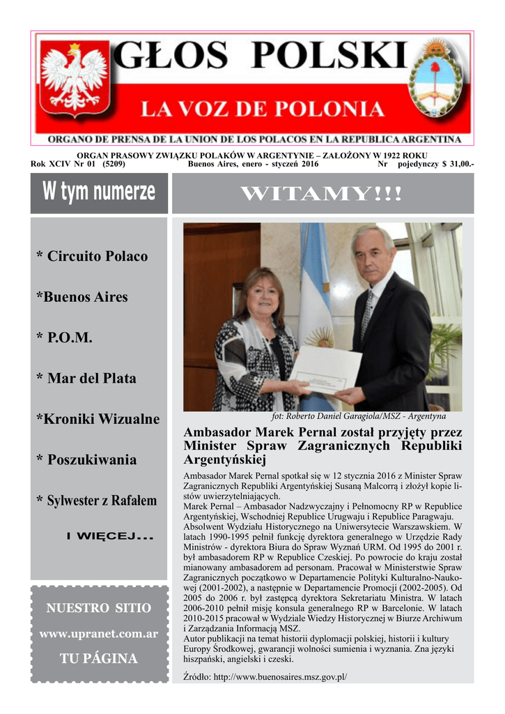 ORGAN PRASOWY ZWIĄZKU POLAKÓW W ARGENTYNIE – ZAŁOŻONY W 1922 ROKU Rok XCIV Nr 01 (5209) Buenos Aires, enero - styczeń 2016 Nr pojedynczy $ 31,00.- W tym numerze WITAMY!!! * Circuito Polaco *Buenos Aires * P.O.M. * Mar del Plata *Kroniki Wizualne * Poszukiwania * Sylwester z Rafałem i więcej... NUESTRO SITIO www.upranet.com.ar TU PÁGINA fot: Roberto Daniel Garagiola/MSZ - Argentyna Ambasador Marek Pernal został przyjęty przez Minister Spraw Zagranicznych Republiki Argentyńskiej Ambasador Marek Pernal spotkał się w 12 stycznia 2016 z Minister Spraw Zagranicznych Republiki Argentyńskiej Susaną Malcorrą i złożył kopie listów uwierzytelniających. Marek Pernal – Ambasador Nadzwyczajny i Pełnomocny RP w Republice Argentyńskiej, Wschodniej Republice Urugwaju i Republice Paragwaju. Absolwent Wydziału Historycznego na Uniwersytecie Warszawskiem. W latach 1990-1995 pełnił funkcję dyrektora generalnego w Urzędzie Rady Ministrów - dyrektora Biura do Spraw Wyznań URM. Od 1995 do 2001 r. był ambasadorem RP w Republice Czeskiej. Po powrocie do kraju został mianowany ambasadorem ad personam. Pracował w Ministerstwie Spraw Zagranicznych początkowo w Departamencie Polityki Kulturalno-Naukowej (2001-2002), a następnie w Departamencie Promocji (2002-2005). Od 2005 do 2006 r. był zastępcą dyrektora Sekretariatu Ministra. W latach 2006-2010 pełnił misję konsula generalnego RP w Barcelonie. W latach 2010-2015 pracował w Wydziale Wiedzy Historycznej w Biurze Archiwum i Zarządzania Informacją MSZ. Autor publikacji na temat historii dyplomacji polskiej, historii i kultury Europy Środkowej, gwarancji wolności sumienia i wyznania. Zna języki hiszpański, angielski i czeski. źródło: http://www.buenosaires.msz.gov.pl/ Str. 2 Głos Polski Buenos Aires, Nr 01 / 2016 (5209) Fot. http://wikitravel.org/ ESK - Europejska Stolica Kultury Wrocław przystąpił do konkursu o tytuł Europejskiej Stolicy Kultury 2016, gdyż ma do opowiedzenia historię… Historię niezwykłą, tragiczną i ciekawą. Po latach świetności i rozwoju nastąpiła katastrofa o niewyobrażalnej wręcz skali. Z II wojny światowej miasto wyszło doszczętnie zrujnowane – i materialnie, i duchowo. Straciło swoich mieszkańców, tych, którzy tworzyli jego wielkość przez pokolenia. Przyszli nowi. Przestraszeni, niepewni jutra, obcy. Zlepieni z wielu rejonów powojennego kraju latami budowali nową tożsamość, tworzyli swoją kulturę. Wiele wody upłynęło w Odrze, zanim uznaliśmy pozostawioną tu spuściznę niemiecką, żydowską i polską za jedną. Za swoją. Minęło wiele czasu, ale udało się. Dziś z dumą możemy powiedzieć, że nie zapominając o dokonaniach naszych poprzedników, zbudowaliśmy nowe Miasto. Szanując ich samych, odmienność i wielokulturowość, historię, stworzyliśmy otwarty Wrocław, z niezwykle interesującą kulturą, z aspiracjami, Wrocław nowoczesny i ciekawy. Nadszedł czas, aby zaprezentować go światu, pokazać to, co nam samym wydaje się warte pokazania i co stanowi ogromny wkład w rozwój Europy. Chcemy opowiedzieć światu o naszej przeszłości i teraźniejszości. O tym, jak na gruzach i ludzkich tragediach wyrasta nowe życie. Będziemy snuć tę opowieść przez cały 2016 rok, bez kompleksów, za to ze świadomością własnej wartości. To będzie ciekawa historia, tego jesteśmy pewni. I mamy nadzieję, że stanie się inspiracją dla tych, którzy się na nią otworzą i z uwagą jej wysłuchają. Rok 2016 jest czasem i przestrzenią do rozmowy o metamorfozie kultury – minionej, obecnej i przyszłej. Czeka nas święto. Będziemy je celebrować po ośmiu latach ciekawej i pasjonującej pracy. Nasze działania rozpoczęte w roku 2008 umożliwiają współtworzenie kultury, która jest bliżej ludzi, jest bardziej dostępna i dotyka wielu sfer życia. Chcemy dowieść, że cywilizacja nie rozwija się bez kultury. Wrocław 2016 tworzy otwarte, dynamiczne i przyjazne przestrzenie, służące zaspokojeniu pragnienia obcowania z kulturą i sztuką dla piękna. Uczestniczymy w skomplikowanym procesie, w któ- rym ważne są zarówno same działania, jak i ich od biór, bo właśnie dzięki opiniom możemy krystalizować program. Korzystamy z wielu wzorców – zarówno z dziedzictwa kulturowego, dziedzictwa wielokulturowości i otwartości, jak i świadomości innowacji i potrzeby zrównoważonego rozwoju. Ten proces przeobraża miasto, pokazuje, że każda aktywność jest możliwa. Przeobraża nas samych, staje się inwestycją w naszą przyszłość. Wrocław 2016 to proces. To różnorodność autonomicznych kuratorów i wielogłosowość środowiska kulturalnego. To budowanie programu i możliwość uczestniczenia w nim. To wreszcie rozmaitość sposobów rozumienia kultury i podjęcie wspólnego wysiłku rozwoju przez nią. Długofalowe cele Europejskiej Stolicy Kultury Wrocław 2016 Dostęp do kultury i uczestnictwo Dążymy do tego, aby: • Mieszkańcy współtworzyli kulturę i mogli bez ograniczeń korzystać z jej różnorodności. • Mieli łatwiejszy dostęp do programów kulturalnych i edukacyjnych. • Powstała, została dostrzeżona, stworzona, opowiedziana lub odnaleziona przestrzeń publiczna przyjazna aktywnościom społecznym, kształtująca postawy prospołeczne i obywatelskie. Kultura i rozwój Dążymy do tego, aby: • Miasto rozwijało się z kulturą i przez kulturę. Europejska różnorodność kulturowa była chętniej akcentowana w działaniach sektora kultury. • Organizacje z Wrocławia oraz partnerzy z Polski i Europy zacieśnili i rozwijali współpracę w przestrzeni kulturalnej. • Twórcy kultury we Wrocławiu chętniej ze sobą współpracowali i wymieniali się doświadczeniami. Sektor kultury pozyskiwał świetnie wykwalifikowanych profesjonalistów, przygotowanych do prowadzenia lokalnych i międzynarodowych, tradycyjnych i innowacyjnych projektów kulturalnych, aktywnie wspierając rozwój prze