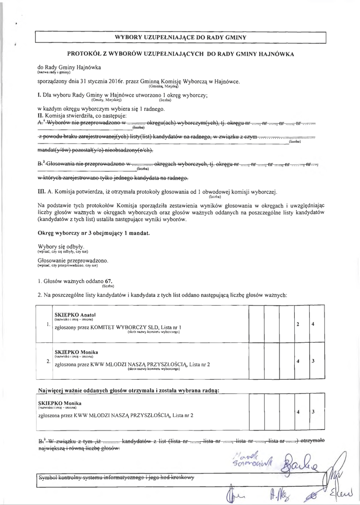 WYBORY UZUPEŁNIAJĄCE DO RADY GMINY PROTOKÓŁ Z WYBORÓW UZUPEŁNIAJĄCYCH DO RADY GMINY HAJNÓWKA do Rady Gminy Hajnówka (nazwa rady i gminy) sporządzony dnia 31 stycznia 2016r. przez Gminną Komisję W yborczą w Hajnówce. (Gminną, Miejską) I. Dla wyboru Rady Gminy w Hajnówce utworzono 1 okręg wyborczy; (Gminy, Miejskiej) (liczba) w każdym okręgu wyborczym wybiera się 1 radnego. II. Komisja stwierdziła, co następuje: Arł -W yborównie przeprowadzono w ............ okręgu(ach) wyborczym(ych), tj. okręgu a r , nr , nr z powodu bfaku zarej estrowanej(ych) listy(list) kandydatów na radnego, w związku z c z y m .................. \rtvct7t«7 mand at(y/ów) pozostał(y/o) nieobsadzony(e/ch). Brł Głosowania nie przeprowadzono w .............. okręgach wyborczych, tj. okręgu n r ...... , n r ....., nr .. (liozba) -BFrr^ -nr- w których zarej estrowano tylko j ednego kandydata na radnego. III. A. Komisja potwierdza, iż otrzymała protokoły głosowania od 1 obwodowej komisji wyborczej. (liczba) Na podstawie tych protokołów Komisja sporządziła zestawienia wyników głosowania w okręgach i uwzględniając liczby głosów ważnych w okręgach wyborczych oraz głosów ważnych oddanych na poszczególne listy kandydatów (kandydatów z tych list) ustaliła następujące wyniki wyborów. Okręg wyborczy nr 3 obejmujący 1 mandat. Wybory się odbyły. (wpisać, czy się odbyły, czy nie) Głosowanie przeprowadzono. (wpisać, czy przeprowadzono, czy nie) 1. Głosów ważnych oddano 67. (liczba) 2. Na poszczególne listy kandydatów i kandydata z tych list oddano następującą liczbę głosów ważnych: SKIEPKO Anatol (nazwisko i imię - imiona) 1. zgłoszony przez KOMITET WYBORCZY SLD, Lista nr 1 2 4 4 3 (skrót nazwy komitetu wyborczego) SKIEPKO Monika (nazwisko t imię - imiona) 2. zgłoszona przez KWW MŁODZI NASZĄ PRZYSZŁOŚCIĄ, Lista nr 2 (skrót nazwy komitetu wyborczego) Najwięcej ważnie oddanych głosów otrzymała i została wybrana radną: SKIEPKO Monika (nazwisko i imię - imiona) zgłoszona przez KWW MŁODZI NASZĄ PRZYSZŁOŚCIĄ, Lista nr 2 W związku z tym ,iż ........... kandydatów z list (lista nr ......, lista nr ...... , lista nr największą i równą liczbę głosów: / O Y tU U O I I lU liU O lI iy Ó Y O tc tllU lllr u i u iu lj i J v b v i v i V L iIv ” yV lista n r ....... ) otrzymało /i J ft. i — u li - rfiH n y m ( ^ ) 7r»ct.- ł}(n) k .-i nH yH .y ( k n ) i 2- lic ty n r n a j w i ^ z ą H r y h P g l n s ÓW W w i ę k c z o j liczbie obwodów głosowania radnym(ą) został(a), w wyniku losowania kandydat(ka) z listy^n r ..... w związku z tym, że także liczba obwodów, w której kandydaci uzysk ali największą liczbę głosów była równa:________________________________________ (opis przebiegu losowania) € t4-W związku z tym, iż w okręgu wyborczym- z e stała zarej estrowana tylko j edna lista kandydatów, następujący kandydat uzyskał mandat radnego bez przeprowadzenia głosowania:_________________ &r4 W związku z tym, iż w okręgu wyborczym nie została zarej estrowana żadna lista, wyborów nie przeprowadzono i w ekręgu nr 1 mandat pozostał nieobsadzony. Okręg wyborczy nr 2 obejmujący 1 mandat W ybory............ -.................... —....................... (wpisać, ozy się odbyły, ozy nie) Głosowanie ....................— .....— ..................... ---------------------------- (wpisać, ozy preeprowadzonor-ozy nie) rv.‘,) Adnotacja zarzutów o wniesieniu przez osoby pełniące funkcję mężów zaufania uwag z wymienieniem konkretnych jeżeli nie ma, wpisać „brak zarzutów” lub „brak osób pełniących funkcję mężów zaufania” : brak osób pełniących funkcję mężów zaufania V. “ > Adnotacje o wniesieniu przez członków Komisji uwag z wymienieniem konkretnych zarzutów’*^; jeżeli nie ma, wpisać „brak zarzutów”: brak zarzutów VI. *** Inne uwagi; jeżeli nie ma, wpisać „brak uwag” : brak uwag Przy sporządzeniu protokołu obecni byli: g(mŁo 1) Barbara Golonko - Przewodnicząca Komisji (nazwisko i imię — imiona, funkcja w Komisji) 2) 3) 4) 5) 6) 7) (podpis) Anna Pucinik - Zastępca Przewodniczącego Alina Niewiadomska - członek Ewa Edyta Jancewicz - członek Emilia Iwaniuk - członek Marek Samociuk - członek Grzegorz Paweł Kublik - członek .... j ............... ...EćtócŁ....................... i tu c& .......................................................... ... 3. Załączniki: Zestawienia wyników głosowania z 1 okręgu wyborczego. (liczba) Protokół(y) obsadze nia mandatów bez głosowania z ............ okręgu(ów) wyborczego(ych). (liczba) Wypełnia się Wypełnia się Wypełnia się Wypełnia się # ę^fzlL ......................................... w razie nieprzeprowadzenia wyborów w którymkolwiek z okręgów wyborczych. w sytuacji, o której mowa w art. 380 Kodeksu wyborczego. tylko w sytuacjach, o których mowa w art. 443 § 2 Kodeksu wyborczego. tylko w sytuacjach, o których mowa w art. 434 § 2 Kodeksu wyborczego.