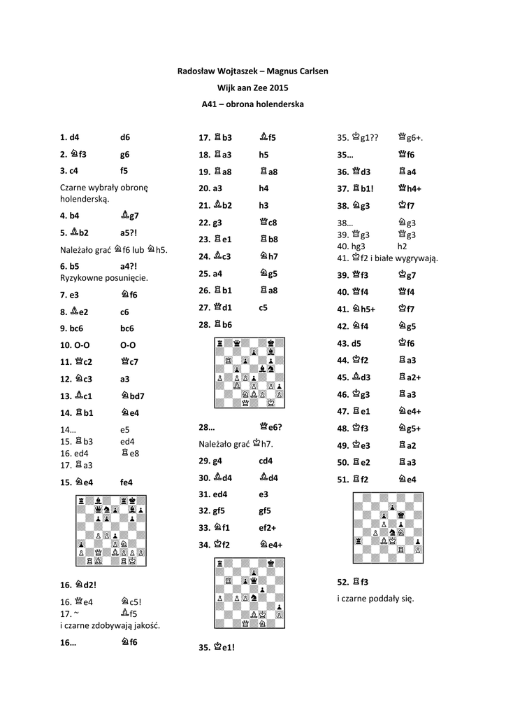Radosław Wojtaszek – Magnus Carlsen Wijk aan Zee 2015 A41 – obrona holenderska 1. d4 d6 17. sb3 cf5 35. lg1?? rg6+. 2. if3 g6 18. sa3 h5 35… rf6 3. c4 f5 19. sa8 sa8 36. rd3 sa4 20. a3 h4 37. sb1! rh4+ 21. cb2 h3 38. ig3 lf7 22. g3 rc8 23. se1 sb8 24. cc3 ih7 38… ig3 39. rg3 rg3 40. hg3 h2 41. lf2 i białe wygrywają. 25. a4 ig5 39. rf3 lg7 26. sb1 sa8 40. rf4 rf4 c5 41. ih5+ lf7 42. if4 ig5 43. d5 lf6 44. lf2 sa3 45. cd3 sa2+ 46. lg3 sa3 47. se1 ie4+ 48. lf3 ig5+ Należało grać lh7. 49. le3 sa2 29. g4 cd4 50. se2 sa3 30. cd4 cd4 51. sf2 ie4 31. ed4 e3 32. gf5 gf5 33. if1 ef2+ 34. lf2 ie4+ Czarne wybrały obronę holenderską. 4. b4 cg7 5. cb2 a5?! Należało grać if6 lub ih5. 6. b5 a4?! Ryzykowne posunięcie. 7. e3 if6 8. ce2 c6 27. rd1 9. bc6 bc6 28. sb6 10. O-O O-O 11. rc2 rc7 12. ic3 a3 13. cc1 ibd7 14. sb1 ie4 14… 15. sb3 16. ed4 17. sa3 e5 ed4 se8 15. ie4 fe4 !)........*! !0u,o,|Um,]! !0,|XkP|Op]! !0|,pP|,p,]! !0,|,|,|,|]! !0|,qQp,|,]! !0P|,|Qi,|]! !0q,r,cQqQ]! !0,sC|,sL|]! !\````````^! 16. id2! 16. re4 ic5! 17. ~ cf5 i czarne zdobywają jakość. 16… if6 !)........*! !0u,x,|,m,]! !0,|,|P|O|]! !0|S|P|,p,]! !0,|P|,oK|]! !0q,qQp,|,]! !0,|C|Q|Qp]! !0|,|IcQ|Q]! !0,|,r,|L|]! !\````````^! 28… re6? !)........*! !0u,|,|,m,]! !0,|,|P|,|]! !0|S|Px,|,]! !0,|,|,p,|]! !0q,qQk,|,]! !0,|,|,|,p]! !0|,|,cL|Q]! !0,|,r,i,|]! !\````````^! 35. le1! !)........*! !0|,|,|,|,]! !0,|,|P|,|]! !0|,|P|M|,]! !0,|,q,p,|]! !0|,q,kI|,]! !0U|,cL|,p]! !0|,|,|S|Q]! !0,|,|,|,|]! !\````````^! 52. sf3 i czarne poddały się.