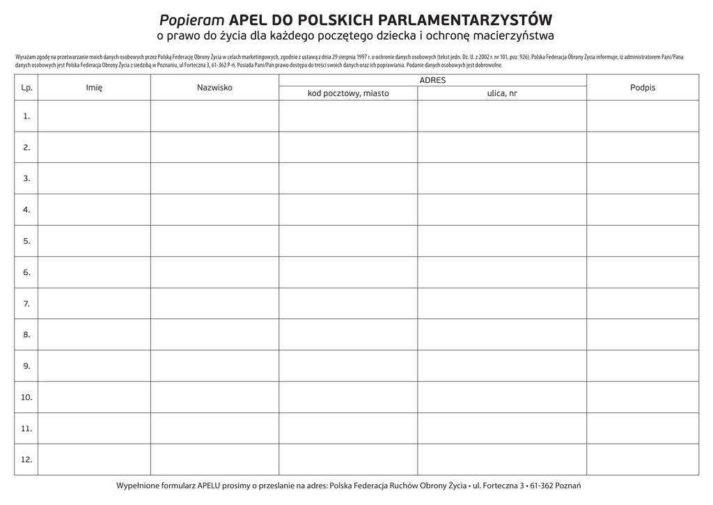 Popieram APEL DO POLSKICH PARLAMENTARZYSTÓW o prawo do życia dla każdego poczętego dziecka i ochronę macierzyństwa Wyrażam zgodę na przetwarzanie moich danych osobowych przez Polską Federację Obrony Życia w celach marketingowych, zgodnie z ustawą z dnia 29 sierpnia 1997 r. o ochronie danych osobowych (tekst jedn. Dz. U. z 2002 r. nr 101, poz. 926). Polska Federacja Obrony Życia informuje, iż administratorem Pani/Pana danych osobowych jest Polska Federacja Obrony Życia z siedzibą w Poznaniu, ul Forteczna 3, 61-362 P-ń. Posiada Pani/Pan prawo dostępu do treści swoich danych oraz ich poprawiania. Podanie danych osobowych jest dobrowolne. Lp. Imię Nazwisko ADRES kod pocztowy, miasto ulica, nr 1. 2. 3. 4. 5. 6. 7. 8. 9. 10. 11. 12. Wypełnione formularz APELU prosimy o przeslanie na adres: Polska Federacja Ruchów Obrony Życia • ul. Forteczna 3 • 61-362 Poznań Podpis