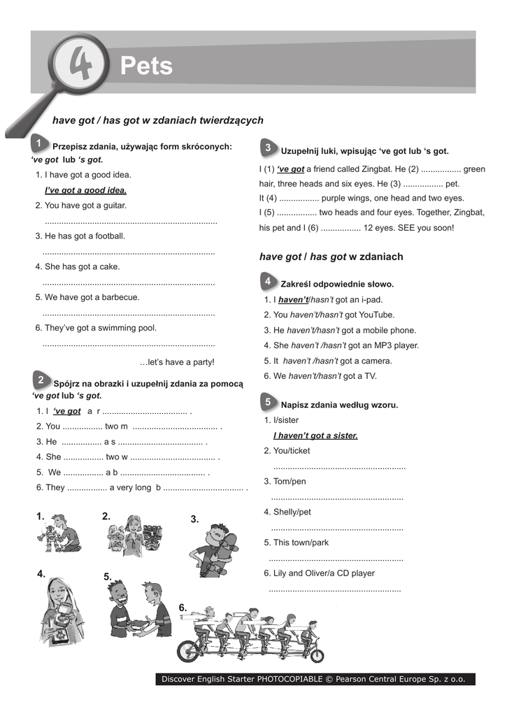 4 Pets have got/has got have got / has got w zdaniach twierdzących 1 Przepisz zdania, używając form skróconych: ‘ve got lub ‘s got. 1. I have got a good idea. I (1) ‘ve got a friend called Zingbat. He (2) ................. green hair, three heads and six eyes. He (3) ................. pet. I’ve got a good idea. It (4) ................. purple wings, one head and two eyes. 2. You have got a guitar. ......................................................................... 3. He has got a football. ......................................................................... 4. She has got a cake. ......................................................................... 5. We have got a barbecue. I (5) ................. two heads and four eyes. Together, Zingbat, his pet and I (6) ................. 12 eyes. SEE you soon! have got / has got w zdaniach 4 Zakreśl odpowiednie słowo. 1. I haven’t/hasn’t got an i-pad. ......................................................................... 6. They’ve got a swimming pool. 2. You haven’t/hasn’t got YouTube. 3. He haven’t/hasn’t got a mobile phone. ......................................................................... …let’s have a party! 2 Spójrz na obrazki i uzupełnij zdania za pomocą ‘ve got lub ‘s got. 1. I ‘ve got a r .................................... . 2. You ................. two m .................................... . 3. He ................. a s .................................... . 4. She ................. two w .................................... . 5. We ................. a b .................................... . 6. They ................. a very long b .................................. . 1. 3 Uzupełnij luki, wpisując ‘ve got lub ‘s got. 2. 3. 4. She haven’t /hasn’t got an MP3 player. 5. It haven’t /hasn’t got a camera. 6. We haven’t/hasn’t got a TV. 5 Napisz zdania według wzoru. 1. I/sister I haven’t got a sister. 2. You/ticket ........................................................ 3. Tom/pen ........................................................ 4. Shelly/pet ........................................................ 5. This town/park ......................................................... 4. 6. Lily and Oliver/a CD player 5. ........................................................ 6. Discover English Starter PHOTOCOPIABLE © Pearson Central Europe Sp. z o.o. 4 have got / has got w zdaniach pytających 6 Dopasuj odpowiedzi do pytań. 1. Have you got time for a cup of tea? D 2. Has she got a brother? ........... 3. Have we got a nice classroom? ........... 4. Have they got birds in the pet shop? ........... 5. Has he got a new computer game? ........... 6. Has this sandwich got cheese in it? ........... A. Yes, it has. This one has got ham, too. B. Yes, they have. They are small and they sing. 9 Napisz zdania twierdzące (R), przeczące (Q) lub pytające (?), używając skróconych form have got. Pamiętaj, że zdanie rozpoczynamy wielką literą. 1. my phone/camera R My phone’s got a camera 2. Ruby’s cat/a tail C. No, she hasn’t. She’s got a sister. Q .................................................................................... D. No, I haven’t. I’m late for school. 3. he/a rabbit E. Yes, we have. It’s big and clean. F. No, he hasn’t. It’s an old game. 7 ? .................................................................................... 4. the monster/one big tooth Napisz krótkie odpowiedzi według wskazówek. 1. Has Nina got a baby brother? R .................................................................................... 5. snakes/legs R Yes, she has. 2. Have you got your school books? Q .................................................................................... Q .................................................................................... 6. you/a big mirror in your bedroom 3. Has your dad got a motorbike? R .................................................................................... 4. Have they got a drink? R .................................................................................... ? .................................................................................... 10 Popraw błędy. hasn’t 5. Has your granny got a skateboard? 1. Chloe haven’t got a hamster. Q .................................................................................... 2. Are you got my bag? .................................... 6. Have you and your friend got your bikes today? 3. We haven’t get a shop in our village. .......................... Q .................................................................................... 4. Have you got a pen? 8 Yes, I have got. .................................... 5. We’re got a box of chocolates. .................................... Uzupełnij pytania. 6. Has your mum got a purple car? 1. Have we got a new teacher? No, she’s not. .................................... Yes, we have. He’s English. 2. .............................................. a black cat? No, she hasn’t. She’s got a dog. 3. .............................................. short hair? Yes, he has. It’s short and black. 4. .............................................. nice eyes? Yes, you have. They are a beautiful colour. 5. .............................................. a pet spider? No, I haven’t! I don’t like spiders. 6. .............................................. a boat on the lake? Yes, they have. It is big and white. Discover English Starter PHOTOCOPIABLE © Pearson Central Europe Sp. z o.o.