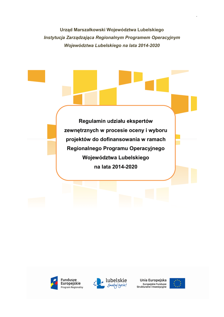 . Urząd Marszałkowski Województwa Lubelskiego Instytucja Zarządzająca Regionalnym Programem Operacyjnym Województwa Lubelskiego na lata 2014-2020 Regulamin udziału ekspertów zewnętrznych w procesie oceny i wyboru projektów do dofinansowania w ramach Regionalnego Programu Operacyjnego Województwa Lubelskiego na lata 2014-2020 WYKAZ SKRÓTÓW: DW EFRR DW EFS DZ RPO IOK IP IZ RPO KPA LAWP RPO WL UMWL WUP ZWL Departament Wdrażania Europejskiego Funduszu Rozwoju Regionalnego Departament Wdrażania Europejskiego Funduszu Społecznego Departament Zarządzania Regionalnym Programem Operacyjnym Instytucja organizująca konkurs tj.: Departament Wdrażania EFRR, Departament Wdrażania EFS, Lubelska Agencja Wspierania Przedsiębiorczości w Lublinie, Wojewódzki Urząd Pracy w Lublinie Instytucja Pośrednicząca w realizacji Regionalnego Programu Operacyjnego Województwa Lubelskiego na lata 2014-2020 Instytucja Zarządzająca Regionalnym Programem Operacyjnym Województwa Lubelskiego na lata 2014-2020 Kodeks Postępowania Administracyjnego Lubelska Agencja Wspierania Przedsiębiorczości w Lublinie Regionalny Program Operacyjny Województwa Lubelskiego na lata 2014-2020 Urząd Marszałkowski Województwa Lubelskiego w Lublinie Wojewódzki Urząd Pracy w Lublinie Zarząd Województwa Lubelskiego UŻYTE W DOKUMENCIE OKREŚLENIA OZNACZAJĄ: Ustawa wdrożeniowa Wykaz Ustawa z dnia 11 lipca 2014 r. o zasadach realizacji programów w zakresie polityki spójności finansowanych w perspektywie finansowej 2014-2020 Wykaz kandydatów na ekspertów (o którym mowa w art. 49 ust. 10 ustawy wdrożeniowej) w ramach Regionalnego Programu Operacyjnego Województwa Lubelskiego na lata 2014-2020 2/14 §1 Postanowienia ogólne 1. W wybór projektów do dofinansowania mogą być zaangażowani eksperci zewnętrzni, o których mowa w art. 49 ustawy z dnia 11 lipca 2014 r. o zasadach realizacji programów w zakresie polityki spójności finansowanych w perspektywie finansowej 2014-2020. 2. Udział ekspertów, o których mowa powyżej, w wyborze projektów do dofinansowania, w tym w ramach procedury odwoławczej, jest w szczególności uzasadniony w sytuacji, gdy niezbędna jest specjalistyczna wiedza w danej dziedzinie lub w sytuacji, gdy liczba projektów zagraża terminowemu dokonaniu oceny wyłącznie przez pracowników właściwej instytucji ogłaszającej konkurs (IOK). 3. Ekspertów do udziału w wyborze projektów do dofinansowania wyznacza właściwa IOK. Zasady pracy ekspertów i ich wynagradzania za udział w ocenie i wyborze projektów do dofinansowania zostaną uregulowane w umowie podpisanej pomiędzy Instytucją Zarządzającą (IZ RPO) Regionalnym Programem Operacyjnym na lata 2014-2020 (RPO WL, Programem) lub Instytucją Pośredniczącą (IP), a kandydatem na eksperta. 4. Udział eksperta w wyborze projektów do dofinansowania oznacza możliwość zaangażowania eksperta we wszelkie czynności związane z wyborem projektów do dofinansowania określone w umowie pomiędzy IZ RPO/IP a ekspertem, począwszy od zgłoszenia projektu do objęcia dofinansowaniem, do jego wybrania do dofinansowania albo odrzucenia. 5. Rola eksperta ma charakter: a) rozstrzygający, co oznacza, że wynik oceny przeprowadzonej przez eksperta, odnośnie spełnienia albo niespełnienia danego kryterium lub przyznania danej liczby punktów, wraz ze sporządzonym uzasadnieniem powyższej oceny, jest wiążący dla IOK, lub b) opiniodawczo-doradczy, co oznacza, że ekspert przedstawia swoją opinię na temat danego projektu lub jego wybranych elementów pracownikom właściwej instytucji lub innym ekspertom oceniającym projekt, wraz ze stosownym uzasadnieniem lub przekazuje rady lub rekomendacje w odniesieniu do sposobu oceny danego projektu lub wybranych aspektów związanych z oceną danego projektu, pracownikom właściwej instytucji lub innym ekspertom oceniającym projekt. Opinia, rada lub rekomendacje nie mają charakteru wiążącego. Niezależnie od charakteru roli eksperta wynik oceny projektu i jego uzasadnienie są formułowane na wyłączną odpowiedzialność IOK i są jej stanowiskiem. 6. IOK może zlecić ekspertowi ocenę lub wystąpić o wyrażenie opinii na temat określonego zakresu projektu np. jego części finansowej. Ocenę/wyrażenie opinii w zakresie pozostałych elementów projektu IOK może zlecić innemu ekspertowi lub w przypadku trybu pozakonkursowego innym osobom. 7. Status eksperta uzyskuje kandydat na eksperta, z którym IZ RPO/IP zawarła umowę dotyczącą udziału w wyborze projektów. 3/14 §2 Wykaz kandydatów na ekspertów 1. Zarząd Województwa Lubelskiego (ZWL), jako IZ RPO, poprzez opracowanie jednolitych zasad, zapewnia funkcjonowanie przejrzystego i konkurencyjnego systemu naboru kandydatów na ekspertów w ramach Programu. 2. Nabór, o którym mowa w ust. 1 prowadzony jest w celu utworzenia „Wykazu kandydatów na ekspertów w ramach Regionalnego Programu Operacyjnego Województwa Lubelskiego na lata 2014-2020” (Wykaz). 3. Wykaz, stanowi listę kandydatów na ekspertów (zwanych dalej kandydatami) mogących brać udział w procesie oceny i wyboru projektów do dofinansowania i specjalizujących się w ocenie/opiniowaniu projektów w ramach dziedzin wymienionych w Załączniku nr 1 do niniejszego Regulaminu pn. „Zestawienie specjalizacji ekspertów biorących udział w ocenie/opiniowaniu projektów w ramach RPO WL 2014 – 2020 oraz wymagań szczegółowych wobec kandydatów na ekspertów” (zwane dalej Zestawieniem). 4. W ramach IZ RPO Wykaz prowadzony jest przez Departament Zarządzania Regionalnym Programem Operacyjnym (DZ RPO) Urzędu Marszałkowskiego Województwa Lubelskiego w Lublinie (UMWL). 5. Z Wykazu korzystają jednostki i podmioty prowadzące ocenę projektów w ramach RPO WL tj.: Departament Wdrażania Europejskiego Funduszu Rozwoju Regionalnego (DW EFRR), Departament Wdrażania Europejskiego Funduszu Społecznego (DW EFS), Lubelska Agencja Wspierania Przedsi