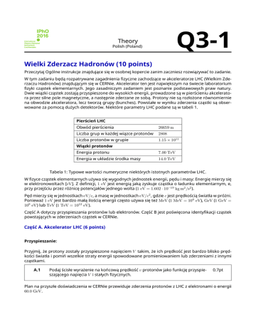 Q3-1 Theory Polish (Poland) Wielki Zderzacz Hadronów (10 points) Przeczytaj Ogólne instrukcje znajdujące się w osobnej kopercie zanim zaczniesz rozwiązywać to zadanie. W tym zadaniu będą rozpatrywane zagadnienia fizyczne zachodzące w akceleratorze LHC (Wielkim Zderzaczu Hadronów) znajdującym się w CERNie. Akcelerator ten jest największym na świecie laboratorium fizyki cząstek elementarnych. Jego zasadniczym zadaniem jest poznanie podstawowych praw natury. Dwie wiązki cząstek zostają przyspieszone do wysokich energii, prowadzone są w pierścieniu akceleratora przez silne pole magnetyczne, a następnie zderzane ze sobą. Protony nie są rozłożone równomiernie na obwodzie akceleratora, lecz tworzą grupy (bunches). Powstałe w wyniku zderzenia cząstki są obserwowane za pomocą dużych detektorów. Niektóre parametry LHC podane są w tabeli 1. Pierścień LHC Obwód pierścienia 26659 m Liczba grup w każdej wiązce protonów 2808 Liczba protonów w grupie 1.15 × 1011 Wiązki protonów Energia protonu 7.00 TeV Energia w układzie środka masy 14.0 TeV Tabela 1: Typowe wartości numeryczne niektórych istotnych parametrów LHC. W fizyce cząstek elementarnych używa się wygodnych jednostek energii, pędu i masy: Energię mierzy się w elektronowoltach [eV]. Z definicji, 1 eV jest energią jaką zyskuje cząstka o ładunku elementarnym, e, przy przejściu przez różnicę potencjałów jednego wolta (1 eV = 1.602 ⋅ 10−19 kg m2 /s2 ). Pęd mierzy się w jednostkach eV/𝑐, a masę w jednostkach eV/𝑐2 , gdzie 𝑐 jest prędkością światła w próżni. Ponieważ 1 eV jest bardzo małą ilością energii często używa się też MeV (1 MeV = 106 eV), GeV (1 GeV = 109 eV) lub TeV (1 TeV = 1012 eV). Część A dotyczy przyspieszania protonów lub elektronów. Część B jest poświęcona identyfikacji cząstek powstających w zderzeniach cząstek w CERNie. Część A. Akcelerator LHC (6 points) Przyspieszanie: Przyjmij, że protony zostały przyspieszone napięciem 𝑉 takim, że ich prędkość jest bardzo blisko prędkości światła i pomiń wszelkie straty energii spowodowane promieniowaniem lub zderzeniami z innymi cząstkami. A.1 Podaj ścisłe wyrażenie na końcową prędkość 𝑣 protonów jako funkcję przyspieszającego napięcia 𝑉 i stałych fizycznych. 0.7pt Plan na przyszłe doświadczenia w CERNie przewiduje zderzenia protonów z LHC z elektronami o energii 60.0 GeV. Theory Polish (Poland) A.2 Q3-2 Dla cząstek o dużej energy i małej masie spoczynkowej względna różnica Δ = (𝑐 − 𝑣)/𝑐 końcowej prędkości 𝑣 i prędkości światła jest bardzo mała. Znajdź odpowiednie przybliżenie pierwszego rzędu na Δ i wyznacz Δ dla elektronów o energii 60.0 GeV używając napięcia przyspieszającego 𝑉 i stałych fizycznych. 0.8pt Teraz wracamy do protonów w LHC. Przyjmij, że rura w której poruszają się cząstki ma kształt okręgu. A.3 Wyprowadź wyrażenie określające pole magnetyczne 𝐵 konieczne do utrzymania kołowego toru wiązki protonów. Wyrażenie powinno zawierać jedynie energię protonów, 𝐸, obwód 𝐿,podstawowe stałe fizyczne i liczby. Możesz użyć odpowiednich przybliżeń jeśli ich efekt jest mniejszy niż dokładność określona przez najmniejszą liczbę cyfr znaczących. Oblicz pole magnetyczne 𝐵 dla protonów o energii 𝐸 = 7.00 TeV, pomijając oddziaływania pomiędzy protonami. 1.0pt Moc promieniowania : Przyspieszane cząstki emitują energię w postaci fal elektromagnetycznych. Moc promieniowania 𝑃rad cząstek z ładunkiem które krążą ze stałą prędkością kątową zależy tylko od przyspieszenia 𝑎, ładunku 𝑞, prędkości światła 𝑐 i przenikalności elektrycznej próżni 𝜀0 . A.4 Znajdź wyrażenie na moc promieniowania 𝑃rad używając analizy wymiarowej. 1.0pt Pełny wzór na moc promieniowania zawiera czynnik 1/(6𝜋); ponadto pełne relatywistyczne wyrażenie 1 zawiera dodatkowy multiplikatywny czynnik 𝛾 4 , gdzie 𝛾 = (1 − 𝑣2 /𝑐2 )− 2 . A.5 Oblicz pełną moc promieniowania 𝑃tot z LHC w przypadku energii protonu 𝐸 = 7.00 TeV (Zwróć uwagę na tabelę 1). Możesz użyć właściwych przybliżeń. 1.0pt Przyspieszanie liniowe: W CERNie spoczywające początkowo protony są przyspieszane w liniowym akceleratorze o długości 𝑑 = 30.0 m różnicą potencjałów 𝑉 = 500 MV. Przyjmij, że pole elektryczne jest jednorodne. Akcelerator liniowy składa się z dwóch płytek naszkicowanych na rysunku 1. A.6 Wyznacz czas 𝑇 w ciągu którego protony przechodzą przez to pole. 1.5pt Theory Polish (Poland) d + V Rysunek 1: Szkic modułu przyspieszającego. Q3-3 Theory Polish (Poland) Q3-4 Część B. Identyfikacja cząstek (4 points) Czas przelotu: Do właściwej interpretacji zderzeń istotna jest identyfikacja wysokoenergetycznych cząstek powstających w zderzeniu. Prosta metoda polega na pomiarze czasu (𝑡) który cząstka znanym pędzie potrzebuje na przebycie odległosci 𝑙 w tak zwanym detektorze czasu przelotu (Time-of-Flight, w skrócie ToF). Typowe cząstki, które są identyfikowane w takim detektorze oraz ich masy są podane w tabeli 2. Cząstka Masa [MeV/c2 ] Deuteron 1876 Proton 938 naładowany Kaon 494 naładowany pion 140 Elektron 0.511 Tabela 2: Cząstki i ich masy. masa m pęd p y x czas t1 długość l czas t2 Rysunek 2: Schematyczny widok detektora czasu przelotu. B.1 Wyznacz masę 𝑚 cząstki poprzez jej pęd 𝑝, odległość 𝑙 i czas przelotu 𝑡 przyjmując, że cząstki o ładunku 𝑒 poruszają się w detektorze ToF z prędkością bliską 𝑐 po linii prostej i poruszają się prostopadle do dwóch płaszczyzn detekcji (patrz rysunek 2). 0.8pt Theory Polish (Poland) B.2 Q3-5 Oblicz najmniejszą długość 𝑙 detektora ToF, która umożliwia bezpieczne rozróżnienie naładowanego kaonu od naładowanego pionu, gdy pędy obu cząstek wynoszą 1.00 GeV/c. Dla dobrego rozróżnienia konieczne 