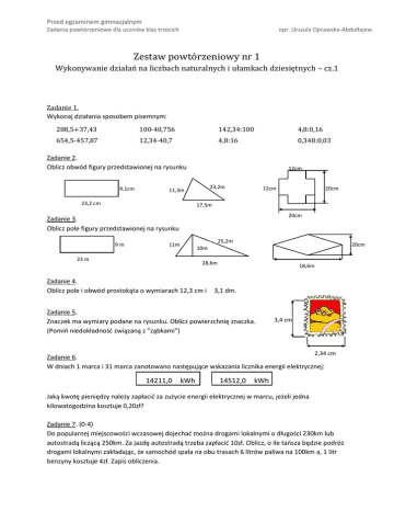 Przed egzaminem gimnazjalnym Zadania powtórzeniowe dla uczniów klas trzecich opr. Urszula Oprawska-Abdułłajew Zestaw powtórzeniowy nr 1 Wykonywanie działań na liczbach naturalnych i ułamkach dziesiętnych – cz.1 Zadanie 1. Wykonaj działania sposobem pisemnym: 288,5+37,43 100·40,756 142,34:100 4,8:0,16 654,5-457,87 12,34·40,7 4,8:16 0,348:0,03 Zadanie 2. Oblicz obwód figury przedstawionej na rysunku 9,1cm 12cm 23,2m 11,3m 23,2 cm 12cm 20cm 17,5m 20cm Zadanie 3. Oblicz pole figury przedstawionej na rysunku 9m 25,2m 11m 20cm 10m 23 m 28,6m Zadanie 4. Oblicz pole i obwód prostokąta o wymiarach 12,3 cm i 18,6m 3,1 dm. Zadanie 5. Znaczek ma wymiary podane na rysunku. Oblicz powierzchnię znaczka. (Pomiń niedokładność związaną z ”ząbkami”) 3,4 cm 2,34 cm Zadanie 6. W dniach 1 marca i 31 marca zanotowano następujące wskazania licznika energii elektrycznej: 14211,0 kWh 14512,0 kWh Jaką kwotę pieniędzy należy zapłacić za zużycie energii elektrycznej w marcu, jeżeli jedna kilowatogodzina kosztuje 0,20zł? Zadanie 7. (0-4) Do popularnej miejscowości wczasowej dojechać można drogami lokalnymi o długości 230km lub autostradą liczącą 250km. Za jazdę autostradą trzeba zapłacić 10zł. Oblicz, o ile tańsza będzie podróż drogami lokalnymi zakładając, że samochód spala na obu trasach 6 litrów paliwa na 100km a, 1 litr benzyny kosztuje 4zł. Zapis obliczenia. Przed egzaminem gimnazjalnym opr. Urszula Oprawska-Abdułłajew Zadania powtórzeniowe dla uczniów klas trzecich Zadanie 8. (0-2) Boisko szkolne jest czworokątem o bokach: 139m, 111m, 125m, 116m. Zostało one ogrodzone siatką. W ogrodzenie wmontowano dwie stalowe bramy każda o szerokości trzech metrów. Ile metrów bieżących siatki zużyto na ogrodzenie boiska? Zapisz obliczenia. Zadanie 9. (0-1) Podczas spaceru po lesie turysta zauważył wiewiórkę, która w sześciu równych skokach pokonała drogę o szerokości 5,3 m. Podaj z dokładnością do jednego miejsca po przecinku średnią długość pojedynczego skoku wiewiórki. A. 0,7 m B. 0,8 m C. 0,9 m D.1,0 m Zadanie 10. (0-1) Za autobus, wynajęty na wycieczkę do lasu, należało zapłacić 276 zł. Jaki był koszt przejazdu dla każdej z 23 wyjeżdżających osób? A. 6,75 zł B. 11,25 zł C. 12 zł D. 72 zł Informacje do zadań 11. i 12. Rysunki przedstawiają wskazania wodomierza w dniach 1 września i 1 października. Zadanie 11. (0-1) Oblicz, zaokrąglając do całości, ile metrów sześciennych wody zużyto od 1 września do 1 października. 3 3 A. 16 m/ 3 B. 17 m/ 3 C. 18 m/ D. 22 m/ Zadanie 12. (0-1) 3 Pierwszego października wodomierz wskazywał 126,205 m/. Jakie będzie wskazanie tego wodomierza po zużyciu kolejnych 10 litrów wody? 3 A. 136,205 m/ 3 B. 127,205 m/ / 3 C. 126,305 m/ / D. 126,215 m 3 Zadanie 13. (0-5) Przyrodnicy musza kupić 49 namiotów. Mają na ten cel 14 000zł. W sklepie znajdują się namioty w dwóch gatunkach. Namioty pierwszego gatunku kosztują 350zł za sztukę, zaś drugiego gatunku 250zł. Jaką największą liczbę namiotów pierwszego gatunku mogą kupić? Zapisz obliczenia. W zestawie wykorzystano materiały opracowane przez OKE