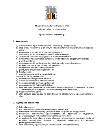 Miejski Dom Kultury w Stalowej Woli ogłasza nabór na stanowisko Specjalista ds. marketingu 1. Wymagania: a) wykształcenie wyższe kierunkowe – marketing i zarządzanie; b) staż pracy co najmniej 5 lat, w tym 3 lata na stanowisku zgodnym z wykształceniem; c) posiadanie kompetencji w zakresie sprzedaży; d) dobra znajomość lokalnego środowiska biznesowego; e) znajomość procedur decyzyjnych w przedsiębiorstwach; f) umiejętność nawiązywania kontaktów oraz budowania długotrwałych relacji z kontrahentami; g) dobra znajomość mediów oraz technik i narzędzi komunikacyjnych; h) umiejętność pracy zespołowej i partnerskiej; i) umiejętność badania i analizy rynków; j) praktyczna znajomość zagadnień PR; k) kreatywność; l) swoboda wypowiedzi w mowie i piśmie; m) znajomość zagadnień CSR; n) umiejętność redagowania tekstów; o) wysokie umiejętności interpersonalne; p) dobra znajomość języka angielskiego; q) dobra znajomość Pakietu MS Office; r) brak skazania prawomocnym wyrokiem sądu za umyślne przestępstwo ścigane z oskarżenia publicznego lub umyślne przestępstwo skarbowe, s) nieposzlakowana opinia; t) stan zdrowia pozwalający na zatrudnienie na określonym w ogłoszeniu stanowisku; 2. Wymagane dokumenty: a) b) c) d) list motywacyjny; CV z dokładnym opisem przebiegu pracy zawodowej; kserokopie świadectw pracy (poświadczone za zgodność z oryginałem), kserokopie dokumentów (poświadczone za zgodność z oryginałem) potwierdzających wykształcenie i kwalifikacje zawodowe; e) oświadczenie kandydata o braku skazania prawomocnym wyrokiem sądu za umyślne przestępstwo ścigane z oskarżenia publicznego lub umyślne przestępstwo skarbowe; f) inne dokumenty o posiadanych kwalifikacjach i umiejętnościach; g) kserokopia dowodu osobistego. 3. Forma i termin składania ofert: Wymagane dokumenty winny być własnoręcznie podpisane i złożone osobiście w sekretariacie Miejskiego Domu Kultury przy ul. 1 Sierpnia 9, 37-450 Stalowa Wola lub przesłane listem poleconym na wskazany adres w zaklejonych kopertach z dopiskiem: „Nabór na wolne stanowisko – Specjalista ds. marketingu”, w nieprzekraczalnym terminie do dnia 25 października 2016 r. do godz. 15.00. Aplikacje, które wpłyną po wyżej określonym terminie (decyduje data stempla pocztowego), nie będą rozpatrywane. Dokumenty aplikacyjne: list motywacyjny, CV powinny być opatrzone klauzulą: Wyrażam zgodę na przetwarzanie moich danych osobowych zawartych w mojej ofercie pracy dla potrzeb niezbędnych do realizacji procesu rekrutacji, zgodnie z ustawą z dnia 29 sierpnia 1997r. o ochronie danych osobowych (t. j. Dz. U. 2016 r. poz. 922). 4. Procedura naboru: 1 etap – sprawdzanie i ocena wymagań formalnych. Zastrzegamy sobie prawo do skontaktowania się jedynie z wybranymi kandydatami w ramach I etapu rekrutacji, 2 etap – rozmowa kwalifikacyjna z wybranymi kandydatami. Nadesłane dokumenty nie będą zwracane. Uprzejmie informujemy, że skontaktujemy się tylko z wybranymi kandydatami. O terminie przeprowadzenia rozmów kwalifikacyjnych wybrani kandydaci będą informowani telefonicznie. Na podstawie art. 24 ust. 1 ustawy o ochronie danych osobowych informujemy, że dane osobowe kandydatów do pracy w Miejskim Domu Kultury, ul. 1 Sierpnia 9, 37-450 Stalowa Wola, uzyskane w procesie rekrutacji lub przesłane poza tym procesem, będą przetwarzane wyłącznie w celu rekrutacji. Podanie danych osobowych jest dobrowolne. Osoba, której dane dotyczą ma prawo dostępu do treści swoich danych oraz prawo ich poprawiania. Niezwłocznie po zakończeniu naboru informacja o jego wyniku zostanie podana do publicznej wiadomości na stronie internetowej www.mdkstalowawola.pl oraz na tablicy ogłoszeń w Miejskim Domu Kultury. Stalowa Wola,12 października 2016 r. Opis stanowiska pracy A. Informacje ogólne dotyczące stanowiska pracy 1. Stanowisko: Specjalista ds. marketingu. 2. Komórka organizacyjna lub samodzielne stanowisko: Dział marketingu i Kino „Wrzos”. B. Wymogi kwalifikacyjne 1. Wykształcenie: wyższe. 2. Wymagany profil wykształcenia: kierunkowy. 3. Znajomość zagadnień szeroko pojętego marketingu. 4. Doświadczenie zawodowe: staż pracy co najmniej 5 lata, w tym 3 lata na stanowisku zgodnym z wykształceniem. 5. Predyspozycje osobowościowe: kreatywność, zdyscyplinowanie, obowiązkowość, odpowiedzialność, wysoka kultura osobista, odporność na stres, opanowanie, umiejętność samodzielnego podejmowania decyzji oraz pracy w zespole. 6. Wysokie umiejętności interpersonalne, umiejętność analitycznego myślenia. 7. Zdolność redagowania tekstów, dobra znajomość programów komputerowych Word, Excel. C. Zakres głównych zadań wykonywanych na stanowisku: 1. Opracowanie i wdrażanie strategii marketingowej instytucji. 2. Kreowanie wizerunku firmy oraz jej produktów. 3. Współtworzenie planów i budżetów marketingowych, reklamowych i promocyjnych. 4. Współpraca z partnerami biznesowymi i promocyjnymi. 5. Sporządzanie i koordynacja ofert sponsorskich. 6. Wyszukiwanie i opracowywanie wniosków dot. pozyskiwania funduszy. 7. Systematyczna analiza rynku i działań konkurencji w powierzonym obszarze. 8. Współpraca z mediami i partnerami w zakresie prowadzonych projektów, 9. Monitoring mediów. 10. Udział w procesie sprzedaży i promocji. 11. Organizacja i dystrybuowanie materiałów promocyjnych i informacyjnych. 12. Koordynowanie pracy współpracowników w ramach prowadzonych projektów. 13. Współpraca z komórkami organizacyjnymi oraz pracownikami zatrudnionymi na innych stanowiskach w zakresie prawidłowego wykonywania zadań służbowych. Stalowa Wola, 12 października 2016 r.