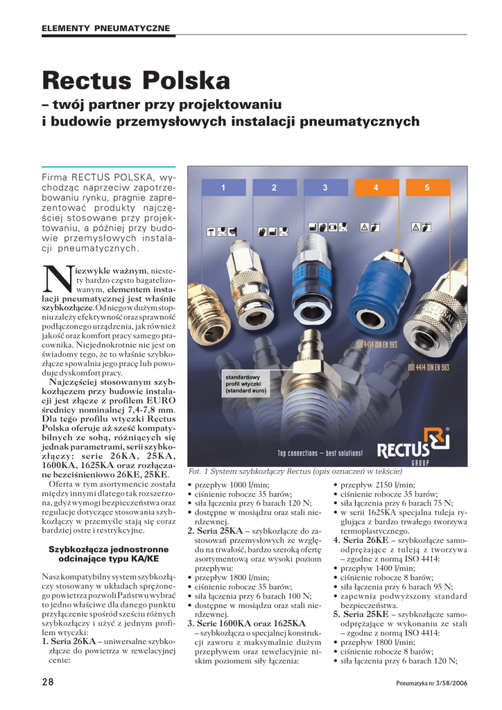 ELEMENTY PNEUMATYCZNE Rectus Polska – twój partner przy projektowaniu i budowie przemys³owych instalacji pneumatycznych Firma RECTUS POLSKA, wychodz¹c naprzeciw zapotrzebowaniu rynku, pragnie zaprezentowaæ produkty najczêœciej stosowane przy projektowaniu, a póŸniej przy budowie przemys³owych instalacji pneumatycznych. N iezwykle wa¿nym, niestety bardzo czêsto bagatelizowanym, elementem instalacji pneumatycznej jest w³aœnie szybkoz³¹cze. Od niego w du¿ym stopniu zale¿y efektywnoœæ oraz sprawnoœæ pod³¹czonego urz¹dzenia, jak równie¿ jakoœæ oraz komfort pracy samego pracownika. Niejednokrotnie nie jest on œwiadomy tego, ¿e to w³aœnie szybkoz³¹cze spowalnia jego pracê lub powoduje dyskomfort pracy. Najczêœciej stosowanym szybkoz³¹czem przy budowie instalacji jest z³¹cze z profilem EURO œrednicy nominalnej 7,4-7,8 mm. Dla tego profilu wtyczki Rectus Polska oferuje a¿ szeœæ kompatybilnych ze sob¹, ró¿ni¹cych siê jednak parametrami, serii szybkoz³¹czy: serie 26KA, 25KA, 1600KA, 1625KA oraz roz³¹czane bezciœnieniowo 26KE, 25KE. Oferta w tym asortymencie zosta³a miêdzy innymi dlatego tak rozszerzona, gdy¿ wymogi bezpieczeñstwa oraz regulacje dotycz¹ce stosowania szybkoz³¹czy w przemyœle staj¹ siê coraz bardziej ostre i restrykcyjne. Szybkoz³¹cza jednostronne odcinaj¹ce typu KA/KE Nasz kompatybilny system szybkoz³¹czy stosowany w uk³adach sprê¿onego powietrza pozwoli Pañstwu wybraæ to jedno w³aœciwe dla danego punktu przy³¹czenie spoœród szeœciu ró¿nych szybkoz³¹czy i u¿yæ z jednym profilem wtyczki: 1. Seria 26KA – uniwersalne szybkoz³¹cze do powietrza w rewelacyjnej cenie: 28 Fot. 1 System szybkoz³¹czy Rectus (opis oznaczeñ w tekœcie) • • • • przep³yw 1000 l/min; ciœnienie robocze 35 barów; si³a ³¹czenia przy 6 barach 120 N; dostêpne w mosi¹dzu oraz stali nierdzewnej. 2. Seria 25KA – szybkoz³¹cze do zastosowañ przemys³owych ze wzglêdu na trwa³oœæ, bardzo szerok¹ ofertê asortymentow¹ oraz wysoki poziom przep³ywu: • przep³yw 1800 l/min; • ciœnienie robocze 35 barów; • si³a ³¹czenia przy 6 barach 100 N; • dostêpne w mosi¹dzu oraz stali nierdzewnej. 3. Serie 1600KA oraz 1625KA – szybkoz³¹cza o specjalnej konstrukcji zaworu z maksymalnie du¿ym przep³ywem oraz rewelacyjnie niskim poziomem si³y ³¹czenia: • • • • przep³yw 2150 l/min; ciœnienie robocze 35 barów; si³a ³¹czenia przy 6 barach 75 N; w serii 1625KA specjalna tuleja rygluj¹ca z bardzo trwa³ego tworzywa termoplastycznego. 4. Seria 26KE – szybkoz³¹cze samoodprê¿aj¹ce z tulej¹ z tworzywa – zgodne z norm¹ ISO 4414: • przep³yw 1400 l/min; • ciœnienie robocze 8 barów; • si³a ³¹czenia przy 6 barach 95 N; • zapewnia podwy¿szony standard bezpieczeñstwa. 5. Seria 25KE – szybkoz³¹cze samoodprê¿aj¹ce w wykonaniu ze stali – zgodne z norm¹ ISO 4414: • przep³yw 1800 l/min; • ciœnienie robocze 8 barów; • si³a ³¹czenia przy 6 barach 120 N; Pneumatyka nr 3/58/2006 ELEMENTY PNEUMATYCZNE • zabezpiecza przed uderzeniem roz³¹czanej wtyczki z szybkoz³¹czem. Stosuj¹c powy¿sze szybkoz³¹cza i dobieraj¹c je zgodnie z potrzebami, sprostacie Pañstwo wysokim wymaganiom stawianym przez producentów i u¿ytkowników maszyn i urz¹dzeñ oraz stale rosn¹cym wymogom dotycz¹cym bezpieczeñstwa. Jednak¿e gdybyœcie Pañstwo stwierdzili, ¿e warto zasiêgn¹æ opinii specjalisty w tej dziedzinie, to pracownicy Rectus Polska dotr¹ we wskazane przez Was miejsce, aby s³u¿yæ swym doœwiadczeniem. Szybkoz³¹cza suchoodcinaj¹ce typu KL Nowoœæ w ofercie Rectus Polska – doskona³e szybkoz³¹cza suchoodcinaj¹ce serii 204KL, 206KL oraz 209KL, stworzone z myœl¹ o zastosowaniu w takich bran¿ach, jak: przemys³ chemiczny, farmaceutyczny, laboratoria, ale równie¿ do wykorzystania we wszelkiego typu uk³adach transportu mediów p³ynnych i gazowych w innych bran¿ach. Nowo zaprojektowane serie szybkoz³¹czy suchoodcinaj¹cych 204KL, 206KL oraz 209KL znacznie przewy¿szaj¹ ³atwoœci¹ ³¹czenia wszystkie inne produkty dostêpne na rynku, a ponadto dziêki ulepszonej konstrukcji zaworu o zminimalizowanej objêtoœci „martwej przestrzeni” szybkoz³¹cza te zapewniaj¹ skuteczn¹ i niezawodn¹ ochronê przed wyciekami oraz nieszczelnoœci¹. Wartoœæ objêtoœci „martwej przestrzeni” wynosi 0,015 ml dla serii 204KL, 0,035 ml dla serii 206KL oraz 0,072 ml dla serii 209KL. Aby lepiej zobrazowaæ Pañstwu po- Fot. 2 Szybkoz³¹cze serii 206 KL Pneumatyka nr 3/58/2006 dane wartoœci, nale¿y dodaæ, i¿ jest to poziom wycieku równy cieniutkiej warstwie medium pozosta³ej po roz³¹czeniu na powierzchni zaworów. Poziom ten jest oczywiœcie bezpoœrednio skorelowany ze œrednicami nominalnymi poszczególnych serii, które wynosz¹ odpowiednio 4, 6 i 9 mm i mog¹ byæ u¿yte w najró¿niejszych obszarach przemys³u, gdzie niejednokrotnie wymagane jest u¿ycie tego samego typu szybkoz³¹cza, lecz o ró¿nych gabarytach oraz wielkoœciach przep³ywu. Ulepszony projekt zaworu umo¿liwi³ równie¿ zredukowanie wymaganej si³y ³¹czenia do absolutnego minimum oraz jednorêczne ³¹czenie i roz³¹czanie szybkoz³¹cza. Dziêki tym cechom codzienna obs³uga jest szybsza i prostsza, a ponadto system mo¿e byæ u¿yty równie¿ w miejscach trudno dostêpnych, gdzie z powodu braku wolnej przestrzeni obs³uga jest bardzo uci¹¿liwa. Aby powy¿sze zalety nowych serii 204KL, 206KL i 209KL mog³y zostaæ w pe³ni wykorzystane, konieczne by³o zaprojektowanie specjalnych, o ergonomicznym kszta³cie, tulejek rygluj¹cych. Dopiero oba udoskonalenia w po³¹czeniu daj¹ pe³n¹ swobodê jednorêcznej obs³ugi. G³adka tuleja rygluj¹ca oraz op³ywowe kszta³ty szybkoz³¹czy daj¹ równie¿ optymaln¹ ochronê przed gromadzeniem siê zabrudzeñ, co z kolei w szczególny sposób czyni je liderem wœród szybkoz³¹czy do zastosowania w tzw. strefach czystych. 