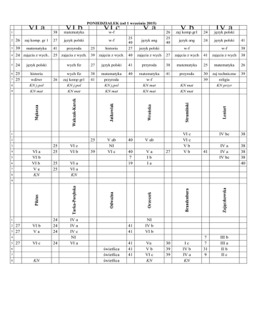 38 matematyka VI b VIw-f c Va w-f 25 40 język ang historia 27 jezyk polski 2 26 zaj komp. gr 1 27 język polski 3 39 matematyka 41 przyroda 4 24 zajęcia z wych.. 25 zajęcia z wych. 39 zajęcia z wych. 40 5 24 język polski wych fiz 27 język polski 6 25 25 historia wych fiz 38 matematyka zaj komp gr1 41 24 język polski 25 40 język ang 24 język polski 41 w-f 38 w-f 41 zajęcia z wych 38 41 przyroda 38 matematyka 25 matematyka 26 40 matematyka 41 przyroda 30 zaj techniczne 39 w-f KN j.pol KN j,pol KN mat KN mat 39 9 KN mat KN mat KN mat KN mat KN mat 1 25 2 3 VI a VI b VI b Va KN 4 5 6 7 8 25 25 VI c VI b 25 25 VI a VI a KN 24 24 24 IV a IV a IV c NI VI a 39 V ab NI VI c 40 V ab 40 7 19 Va Ib Ia 41 41 NI IV b VI b 27 VI c VI c Vb Vb religia KN przyr Strumiński przyroda KN j.pol Wrońska zajęcia z wych Jaśkowiak 27 Walczak-Kurek zajęcia z wych Mąkosza 26 IV a zaj komp gr1 8 7 wdżwr 25 Vb 26 Leniart VI a 1 PONIEDZIAŁEK (od 1 września 2015) IV bc 38 41 IV a IV a IV bc 38 38 38 40 7 7 31 9 III b III a II b II c 1 2 3 27 27 VI b Va 4 5 27 VI c 6 7 8 KN 24 świetlica świetlica świetlica 41 41 41 Va Vb VI c KN Zajączkowska Brandenbura Orzeszek Odważna Piktus Tarka-Porębska 9 30 39 39 Ic IV b IV a KN IV b w-f dz IV c w-f dz 7 IIIew. a 30 IIIew. b II a II b 39 matematyka 7 ew. 30 ew. matematyka 24 język polski 40 ew. 7 ew. 10 ew. 30 ew. zaj z wych 26 zaj z wych w-f 7 religia 10 ew. 31 ew. religia 40 zaj komp 10 ew. 31 gim kor. 31 w-f chł religia KN j.pol 39 KN wyr w-f 19 ew. 9 ew. 19 ew. ew. 9 ew. 19 ew. religia 9 ew. 19 język ang gim kor 9 26 26 30 26 IV c IV b IV a VI b KN 7 7 40 Banaś III a III a III a III a wf 39 39 IV c VI a 39 38 IV a VI c III b III b III b 10 10 10 II a II a II a 30 31 31 II b II b II b 9 9 9 II c wf II c II c II c KN s.10 Wiśniewska Perzyńska-Kotlarska Banasiak Niewiatowska Zaremba 30 30 7 Lesiakowska Vb VI a Kotarski 26 26 Jatczak Tomasik Ogłoza Kaczmarek KN kl. 5 KN kl 5 i 6 religia gim kor Karasiak KN przyr VI b NI IV b IV b Vb Va Ia 8:15 B A S E N przyroda zaj komp dz / wf chł II c 19 19 19 Ia Ia Ia Ib 31 Iew.c 1 9 ew. 31 ew. 2 9 ew. 31 ew. 3 w-f 4 religia 5 w-f 7 język ang 30 6 7 8 Ciupa Swacyna 9 9 9 Ib Ib Ib wf 31 31 31 40 Ic Ic Ic I c wf III b 1 2 3 4 5 6 7 8 9 1 2 3 4 5 6 7 8 WTOREK (od 1 września 2015) VI a VI b VI c Va Vb IV a 1 38 matematyka 27 język polski 26 zaj komp gr1 2 41 przyroda 27 język polski 24 40 język ang 24 40 język ang 3 24 26 41 język ang 24 26 41 język ang 24 26 41 język ang 39 religia 27 język polski 4 24 język polski 30 plastyka 39 matematyka 38 matematyka 27 język polski 25 26 41 5 30 plastyka 27 język polski 39 religia w-f 38 matematyka 24 język polski w-f 38 matematyka 25 zaj techniczne KN j.pol 30 plastyka 26 zaj komp gr1 40 40 40 40 40 4 VI c VI a VI b 5 6 7 1 2 3 4 5 6 7 8 27 27 27 27 27 VI c VI c Vb Vb VI b KN KN 24 24 24 24 VI a IV a IV b KN 4ab 26 26 26 31 VI abc IV abc II c II b wyr. j.ang 19 24 24 25 Ia V ab VI abc IV abc 41 41 IV a VI a Odważna Piktus Tarka-Porębska 8 V ab VI abc IV abc III b III a świetlica Wyr. 5-6 wyr. j.ang język ang KN 4ab j.pol IV bc IV bc IV a Orzeszek 3 w-f Zajączkowska Jaśkowiak Mąkosza 1 2 matematyka KN j.pol Przygotowanie do spr. / wyr. j.ang 8 38 Leniart w-f Strumiński religia przyroda Brandenbura 39 Walczak-Kurek 7 Wrońska 6 41 9 19 39 Ib Ia Va 39 39 39 VI c IV c VI a 10 39 II a II b w-f dz w-f dz 7 ew. 10 religia 26 w-f dz /zaj komp chł w-f dz 25 ew. 10 ew. 38 matematyka 30 zaj techniczne 41 ew. 25 ew. 10 ew. 25 26 41 język ang 25 26 41 język ang 7 ew. ew. w-f S 10 ew. 41 25 zaj techniczne 41 przyroda 7 ew. ew. w-f 31 ew. 24 język polski 39 religia 40 język ang 31 język ang KN 4ab j.pol 30 plastyka Tomasik Karasiak 26 26 30 Va IV b IV c NI IV b VI c KN 7 7 7 KN KN III a III a III a 38 38 VI a IV a 39 VI c 30 30 30 30 30 NI VI b VI a Vb IV c KN plastyka III b III b III b III b w-f S 41 26 IV c IV a 40 10 10 10 II c II a II a II a II a w-f Lesiakowska 7 7 41 39 II c 40 zaj komp religia 7 ew. ew. w-f 7 ew. ew. ew. wf 26 język ang 25 25 25 II c II c II c Banasiak Niewiatowska język ang II b Perzyńska-Kotlarska II a Zaremba 40 Jatczak 25 25 III b Banaś IV b Va Vb VI b przyg. d.s. wol. FOT. Kaczmarek 38 38 38 38 III a Kotarski IV c Ogłoza IV b 41 41 II b w-f II b II b taniec 1-3 taniec 4-6 Ia Ib Ic 19 język ang 9 religia 19 religia 9 ew. 31 ew. 2 19 ew. 9 ew. 31 ew. 3 19 ew. 9 ew. 31 ew. 4 19 ew. 9 ew. ew. w-f S 5 1 Basen 13:30 6 7 Swacyna Ciupa Wiśniewska 8 1 19 19 19 Ia Ia Ia KN KN 9 9 9 9 Ib Ib Ib Ib 31 31 31 Ic Ic Ic I c w-f S KN KN 2 3 4 5 6 7 8 1 2 3 4 5 6 7 8 ŚRODA (od 1 września 2015) VI a VI b 26 zaj komp gr 2 zaj komp gr 2 41 przyroda 38 matematyka w-f 25 historia 27 język polski 1 2 26 3 VI c Va Vb IV a w-f 41 26 30 w-f 27 język polski przyroda 39 26 30 religia 26 zaj komp gr2 język angielski 39 przyroda 4 38 matematyka 27 język polski 25 historia 5 39 40 41 język ang 39 40 41 język ang 39 40 41 język ang 27 język polski 38 matematyka 24 język polski 6 24 język polski 38 matematyka w-f 30 muzyka 25 historia 26 27 40 język ang w-f 30 muzyka Terapia / przygotowanie do sprawdzianu z język angielskiego 8 Przygotowanie do sprawdzianu 9 KN zajęcia sportowe 5 6 7 24 24 24 24 24 24 IV c IV c IV b IV b IV a VI a Piktus Tarka-Porębska 8 1 2 27 3 4 5 27 27 Vb VI c VI b Va 6 7 8 Przyg, do spr. 26 V ab 39 VI abc 26 IV abc 26 VI abc (spr) 41 Koło wokalne Koło teatralne 41 27 27 VI abc IV abc VI abc (spr) IV b VI b Va IV a Leniart Strumiński Wrońska 30 V ab 40 VI abc 40 IV abc 40 VI abc (spr) 40 Koło teatralne 41 41 41 39 KN VI c Vb Vb Zajączkowska 4 25 25 25 25 25 KN koło tea Brandenbura 3 NI VI b VI c IV c Vb IV b Orzeszek 2 Odważna Va Va VI a 1 w-f KN zajęcia sportowe Jaśkowiak Mąkosza Walczak-Kurek 7 język ang 19 39 39 Ia IV b Vb 40 10 9 39 III b II a II c III a IV b IV c III a III b 41 przyroda 24 język polski 39 religia 24 język polski 7 ew. 24 język polski 38 matematyka 7 ew. 40 24 język polski 41 przyroda 7 ew