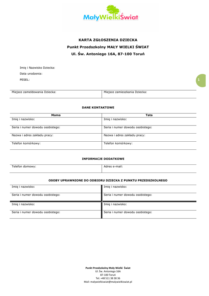 KARTA ZGŁOSZENIA DZIECKA Punkt Przedszkolny MAŁY WIELKI ŚWIAT Ul. Św. Antoniego 16A, 87-100 Toruń Imię i Nazwisko Dziecka: Data urodzenia: 1 PESEL: Miejsce zameldowania Dziecka: Miejsce zamieszkania Dziecka: DANE KONTAKTOWE Mama Tata Imię i nazwisko: Imię i nazwisko: Seria i numer dowodu osobistego: Seria i numer dowodu osobistego: Nazwa i adres zakładu pracy: Nazwa i adres zakładu pracy: Telefon komórkowy: Telefon komórkowy: INFORMACJE DODATKOWE Telefon domowy: Adres e-mail: OSOBY UPRAWNIONE DO ODBIORU DZIECKA Z PUNKTU PRZEDSZKOLNEGO Imię i nazwisko: Imię i nazwisko: Seria i numer dowodu osobistego: Seria i numer dowodu osobistego: Imię i nazwisko: Imię i nazwisko: Seria i numer dowodu osobistego: Seria i numer dowodu osobistego: Punkt Przedszkolny Mały Wielki Świat Ul. Św. Antoniego 16A 87-‐100 Toruń Tel. +48 511 38 38 36 Mail: [email protected] ANKIETA NA TEMAT DZIECKA Czy Dziecko jest na coś uczulone? Czy Dziecko musi przyjmować jakieś leki? Czy Dziecko często choruje? Najczęstsze choroby? Czy dziecko pozostaje pod opieką jakiejś poradni specjalistycznej? Czy Dziecko śpi w dzień? 2 Czy Dziecko jest praworęczne? Czy Dziecko informuje o potrzebach fizjologicznych? Czy Dziecko posiada rodzeństwo? Czy Dziecko nie toleruje jakiegoś pokarmu? Zainteresowania dziecka? Inne ważne informacje na temat Dziecka: Wyrażam zgodę na uczestnictwo mojego Dziecka w spacerach poza terenem Punktu Przedszkolnego TAK/NIE Wyrażam zgodę na fotografowanie mojego Dziecka i umieszczanie zdjęć na stronie Punktu Przedszkolnego TAK/NIE Wyrażam zgodę na przetwarzanie moich danych osobowych w ramach Punktu Przedszkolnego Mały Wielki Świat zgodnie z ustawą o ochronie danych osobowych z dnia 29.08.1997 ( Dz. U. nr 133 poz. 883 z późn zm.) TAK/NIE Oświadczam, że zapoznałam/łem się ze Statutem Punktu Przedszkolnego Mały Wielki Świat w Toruniu, ul. Św. Antoniego 16A i zobowiązuję się do wypełniania jego postanowień. TAK/NIE Data wypełnienia wniosku: Podpis Mamy (czytelnie) Podpis Taty (czytelnie) Punkt Przedszkolny Mały Wielki Świat Ul. Św. Antoniego 16A 87-‐100 Toruń Tel. +48 511 38 38 36 Mail: [email protected]