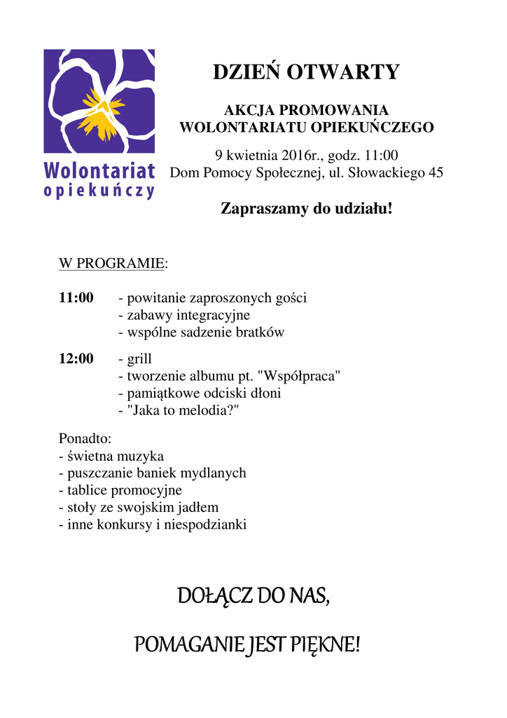 DZIEŃ OTWARTY AKCJA PROMOWANIA WOLONTARIATU OPIEKUŃCZEGO 9 kwietnia 2016r., godz. 11:00 Dom Pomocy Społecznej, ul. Słowackiego 45 Zapraszamy do udziału! W PROGRAMIE: 11:00 - powitanie zaproszonych gości - zabawy integracyjne - wspólne sadzenie bratków 12:00 - grill - tworzenie albumu pt. "Współpraca" - pamiątkowe odciski dłoni - "Jaka to melodia?" Ponadto: - świetna muzyka - puszczanie baniek mydlanych - tablice promocyjne - stoły ze swojskim jadłem - inne konkursy i niespodzianki DOŁĄCZ DOŁĄCZ DO NAS, POMAGANIE JEST PIĘKNE!