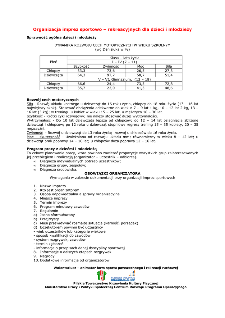 Organizacja imprez sportowo – rekreacyjnych dla dzieci i młodzieŜy Sprawność ogólna dzieci i młodzieŜy DYNAMIKA ROZWOJU CECH MOTORYCZNYCH W WIEKU SZKOLNYM (wg Denisiuka w %) Płeć Chłopcy Dziewczęta Szybkość 33,3 64,3 Chłopcy Dziewczęta 66,6 35,7 Klasa – lata Ŝycia I – IV (7 – 11) Zwinność Moc 73,6 26,5 97,7 58,7 V – VI, Gimnazjum, (12 – 18) 24,4 73,5 23,0 41,3 Siła 27,3 51,4 72,8 48,6 Rozwój cech motorycznych Siła - Rozwój układu kostnego u dziewcząt do 16 roku Ŝycia, chłopcy do 18 roku Ŝycia (13 – 16 lat największy skok). Stosować obciąŜenia adekwatne do wieku: 7 – 9 lat 1 kg, 10 – 12 lat 2 kg, 13 – 16 lat (3 kg); w treningu u kobiet w wieku 15 – 25 lat, u męŜczyzn 18 – 30 lat. Szybkość - Krótki cykl rozwojowy; nie naleŜy stosować duŜej wytrzymałości. Wytrzymałość - Do 10 lat dziewczęta lepsze od chłopców; do 12 – 14 lat osiągnięcia zbliŜone dziewcząt i chłopców; po 12 roku u dziewcząt stopniowy regres; trening 15 – 35 kobiety, 20 – 35 męŜczyźni. Zwinność - Rozwój u dziewcząt do 13 roku Ŝycia; rozwój u chłopców do 16 roku Ŝycia. Moc – skuteczność - UzaleŜniona od rozwoju układu mm; równomierny w wieku 8 – 12 lat; u dziewcząt brak poprawy 14 – 18 lat; u chłopców duŜa poprawa 12 – 16 lat. Program pracy z dziećmi i młodzieŜą To celowe planowanie pracy, które powinno zawierać propozycje wszystkich grup zainteresowanych jej przebiegiem i realizacją (organizator – uczestnik – odbiorca). • Diagnoza indywidualnych potrzeb uczestników; • Diagnoza grupy, zespołów; • Diagnoza środowiska. OBOWIĄZKI ORGANIZATORA Wymagania w zakresie dokumentacji przy organizacji imprez sportowych 1. Nazwa imprezy 2. Kto jest organizatorem 3. Osoba odpowiedzialna a sprawy organizacyjne 4. Miejsce imprezy 5. Termin imprezy 6. Program minutowy zawodów 7. Regulamin a) Jasno sformułowany b) Przejrzysty c) Musi przewidywać rozmaite sytuacje (karność, porządek) d) Egzekutorem powinni być uczestnicy - wiek uczestników lub kategorie wiekowe - sposób kwalifikacji do zawodów - system rozgrywek, zawodów - termin zgłoszeń - informacje o przepisach danej dyscypliny sportowej 8. Informacje o dalszych etapach rozgrywek 9. Nagrody 10. Dodatkowe informacje od organizatorów. Wolontariusz – animator form sportu powszechnego i rekreacji ruchowej Pilskie Towarzystwo Krzewienia Kultury Fizycznej Ministerstwo Pracy i Polityki Społecznej Centrum Rozwoju Programu Operacyjnego PODSTAWOWE WYZNACZNIKI PLANOWANIA Charakter imprezy (zdrowotny, sportowy, rekreacyjny, edukacyjny) Wiek i płeć uczestników ZałoŜenia ogólnego planu pracy Placówka (baza, ilość grup, wyposaŜenie) Miejsce organizacji (nad morzem, jeziorem, w górach…) PROGRAMOWANIE IMPREZY SPORTOWO - REKREACYJNEJ Zainteresowania uczestników (załoŜenia programowe) Kadra (doświadczenie, dodatkowe kwalifikacje, kreatywność) NajbliŜsza okolica (walory turystyczne, przyrodnicze, historyczne, kulturalne, wakacyjne atrakcje) Oczekiwania (rodzice, uczestnicy) OBOWIĄZKI GOSPODARZA IMPREZY 1. 2. a) b) c) 3. a) b) 4. a) b) 5. 6. Informuje organizatora o moŜliwości realizacji w terminie. JeŜeli nie moŜe zorganizować imprezy: Informuje organizatora, Informuje zespoły, zainteresowanych, Proponuje inne formy organizacji imprezy. Informuje opiekunów druŜyn o: Terminie imprezy, Miejscu imprezy. Wyznacza: Sędziów imprezy po konsultacji z organizatorem, Obsługę medyczną. Odpowiada za organizację imprezy na terenie swojej placówki. JeŜeli impreza odbywa się w czasie zajęć edukacyjnych na jej realizację musi wyrazić zgodę dyrektor szkoły. 7. Dokumentuje imprezę. 8. Dostarcza lub informuje o wynikach zawodów w terminie określonych przez organizatora. GRY I ZABAWY RUCHOWE Zabawa ruchowa – prosta forma oparta na ruchach motorycznych człowieka (chód, bieg, skok, rzucanie, pełzanie, czworakowanie) o prostej i nieskomplikowanej budowie. Gra ruchowa – wyŜsza forma zabawy, o większej skali trudności ruchu. Dlaczego są lubiane gry i zabawy ruchowe: - róŜnorodność i swoboda działania, - prostota ruchów, - duŜe moŜliwości rozwiązań, wyborów, - sprawdzenie się wobec rówieśników. TRUDNOŚCI W REALIZACJI IMPREZ DLA DZIECI Potrzeba ciągłej motywacji (I etap edukacyjny). Psychika dziecka wymaga stosowania form krótkich, opowieść ruchowa, naśladowczych, zadaniowych). Wiek dziecka ma wpływ na metodyka doboru gier. Nie stosuje się zabaw skocznych, z przewrotami, z przerzutami. ORGANIZACJA I ZASADY PROWADZENIA DOBÓR ZABAW PROWADZĄCY Skład i liczebność grupy (wiek, zainteresowania, stopień usprawnienia, wydolność). Miejsce zajęć (warunki podłoŜa). Rodzaj i ilość przyborów. Rodzaj i wady postawy (róŜnorodność, przeciwwskazania). Ustawienie ćwiczących Właściwa obserwacja Objaśnienia: Pokaz, Pole ćwiczenia, Wykazanie błędów, Zasady punktacji, Przepisy i błędy, Podsumowanie. PRZYKŁADY OPISU ZABAW Zabawa 1 – toczenie duŜej piłki Na sygnał pierwszy zawodnik toczy piłkę po prostej do półmetka, zawraca i ponownie wykonuje toczenie piłki do linii mety. Chwyta piłkę, obiega druŜynę i przekazuje piłkę drugiej osobie. Koniec zabawy, gdy ostatni zawodnik przekroczy z piłką linię mety. Zabawa 2 – sztafeta z obieganiem Zawodnik trzyma dwie piłki (MPK + MPS), na sygnał biegnie do chorągiewki i obiega ją (o 360*), następnie wykonuje obiegnięcia dwóch kolejnych chorągiewek (o 360*), zawraca na półmetku i slalomem z piłkami wraca do linii startu, przekazując drugiej osobie. Zabawa 3 – slalom z rzutami do celu Uwaga: punktujemy dwa razy – za szybkość wykonania i za ilość zdobytych punktów w rzutach do celu. Na sygnał bieg do kółka, które naleŜy przewrócić na kolor Ŝółty, bieg slalomem między chorągiewkami do kółka hula hop z woreczkami, rzut (1) woreczkiem do celu nad materacem (stoi przy 1 kółku) zasłaniającym kółka hula hop (dw