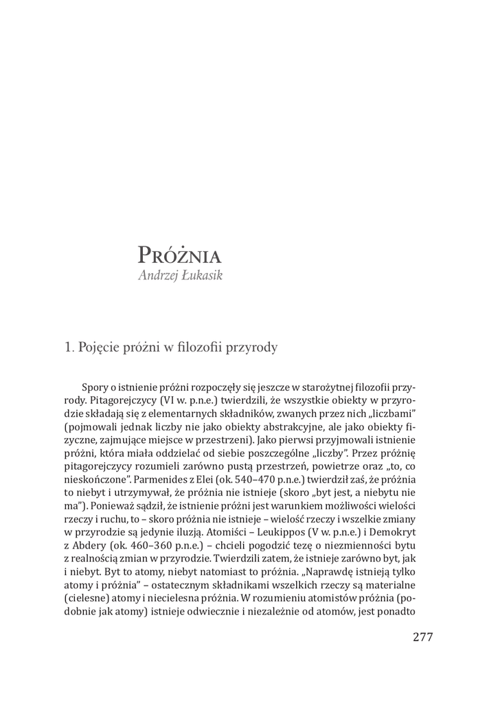 Próżnia Andrzej Łukasik 1. Pojęcie próżni w filozofii przyrody Spory o istnienie próżni rozpoczęły się jeszcze w starożytnej filozofii przyrody. Pitagorejczycy (VI w. p.n.e.) twierdzili, że wszystkie obiekty w przyrodzie składają się z elementarnych składników, zwanych przez nich „liczbami” (pojmowali jednak liczby nie jako obiekty abstrakcyjne, ale jako obiekty fizyczne, zajmujące miejsce w przestrzeni). Jako pierwsi przyjmowali istnienie próżni, która miała oddzielać od siebie poszczególne „liczby”. Przez próżnię pitagorejczycy rozumieli zarówno pustą przestrzeń, powietrze oraz „to, co nieskończone”. Parmenides z Elei (ok. 540–470 p.n.e.) twierdził zaś, że próżnia to niebyt i utrzymywał, że próżnia nie istnieje (skoro „byt jest, a niebytu nie ma”). Ponieważ sądził, że istnienie próżni jest warunkiem możliwości wielości rzeczy i ruchu, to – skoro próżnia nie istnieje – wielość rzeczy i wszelkie zmiany w przyrodzie są jedynie iluzją. Atomiści – Leukippos (V w. p.n.e.) i Demokryt z Abdery (ok. 460–360 p.n.e.) – chcieli pogodzić tezę o niezmienności bytu z realnością zmian w przyrodzie. Twierdzili zatem, że istnieje zarówno byt, jak i niebyt. Byt to atomy, niebyt natomiast to próżnia. „Naprawdę istnieją tylko atomy i próżnia” – ostatecznym składnikami wszelkich rzeczy są materialne (cielesne) atomy i niecielesna próżnia. W rozumieniu atomistów próżnia (podobnie jak atomy) istnieje odwiecznie i niezależnie od atomów, jest ponadto 277 Andrzej Łukasik nieskończona, nieograniczona, ciągła, jednorodna (wszystkie jej punkty są sobie równoważne) i izotropowa (nie posiada wyróżnionego kierunku). Próżnia jest – w odróżnieniu od nieprzenikliwych atomów – całkowicie przenikliwa i nie stawia żadnego oporu poruszającym się atomom. Epikur (341–270 p.n.e.) i Lukrecjusz (Titus Lucretius Carus, ok. 95–55 p.n.e.), zwolennicy teorii atomistycznej, również podzielali pogląd o istnieniu próżni. Generalnie jednak – poza nielicznymi wyjątkami – filozofowie starożytni, głównie pod wpływem Arystotelesa (384–322 p.n.e.), odrzucali tezę o istnieniu próżni. Arystoteles był zwolennikiem poglądu, że materia jest ciągła i potencjalnie można ją dzielić w nieskończoność, a próżnia istnieć nie może. Argumenty przeciwko istnieniu próżni czerpał między innymi ze swojej teorii ruchu ciał: twierdził, że prędkość poruszającego się ciała jest wprost proporcjonalna do „siły poruszającej”, a odwrotnie proporcjonalna do „oporu ośrodka” (zgodnie bowiem z dynamiką Arystotelesa, naturalnym stanem ciał jest spoczynek w „naturalnym miejscu”, a „wszystko, co się porusza, musi być przez coś poruszane”). Utrzymywał więc, że gdyby istniała próżnia, to – jako ośrodek całkowicie przenikliwy – nie stawiałaby żadnego oporu poruszającemu się ciału, a zatem ciało poruszałoby się z prędkością nieskończoną, co jest niemożliwe. Następcy Arystotelesa głosili, że natura boi się próżni (horror vacui), i taki pogląd panował przez całe średniowiecze. Nawet jeszcze Kartezjusz – twórca filozofii mechanicyzmu – odrzucał możliwość istnienia próżni. Twierdził bowiem, że „przestrzeń” to tyle, co „rozciągłość przestrzenna ciał” (materia to rzecz rozciągła, czyli res extensa). Rozciągłość zaś, jako własność materii, nie może istnieć tam, gdzie nie ma materii. Przekonanie, że „natura nie znosi próżni” stało się elementem potocznej świadomości i funkcjonuje w wielu powiedzeniach. U zarania nauki nowożytnej tacy uczeni, jak Giordano Bruno (1548–1600), Pierre Gassendi (1592–1655) czy Galileo Galilei (1564–1642), przyjmowali istnienie próżni, ale pierwsze eksperymentalne dowody istnienia próżni stanowiły dopiero prace ucznia Galileusza, Evangelisty Torricellego (1608–1647). W 1643 r. wykonał on sławne doświadczenie: napełnił szklaną, zasklepioną na jednym końcu rurkę długości około metra rtęcią, a następnie, przytrzymując palcem otwarty koniec rurki, obrócił ją o 180 stopni i zanurzył ją denkiem do góry w naczyniu z rtęcią. Po odblokowaniu otwartego końca część rtęci z rurki wypłynęła do naczynia i pozostał słup rtęci wysokości ok. 76 cm. W przestrzeni pomiędzy powierzchnią rtęci w rurce a jej zasklepionym końcem utworzyła się pusta przestrzeń, zwana dziś „próżnią Torricellego”. Niezależnie od Torricellego doświadczenia dowodzące istnienia próżni wykonywał również włoski zakonnik Valeriano Magni (1586–1661). Główne eksperymenty zostały przeprowadzone w 1647 r. w Polsce na Zamku Królewskim. 278 Próżnia Również w 1647 r. Blaise Pascal (1623–1662) wykonał doświadczenie podobne do doświadczenia Torricellego: na pokładzie statku przycumowanego do nadbrzeża użył kilkunastometrowych szklanych rur, z których jedne były napełnione wodą, inne zaś winem (a zatem substancjami o różnym ciężarze właściwym) i za pomocą odpowiedniego mechanizmu obracał je, podobnie jak to wcześniej uczynił Torricelli, dowodząc istnienia próżni. Pascal wykonał także sławny eksperyment (1647 r.) w Clermot u podnóża góry Puy-de-dôme (1 464 m.n.p.m.), w którym wykazał, że wysokość słupa rtęci w rurce Torricellego jest mniejsza na szczycie wzgórza niż u jego podłoża, a zatem różnica ta zależy wyłącznie od ciśnienia atmosferycznego panującego na różnych wysokościach, a nie od rzekomej „obawy natury przed próżnią”, jak sądzili liczni jeszcze wówczas zwolennicy filozofii przyrody Arystotelesa (trudno bowiem byłoby utrzymywać, że na większych wysokościach natura mniej „boi się” próżni niż u podnóża góry). Otto von Guericke (1602–1686) ok. 1650 r. wynalazł pompę próżniową. W 1657 r. przeprowadził sławny eksperyment z półkulami magdeburskimi: jeże
