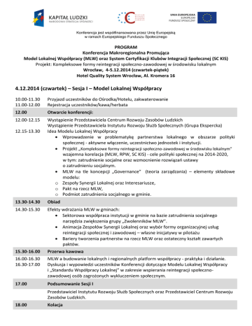 Konferencja jest współfinansowana przez Unię Europejską w ramach Europejskiego Funduszu Społecznego PROGRAM Konferencja Makroregionalna Promująca Model Lokalnej Współpracy (MLW) oraz System Certyfikacji Klubów Integracji Społecznej (SC KIS) Projekt: Kompleksowe formy reintegracji społeczno-zawodowej w środowisku lokalnym Wrocław, 4-5.12.2014 (czwartek-piątek) Hotel Quality System Wrocław, Al. Kromera 16 4.12.2014 (czwartek) – Sesja I – Model Lokalnej Współpracy 10.00-11.30 11.00-12.00 Przyjazd uczestników do Ośrodka/Hotelu, zakwaterowanie Rejestracja uczestników/kawa/herbata 12.00 Otwarcie konferencji: 12.00-12.15 Wystąpienie Przedstawiciela Centrum Rozwoju Zasobów Ludzkich Wystąpienie Przedstawiciela Instytutu Rozwoju Służb Społecznych (Grupa Ekspercka) Idea Modelu Lokalnej Współpracy Wprowadzenie w problematykę partnerstwa lokalnego w obszarze polityki społecznej - aktywne włączenie, uczestnictwo jednostek i instytucji. Projekt „Kompleksowe formy reintegracji społeczno-zawodowej w środowisku lokalnym” wzajemna korelacja (MLW, RPW, SC KIS) - cele polityki społecznej na 2014-2020, w tym: zatrudnienie socjalne oraz wzmocnienie rozwiązań ustawy o zatrudnieniu socjalnym. MLW na tle koncepcji „Governance” (teoria zarządzania) – elementy składowe modelu: o Zespoły Synergii Lokalnej oraz Interesariusze, o Pakt na rzecz MLW, o Podmiot zatrudnienia socjalnego w gminie. 12.15-13.30 13.30-14.30 Obiad 14.30-15.30 Efekty wdrażania MLW w gminach: Sektorowa współpraca instytucji w gminie na bazie zatrudnienia socjalnego narzędzia zwiększenia grupy „Zwolenników MLW”. Animacja Zespołów Synergii Lokalnej oraz wybór formy organizacyjnej usług reintegracji społecznej i zawodowej – własne inicjatywy w pilotażu Bariery tworzenia partnerstw na rzecz MLW oraz ostateczny kształt zawartych paktów. 15.30-16.00 Przerwa kawowa 16.00-16.30 16.30-17.00 MLW a budowanie lokalnych i regionalnych platform współpracy - praktyka i działanie. Dyskusja i wypowiedzi uczestników Konferencji dotyczące Modelu Lokalnej Współpracy i „Standardu Współpracy Lokalnej” w zakresie wspierania reintegracji społecznozawodowej osób zagrożonych wykluczeniem społecznym. 17.00 Podsumowanie Sesji I Przedstawiciel Instytutu Rozwoju Służb Społecznych oraz Przedstawiciel Centrum Rozwoju Zasobów Ludzkich. 18.00 Kolacja Konferencja jest współfinansowana przez Unię Europejską w ramach Europejskiego Funduszu Społecznego 5.12.2014 (piątek) – Sesja II System Certyfikacji Klubów Integracji Społecznej 08.15-09.15 Rejestracja uczestników/kawa/herbata 09.15 Otwarcie Sesji II: 09.15-09.30 Wystąpienie Przedstawiciela Centrum Rozwoju Zasobów Ludzkich Wystąpienie Przedstawiciela Instytutu Rozwoju Służb Społecznych (Grupa Ekspercka) System Certyfikacji Klubów Integracji Społecznej Wprowadzenie w problematykę standaryzacji usług i instytucji pomocy i integracji społecznej – dążenie do profesjonalizacji usług klubów integracji społecznej. Projekt „Kompleksowe formy reintegracji społeczno-zawodowej w środowisku lokalnym” – wzajemna korelacja (MLW, RPW, SC KIS). Minimalny Standard KIS – czemu ma służyć? System SC KIS – główne osie procesu certyfikacji, wytyczne i formularze. Certyfikacja i akredytacja podmiotów zatrudnienia socjalnego - reminiscencje 10-letniego okresu funkcjonowania ustawy o zatrudnieniu socjalnym Efekty pilotażu SCKIS w gminach. Rekomendacje do systemu SCKIS. 09.30-10.30 10.30-11.30 11.30-12.15 Przerwa kawowa 12.15-13.30 Wnioski z pilotażu dotyczące roli i funkcji w Systemie SC KIS takich instytucji jak: Gminy, Ośrodki Pomocy Społecznej. Organizację pozarządowe oraz Wydziały Polityki Społecznej Urzędów Wojewódzkich i Regionalne Ośrodki Polityki Społecznej. 13.30-14.30 Obiad 14.30-14.50 14.50-15.15 System SCKIS – możliwości elektronicznej obsługi systemu. Czy system SCKIS wpisuje się w ideę standardów usług i instytucji pomocy i integracji społecznej. 15.15 Podsumowanie Przedstawiciel Instytutu Rozwoju Służb Społecznych oraz Przedstawiciel Centrum Rozwoju Zasobów Ludzkich.
