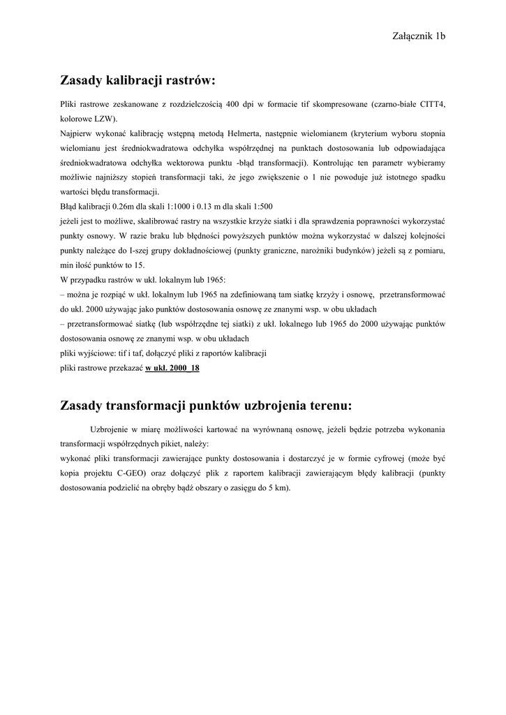 Załącznik 1b Zasady kalibracji rastrów: Pliki rastrowe zeskanowane z rozdzielczością 400 dpi w formacie tif skompresowane (czarno-białe CITT4, kolorowe LZW). Najpierw wykonać kalibrację wstępną metodą Helmerta, następnie wielomianem (kryterium wyboru stopnia wielomianu jest średniokwadratowa odchyłka współrzędnej na punktach dostosowania lub odpowiadająca średniokwadratowa odchyłka wektorowa punktu -błąd transformacji). Kontrolując ten parametr wybieramy możliwie najniższy stopień transformacji taki, że jego zwiększenie o 1 nie powoduje już istotnego spadku wartości błędu transformacji. Błąd kalibracji 0.26m dla skali 1:1000 i 0.13 m dla skali 1:500 jeżeli jest to możliwe, skalibrować rastry na wszystkie krzyże siatki i dla sprawdzenia poprawności wykorzystać punkty osnowy. W razie braku lub błędności powyższych punktów można wykorzystać w dalszej kolejności punkty należące do I-szej grupy dokładnościowej (punkty graniczne, narożniki budynków) jeżeli są z pomiaru, min ilość punktów to 15. W przypadku rastrów w ukł. lokalnym lub 1965: – można je rozpiąć w ukł. lokalnym lub 1965 na zdefiniowaną tam siatkę krzyży i osnowę, przetransformować do ukl. 2000 używając jako punktów dostosowania osnowę ze znanymi wsp. w obu układach – przetransformować siatkę (lub współrzędne tej siatki) z ukł. lokalnego lub 1965 do 2000 używając punktów dostosowania osnowę ze znanymi wsp. w obu układach pliki wyjściowe: tif i taf, dołączyć pliki z raportów kalibracji pliki rastrowe przekazać w ukł. 2000_18 Zasady transformacji punktów uzbrojenia terenu: Uzbrojenie w miarę możliwości kartować na wyrównaną osnowę, jeżeli będzie potrzeba wykonania transformacji współrzędnych pikiet, należy: wykonać pliki transformacji zawierające punkty dostosowania i dostarczyć je w formie cyfrowej (może być kopia projektu C-GEO) oraz dołączyć plik z raportem kalibracji zawierającym błędy kalibracji (punkty dostosowania podzielić na obręby bądź obszary o zasięgu do 5 km). Załącznik 1b Zasady definiowania zasięgów szkiców: W niniejszym zleceniu wprowadzamy obiekty nowe i uaktualniamy obiekty już istniejące. Doprowadzamy istniejące wpisy do niniejszych zasad definiowania obiektów. Brakujące wpisy należy uzupełnić. Szkice wprowadzamy jako: GOSZZG zasięg zasobu geodezyjnego stosując nazewnictwo plików dokumentów: przykład: 113_2_03-XXXX.JPG gdzie: „XXXX” – nr kolejny szkicu W przypadku wykazu współrzędnych do danego szkicu: przykład: 113_2_03-XXXXw.JPG Uzupełnić pola: numer (taki jak zanumerowany w zasobie, jeśli brak numeru to po uzyskaniu z PODGiK przedziału rezerwacji numeracji szkiców z PODGIK nanieść na szkic a następnie zeskanować i dodać do systemu), typ zasobu, numer KERG (bez nazwy ‘KERG’), numer zamówienia (jeżeli jest znany), numer inny (numer na szkicu), rok zamówienia. Przy nadrukowanym na odwrocie wykazie współrzędnych dołączamy go jako drugi plik z nazwą pliku szkicu i dodaną lit. w przykładowe wypełnienie atrybutów: Lp Kod.Nazwa nr 1 GOSZZG 58 2 GOSZZG 1947 3 GOSZZG 903 5 6 GOSZZG GOSZZG 457 921 7 GOSZZG 151 8 GOSZZG 2191 9 GOSZZG 442 10 11 GOSZZG GOSZZG 1936 1958 Typ zasobu Szkic polowy uzbrojenia terenu Inne dokumenty Inne opracowania analogowe Mapy klasyfikacyjne Szkic katastralny Szkic polowy ewidencyjny Szkic polowy ewidencyjny Szkic polowy sytuacyjny (treść obligatoryjna) Zarys katastralny Zarysy pomiarowe KERG nr zam. nr inny Rok zam. 601-2/2003 13200 4(5) 2003 kataster nr.71 karta 4 1904 51/4-4-1/63 Karta 6 1888 51/10-3-3/63 51/4-4-1/63 Arkusz 2 14 1985 1899 Ep. 1350/1992 4 1992 606-16/1997 2 1997 607-23/2002 44 2002 kataster nr.71 4a R3 PKP 4a R3 Arkusz 11 1904 1961 Nie skanujemy wykazu współrzędnych, jeżeli na szkicu elementy mierzone są metodą domiarów. Jeżeli wykaz współrzędnych w ukł. 1965 jest nieaktualny (pomiar tachimetryczny nawiązany na punkty graniczne lub osnowę pomiarową sprzed wyrównania pomiarówki) to należy na takim wykazie napisać, że „współrzędne nieaktualne, na obrębie wyrównano osnowę”, ale dołączyć ten wykaz do nakładki Ośrodek. Przy szkicach z operatów podziałowych przekreślić nieaktualny w 1965 wykaz wsp. i dołączyć wydruk dobrych współrzędnych do operatu. Załącznik 1b Pliki dokumentów. Obowiązuje format JPG dla dokumentów typu szkice i opisy topograficzne. Pliki należy zeskanować w rozdzielczości 300 dpi a wielkość pliku nie może przekraczać 1mb. Zaleca się utrzymywać wielkość pliku w granicach 300-800kb. Skany mają być zrobione STARANNIE, dokładnie obcięte (usuwać/obcinać miejsca spoza treści szkicu – obszary szare, zaczernione, miejsca łączeń zszywaczem itp.) a numer nadany przez wykonawcę należy umieścić w prawym górnym rogu szkicu w kolorze czerwonym. Zabrania się dzielenia dokumentów ze względu na jego format (mapy); jeden dokument – jeden plik. Nazewnictwo plików dokumentów dołączanych do punktów osnowy: przykład: 6-181-12_nr punktu.jpg gdzie: 6-181-12 - przykładowy nr sekcji w ukł. 2000