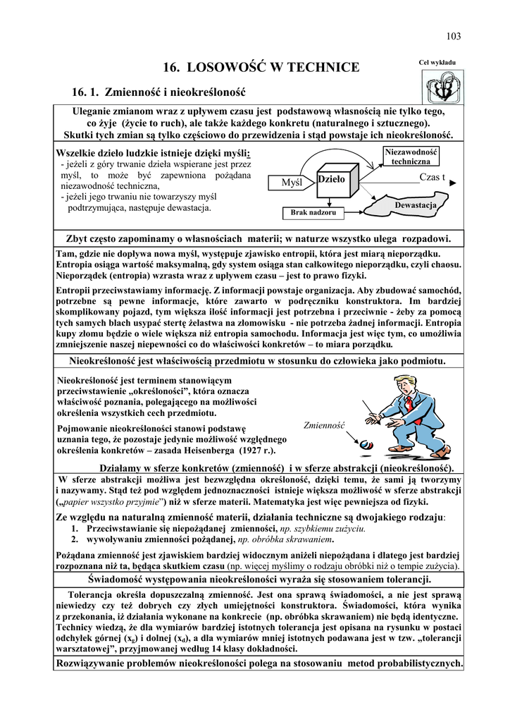 103 16. LOSOWOŚĆ W TECHNICE Cel wykładu 16. 1. Zmienność i nieokreśloność Uleganie zmianom wraz z upływem czasu jest podstawową własnością nie tylko tego, co Ŝyje (Ŝycie to ruch), ale takŜe kaŜdego konkretu (naturalnego i sztucznego). Skutki tych zmian są tylko częściowo do przewidzenia i stąd powstaje ich nieokreśloność. Niezawodność techniczna Wszelkie dzieło ludzkie istnieje dzięki myśli: - jeŜeli z góry trwanie dzieła wspierane jest przez myśl, to moŜe być zapewniona poŜądana niezawodność techniczna, - jeŜeli jego trwaniu nie towarzyszy myśl podtrzymująca, następuje dewastacja. Myśl Dzieło Brak nadzoru Czas t Dewastacja Zbyt często zapominamy o własnościach materii; w naturze wszystko ulega rozpadowi. Tam, gdzie nie dopływa nowa myśl, występuje zjawisko entropii, która jest miarą nieporządku. Entropia osiąga wartość maksymalną, gdy system osiąga stan całkowitego nieporządku, czyli chaosu. Nieporządek (entropia) wzrasta wraz z upływem czasu – jest to prawo fizyki. Entropii przeciwstawiamy informację. Z informacji powstaje organizacja. Aby zbudować samochód, potrzebne są pewne informacje, które zawarto w podręczniku konstruktora. Im bardziej skomplikowany pojazd, tym większa ilość informacji jest potrzebna i przeciwnie - Ŝeby za pomocą tych samych blach usypać stertę Ŝelastwa na złomowisku - nie potrzeba Ŝadnej informacji. Entropia kupy złomu będzie o wiele większa niŜ entropia samochodu. Informacja jest więc tym, co umoŜliwia zmniejszenie naszej niepewności co do właściwości konkretów – to miara porządku. Nieokreśloność jest właściwością przedmiotu w stosunku do człowieka jako podmiotu. Nieokreśloność jest terminem stanowiącym przeciwstawienie „określoności”, która oznacza właściwość poznania, polegającego na moŜliwości określenia wszystkich cech przedmiotu. Pojmowanie nieokreśloności stanowi podstawę uznania tego, Ŝe pozostaje jedynie moŜliwość względnego określenia konkretów – zasada Heisenberga (1927 r.). Zmienność Działamy w sferze konkretów (zmienność) i w sferze abstrakcji (nieokreśloność). W sferze abstrakcji moŜliwa jest bezwzględna określoność, dzięki temu, Ŝe sami ją tworzymy i nazywamy. Stąd teŜ pod względem jednoznaczności istnieje większa moŜliwość w sferze abstrakcji („papier wszystko przyjmie”) niŜ w sferze materii. Matematyka jest więc pewniejsza od fizyki. Ze względu na naturalną zmienność materii, działania techniczne są dwojakiego rodzaju: 1. Przeciwstawianie się niepoŜądanej zmienności, np. szybkiemu zuŜyciu. 2. wywoływaniu zmienności poŜądanej, np. obróbka skrawaniem. PoŜądana zmienność jest zjawiskiem bardziej widocznym aniŜeli niepoŜądana i dlatego jest bardziej rozpoznana niŜ ta, będąca skutkiem czasu (np. więcej myślimy o rodzaju obróbki niŜ o tempie zuŜycia). Świadomość występowania nieokreśloności wyraŜa się stosowaniem tolerancji. Tolerancja określa dopuszczalną zmienność. Jest ona sprawą świadomości, a nie jest sprawą niewiedzy czy teŜ dobrych czy złych umiejętności konstruktora. Świadomości, która wynika z przekonania, iŜ działania wykonane na konkrecie (np. obróbka skrawaniem) nie będą identyczne. Technicy wiedzą, Ŝe dla wymiarów bardziej istotnych tolerancja jest opisana na rysunku w postaci odchyłek górnej (xg) i dolnej (xd), a dla wymiarów mniej istotnych podawana jest w tzw. „tolerancji warsztatowej”, przyjmowanej według 14 klasy dokładności. Rozwiązywanie problemów nieokreśloności polega na stosowaniu metod probabilistycznych. 104 16. 2. Wielkości losowe KaŜdą mierzalną cechę konkretów naleŜy rozpatrywać jako wielkość losową. Z prowadzonych rozwaŜań wynika, Ŝe mamy róŜne kłopoty z poznawaniem i wytwarzaniem konkretów ze względu na ich nieokreśloność. Wynikają one z braku identyczności cech konkretów. Przykładowo weźmy pod uwagę masę 10 pudełeczek zapałek waŜonych łącznie. Wagę ich moŜna określić z duŜą dokładnością; m = 85,6412 g, stąd masa jednego pudełeczka: 85,6412 g/10 = 8,56412 g. W rzeczywistości jednak: - prawdopodobieństwo wykrycia pudełek o identycznej masie jest równe 0, - nie istnieje moŜliwość wykrycia pudełeczek, których masa jest równa wartości 8,56412 g. Im bardziej złoŜony i zmienny jest wyrób, tym więcej występuje czynników losowych, co skłonni jesteśmy przypisywać przypadkowi, a co faktycznie jest wynikiem ograniczeń i niemoŜności naszego poznania na drodze instrumentalnej za pomocą przyrządów. Nieokreśloność unaocznia się wtedy, kiedy za pomocą jakiegokolwiek narzędzia pomiarowego pragniemy wyznaczyć Z główne wymiary konkretu, choćby tego pudełka zapałek (rys.). Stosując zwykłą linijkową miarkę moŜemy orzec, co następuje: Y X = około 80 mm, Y = około 74 mm, Z = około 54 mm X i nie wiemy w istocie rzeczy, jakie są rzeczywiste wymiary. W doświadczeniu tym konkretem jest paczka opakowana w papier (na niewiele przydałby się więc pomiar dokładniejszym narzędziem, np. suwmiarką). Podjęte pomiary innych pudełek umoŜliwiłyby jedynie stwierdzenie, Ŝe: - w zakresie rozpatrywanych wymiarów nie ma dwóch identycznych pudełek, - istnieje zbiór wymiarów jako narzędziowo oszacowanych wielkości losowych. Zatem: Pudełko zapałek Nieokreśloność wyklucza pytanie o rację – bo wobec tego co nieokreślone, nie moŜna zadać Ŝadnego określonego pytania. Natura konkretnych zdarzeń nie jest wynikiem działania złośliwego ducha – cechy losowości dają się rozpoznać. Zbiory wielkości losowych określonych klas konkretów mają bowiem „swoje prawa”. Zbiorem metod umoŜliwiających identyfikacje tych praw jest statystyka matematyczna. Wytwarzanie jest procesem stochastycznym, w którym występują wielkości losowe. Stochastyczny gr . – odgadywać, spodziewać się; Probalistyczny łac. 