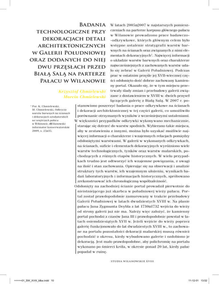 Badania technologiczne przy dekor acjach detali architektonicznych w Galerii południowej or az dodanych do niej dwu przęsłach przed Białą Salą na parterze pałacu w Wilanowie W latach 2005 ± 2007 w najstarszych pomieszczeniach na parterze korpusu głównego pałacu w Wilanowie prowadzono prace badawczo-odkrywkowe, których głównym celem było wstępne ustalenie stratygrafii warstw barwnych na ścianach oraz związanych z nimi elementach dekoracyjnych1. Najwięcej informacji o układzie warstw barwnych oraz charakterze najwcześniejszych z zachowanych warstw udało się zebrać w Galerii Południowej. Podczas prac w ostatnim przęśle jej XVII-wiecznej części odsłonięto dość dobrze zachowany kamienny portal. Okazało się, że w tym miejscu przeKrzysztof Chmielewski trwały ślady zmian i przebudowy galerii zwiąMarcin Chmielewski zane z dostawieniem w XVIII w. dwóch przęseł łączących galerię z Białą Salą. W 2007 r. po1 stanowiono poszerzyć badania o prace odkrywkowe na ścianach Por. K. Chmielewski, M. Chmielewski, Odkrycia i dekoracji architektonicznej w tej części galerii, co umożliwiło warstw barwnych na ścianach porównanie otrzymanych wyników z wcześniejszymi ustaleniami. i dekoracjach sztukatorskich we wnętrzach pałacu W większości przypadków odkrywki wykonywano mechanicznie, w Wilanowie, ¹ Wilanowski starając się dotrzeć do warstw spodnich. Wybierano takie miejsca, informator konserwatorskiº 2009, s. 25 ± 35. aby w zestawieniu z innymi, można było uzyskać możliwie najwięcej informacji o charakterze i wzajemnych relacjach pomiędzy odsłoniętymi warstwami. W galerii w wykonanych odkrywkach, na ścianach, suficie i elementach dekoracyjnych wyróżniono wiele warstw technologicznych, tynków oraz warstw malarskich, pochodzących z różnych etapów historycznych. W wielu przypadkach trudno jest odtworzyć ich wzajemne powiązania, z uwagi na ilość i stan zachowania. Opierając się na obserwacji i analizie struktury tych warstw, ich wzajemnym ułożeniu, wynikach badań laboratoryjnych i informacjach historycznych, spróbowano zrekonstruować ich chronologiczną współzależność. Odsłonięty na zachodniej ścianie portal prowadził pierwotnie do nieistniejącego już skarbca w południowej wieży pałacu. Portal został prawdopodobnie zamurowany w trakcie przebudowy Galerii Południowej w latach dwudziestych XVIII w. Na planie pałacu Jana Zygmunta Deybla z lat 1730 ± 1732 wejścia do wieży od strony galerii już nie ma. Należy więc założyć, że kamienny portal pochodzi z czasów Jana III i prawdopodobnie powstał w latach osiemdziesiątych XVII w. Jeżeli wejście do wieży poprzez galerię funkcjonowało do lat dwudziestych XVIII w., to zachowane na portalu pozostałości dekoracji malarskiej muszą również pochodzić z okresu, kiedy wybudowano galerie i ozdobiono je dekoracją. Jest mało prawdopodobne, aby polichromię na portalu wykonano po śmierci króla, w okresie ponad 20 lat, kiedy pałac popadał w ruinę. S t u di a W il a noWSk ie X V iii +++++01_SW_XVIII_b&w.indd 10 11-12-01 13:52 Elementy portalu zostały wykute z jasnoszarego piaskowca. Powierzchnia kamienia od strony lica została wyrównana, co jest widoczne na fragmentach, które nie zostały częściowo skute. Nadproże z lewej strony, na szerokości wewnętrznej krawędzi węgara, posiada wykuty w kamieniu uskok. Jego powierzchnia łączy się z wykonaną powyżej w narzucie powierzchnią obramienia płyciny biegnącego wzdłuż pilastra. Świadczy to o tym, że wszystkie te elementy powstały w jednym czasie. Po obu stronach progu portalu znaleziono resztki pierwotnej, kamienno-ceramicznej posadzki w ciemnozielonym i ceglastoczerwonym kolorze. Na powierzchni portalu zachowały się fragmenty polichromii. Bezpośrednio na kamiennej powierzchni nadproża, w miejscach odsłoniętych spod zaprawy, widoczne są resztki rysunku wykonanego jasnoróżową farbą, przedstawiającego fragment zarysu malowanej kotary (?). Rysunek ten wykonany został cienkim pędzlem i być może był wstępnym szkicem dekoracji, której ostatecznie zaniechano. Większą część powierzchni nadproża oraz małe fragmenty prawego węgaru pokrywa cienka warstwa wapiennej zaprawy. W wilgotnym tynku odciśnięte zostały równoległe poziome linie, pełniące rolę pomocniczych linii kompozycyjnych. Na zaprawie widnieje fragment malowidła wykonanego w technice fresku i przedstawiającego dekorację architektoniczną w postaci malowanego gzymsu o wyraźnie zróżnicowanych odcieniach różowych barw. Powierzchnia polichromii na portalu łączy się w jednej płaszczyźnie z zachowanym tuż nad nią małym fragmentem malowidła, którego część odsłonięto również w górnej partii ściany pomiędzy pilastrami. Wypełniające płycinę malowidło, którego formy ani treści wskutek prawie całkowitego zniszczenia dzisiaj już nie znamy, pierwotnie wypełniało całą płycinę i stratygraficznie oraz kompozycyjnie łączyło się z malarską dekoracją samego portalu. Cienka warstwa białej sztablatury, którą odsłonięto na ścianie i pilastrze po lewej stronie portalu, również łączy się z warstwą zachowanej na nim polichromii. Na powierzchni sztablatury pokrywającej obramienia płycin i trzony pilastrów znaleziono zniszczoną, ale wyraźną warstwę barwną w kolorze ochry, miejscami z cienką warstwą o czerwonoróżowym, morelowym odcieniu. Odkryte na powierzchni ściany po lewej stronie trzonu pilastra fragmenty siatki kompozycyjnej z numeracją cyfr należy wiązać prawdopodobnie z pierwszymi malowidłami wypełniającymi 11 s. 86 ▸ il. 1 Ściana zachodnia w ostatnim przęśle XVII-wiecznej części Galerii Południowej i fragment ściany północnej w części XVIII-wiecznej B a da ni a t ec h nolo Gicz ne pr z y dekor ac j ac h… +++++01_SW_XVIII_b&w.indd 11 11-12-01 13:52 12 s. 87 ▸ il. 2 Układ warstw chronologicznych górnej części pilastra po lew