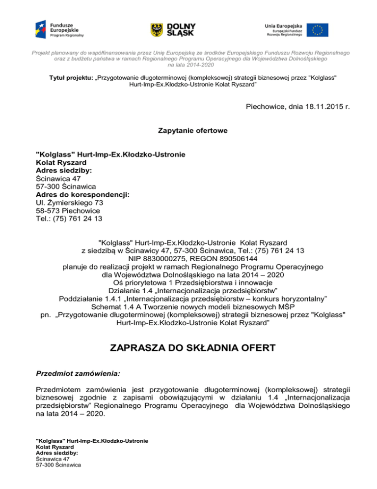 Projekt planowany do współfinansowania przez Unię Europejską ze środków Europejskiego Funduszu Rozwoju Regionalnego oraz z budżetu państwa w ramach Regionalnego Programu Operacyjnego dla Województwa Dolnośląskiego na lata 2014-2020 Tytuł projektu: „Przygotowanie długoterminowej (kompleksowej) strategii biznesowej przez "Kolglass" Hurt-Imp-Ex.Kłodzko-Ustronie Kolat Ryszard” Piechowice, dnia 18.11.2015 r. Zapytanie ofertowe "Kolglass" Hurt-Imp-Ex.Kłodzko-Ustronie Kolat Ryszard Adres siedziby: Ścinawica 47 57-300 Ścinawica Adres do korespondencji: Ul. Żymierskiego 73 58-573 Piechowice Tel.: (75) 761 24 13 "Kolglass" Hurt-Imp-Ex.Kłodzko-Ustronie Kolat Ryszard z siedzibą w Ścinawicy 47, 57-300 Ścinawica, Tel.: (75) 761 24 13 NIP 8830000275, REGON 890506144 planuje do realizacji projekt w ramach Regionalnego Programu Operacyjnego dla Województwa Dolnośląskiego na lata 2014 – 2020 Oś priorytetowa 1 Przedsiębiorstwa i innowacje Działanie 1.4 „Internacjonalizacja przedsiębiorstw” Poddziałanie 1.4.1 „Internacjonalizacja przedsiębiorstw – konkurs horyzontalny” Schemat 1.4 A Tworzenie nowych modeli biznesowych MŚP pn. „Przygotowanie długoterminowej (kompleksowej) strategii biznesowej przez "Kolglass" Hurt-Imp-Ex.Kłodzko-Ustronie Kolat Ryszard” ZAPRASZA DO SKŁADNIA OFERT Przedmiot zamówienia: Przedmiotem zamówienia jest przygotowanie długoterminowej (kompleksowej) strategii biznesowej zgodnie z zapisami obowiązującymi w działaniu 1.4 „Internacjonalizacja przedsiębiorstw” Regionalnego Programu Operacyjnego dla Województwa Dolnośląskiego na lata 2014 – 2020. "Kolglass" Hurt-Imp-Ex.Kłodzko-Ustronie Kolat Ryszard Adres siedziby: Ścinawica 47 57-300 Ścinawica Projekt planowany do współfinansowania przez Unię Europejską ze środków Europejskiego Funduszu Rozwoju Regionalnego oraz z budżetu państwa w ramach Regionalnego Programu Operacyjnego dla Województwa Dolnośląskiego na lata 2014-2020 Tytuł projektu: „Przygotowanie długoterminowej (kompleksowej) strategii biznesowej przez "Kolglass" Hurt-Imp-Ex.Kłodzko-Ustronie Kolat Ryszard” Szczegółowy opis przedmiotu zamówienia: Stworzenie długoterminowej (kompleksowej) strategii biznesowej, mającej na celu pełne wykorzystanie i maksymalizację aktywów przedsiębiorstwa w celu zwiększenia rentowności i uzyskania długoterminowej przewagi konkurencyjnej przedsiębiorstwa. Horyzont czasowy strategii powinien obejmować okres co najmniej 24 miesięce. Zakres merytoryczny strategii biznesowej powinien obejmować co najmniej następujące obszary: 1.Opis produktów / usług przedsiębiorstwa oraz jego aktualnej pozycji na rynku międzynarodowym; 2.Określenie celów strategicznych przedsiębiorstwa w kontekście planowanych działań międzynarodowych; 3.Wybór rynków docelowych działalności eksportowej; 4.Badanie wybranych rynków docelowych; 5.Analiza SWOT dla eksportu każdego rodzaju produktu/usługi na każdym z planowanych rynków docelowych; 6.Stworzenie / rozwój strategii działań międzynarodowych (np. dobór optymalnych sposobów komunikacji w danym kraju zagranicznym; dobór odpowiednich sposobów promocji w danym kraju zagranicznym); 7.Dostosowanie produktu/usługi do wymogów zagranicznych rynków (w tym pomoc prawna, pomoc zagranicznych i krajowych doradców, specjalistów, grafików, agencji reklamowych); 8.Otwieranie nowych kanałów biznesowych, rozbudowa łańcucha dostaw, dywersyfikacja geograficzna i sektorowa; 9.Działania w zakresie nawiązania kontaktów gospodarczych oraz tworzenia lub wzmacniania powiązań sieciowych i kooperacyjnych pomiędzy firmą "Kolglass" a innymi przedsiębiorstwami; 10.Szacowana wielkość kosztów niezbędnych do sfinansowania działań koniecznych do zrealizowania długoterminowej (kompleksowej) strategii biznesowej; 11.Wstępny harmonogram wdrażania długoterminowej (kompleksowej) strategii biznesowej. Uwaga! Warunkiem ważności oferty jest wypełnienie załączonego formularza ofertowego. Wymaga się aby oferty były ważne do 30 kwietnia 2016 roku. Sposób obliczania ceny: Cena zakupu obejmuje cenę jednostkową zamówienia czyli cenę netto, podatek VAT oraz cenę brutto. "Kolglass" Hurt-Imp-Ex.Kłodzko-Ustronie Kolat Ryszard Adres siedziby: Ścinawica 47 57-300 Ścinawica Projekt planowany do współfinansowania przez Unię Europejską ze środków Europejskiego Funduszu Rozwoju Regionalnego oraz z budżetu państwa w ramach Regionalnego Programu Operacyjnego dla Województwa Dolnośląskiego na lata 2014-2020 Tytuł projektu: „Przygotowanie długoterminowej (kompleksowej) strategii biznesowej przez "Kolglass" Hurt-Imp-Ex.Kłodzko-Ustronie Kolat Ryszard” Termin składania ofert: Termin składania ofert rozpoczyna się z dniem 18.11.2015 r. i będą one przyjmowane do dnia 20.11.2015 r. Oferty będą rozpatrywane po 20.11.2015 r. Planowany termin realizacji zamówienia: Całość zamówienia zostanie zrealizowana do 31.12.2016 r. Dopuszcza się możliwość skrócenia czasu realizacji zamówienia. Miejsce wykonania zamówienia Ścinawica 47 57-300 Ścinawica Rodzaje i opis kryteriów mających wpływ na wybór oferty: Przy rozpatrzeniu nadesłanych ofert będziemy kierować się następującymi kryteriami: NAZWA KRYTERIUM Cena WAGA 100% Zamawiający dokona oceny ofert na podstawie wyniku osiągniętej liczby punktów wyliczonych w oparciu o ww. kryterium i ustaloną punktację do 100 pkt. (100% = 100 pkt.): Punkty za kryterium „cena netto” zostaną obliczone wg następującego wzoru: Cena oferty najtańszej ——————————————— x 100 = ilość punktów Cena oferty badanej Za najkorzystniejszą zostanie uznana oferta, która uzyska najwyższą końcową ocenę. Miejsce, sposób i termin składania ofert: "Kolglass" Hurt-Imp-Ex.Kłodzko-Ustronie Kolat Ryszard Adres siedziby: Ścinawica 47 57-300 Ścinawica Projekt planowany do współfinansowania przez Unię Europejską ze środk