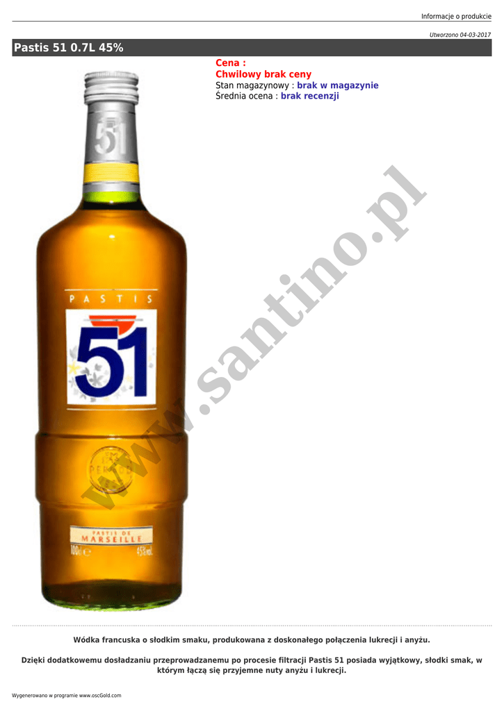 Informacje o produkcie Utworzono 04-03-2017 Pastis 51 0.7L 45% Cena : Chwilowy brak ceny w w w .s an t in o. pl Stan magazynowy : brak w magazynie Średnia ocena : brak recenzji Wódka francuska o słodkim smaku, produkowana z doskonałego połączenia lukrecji i anyżu. Dzięki dodatkowemu dosładzaniu przeprowadzanemu po procesie filtracji Pastis 51 posiada wyjątkowy, słodki smak, w którym łączą się przyjemne nuty anyżu i lukrecji. Wygenerowano w programie www.oscGold.com w w w .s an t in o. pl Pastis 51 doskonale sprawdza się jako aperitif.