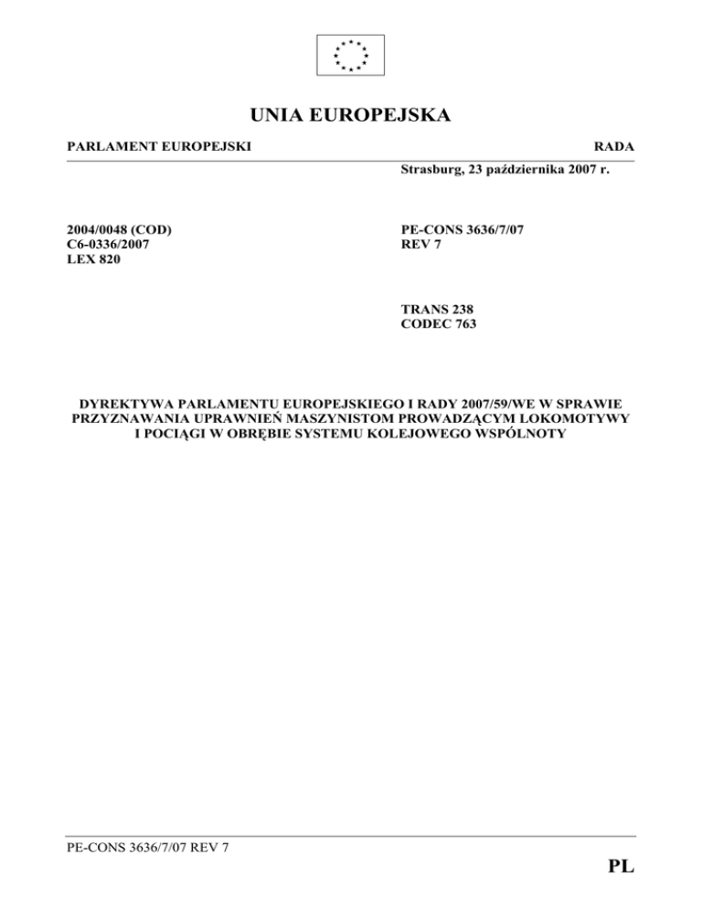 UNIA EUROPEJSKA PARLAMENT EUROPEJSKI RADA Strasburg, 23 października 2007 r. 2004/0048 (COD) C6-0336/2007 LEX 820 PE-CONS 3636/7/07 REV 7 TRANS 238 CODEC 763 DYREKTYWA PARLAMENTU EUROPEJSKIEGO I RADY 2007/59/WE W SPRAWIE PRZYZNAWANIA UPRAWNIEŃ MASZYNISTOM PROWADZĄCYM LOKOMOTYWY I POCIĄGI W OBRĘBIE SYSTEMU KOLEJOWEGO WSPÓLNOTY PE-CONS 3636/7/07 REV 7 PL DYREKTYWA 2007/59/WE PARLAMENTU EUROPEJSKIEGO I RADY z dnia 23 października 2007 r. w sprawie przyznawania uprawnień maszynistom prowadzącym lokomotywy i pociągi w obrębie systemu kolejowego Wspólnoty PARLAMENT EUROPEJSKI I RADA UNII EUROPEJSKIEJ, uwzględniając Traktat ustanawiający Wspólnotę Europejską, w szczególności jego art. 71, uwzględniając wniosek Komisji, uwzględniając opinię Europejskiego Komitetu Ekonomiczno-Społecznego 1 , uwzględniając opinię Komitetu Regionów 2 , stanowiąc zgodnie z procedurą określoną w art. 251 Traktatu, w świetle wspólnego tekstu zatwierdzonego przez komitet pojednawczy w dniu 31 lipca 2007 r. 3 , 1 2 3 Dz.U. C 221 z 8.9.2005, str. 64. Dz.U. C 71 z 22.3.2005, str. 26. Opinia Parlamentu Europejskiego z dnia 28 września 2005 r. (Dz.U. C 227 E z 21.9.2006, str. 464), wspólne stanowisko Rady z dnia 14 września 2006 r. (Dz.U. C 289 E z 28.11.2006, str. 42) . Stanowisko Parlamentu Europejskiego z dnia 18 stycznia 2007 r. (dotychczas nieopublikowane w Dzienniku Urzędowym), rezolucja legislacyjna Parlamentu Europejskiego z dnia 25 września 2007 r. i decyzja Rady z dnia 26 września 2007 r. PE-CONS 3636/7/07 REV 7 1 PL a także mając na uwadze, co następuje: (1) Dyrektywa 2004/49/WE Parlamentu Europejskiego i Rady z dnia 29 kwietnia 2004r. w sprawie bezpieczeństwa kolei wspólnotowej 1 nakłada na zarządców infrastruktury i przedsiębiorstwa kolejowe obowiązek opracowania własnych systemów zarządzania bezpieczeństwem w taki sposób, aby dany system kolejowy był przynajmniej w stanie spełnić wspólne wymagania bezpieczeństwa (CST) i aby system ten odpowiadał krajowym przepisom w zakresie bezpieczeństwa oraz wymogom bezpieczeństwa określonym w technicznych specyfikacjach interoperacyjności (TSI), a także aby zastosowanie znalazły odnośne elementy wspólnych metod oceny bezpieczeństwa (CSM). Powyższe systemy zarządzania bezpieczeństwem przewidują, między innymi, programy i systemy szkolenia pracowników, które zapewniają utrzymanie ich kwalifikacji oraz należyte wykonywanie obowiązków. (2) Dyrektywa 2004/49/WE stanowi, że aby uzyskać dostęp do infrastruktury kolejowej, przedsiębiorstwo kolejowe musi posiadać certyfikat bezpieczeństwa. 1 Dz.U. L 164 z 30.4.2004, str. 44. Wersja sprostowana w Dz.U. L 220 z 21.6.2004, str. 16. PE-CONS 3636/7/07 REV 7 2 PL (3) Na mocy dyrektywy Rady 91/440/EWG z dnia 29 lipca 1991 r. w sprawie rozwoju kolei wspólnotowych 1 , licencjonowanym przedsiębiorstwom kolejowym od dnia 15 marca 2003 r. przysługiwało prawo dostępu do transeuropejskiej sieci towarowej w celu wykonywania międzynarodowych kolejowych przewozów towarowych, a najpóźniej od 2007 r. będzie przysługiwać prawo dostępu do całej sieci w celu wykonywania krajowych i międzynarodowych przewozów towarowych. Nieuchronnym skutkiem tego stopniowego rozszerzania praw dostępu będzie zwiększony przepływ maszynistów pociągów przez granice kraju. W rezultacie wzrastać będzie zapotrzebowanie na maszynistów przeszkolonych i uprawnionych na podstawie świadectwa do prowadzenia pociągów w co najmniej dwóch państwach członkowskich. (4) Badanie wykonane przez Komisję w 2002 roku wykazało, że przepisy państw członkowskich dotyczące warunków przyznawania uprawnień maszynistom pociągów znacznie różnią się między sobą. Aby zniwelować te różnice, powinno się przyjąć wspólnotowe zasady przyznawania uprawnień maszynistom pociągów, przy jednoczesnym utrzymaniu obecnego, wysokiego poziomu bezpieczeństwa systemu kolejowego na terytorium Wspólnoty. (5) Takie wspólnotowe zasady powinny przyczyniać się również do realizacji celów polityki Wspólnoty w zakresie swobody przepływu pracowników, swobody przedsiębiorczości i swobody świadczenia usług w ramach wspólnej polityki transportowej, przy jednoczesnym unikaniu zakłóceń konkurencji. 1 Dz.U. L 237 z 24.8.1991, str. 25. Dyrektywa ostatnio zmieniona dyrektywą 2004/51/WE Parlamentu Europejskiego i Rady (Dz.U. L 164 z 30.4.2004, str. 164). Wersja sprostowana w Dz.U. L 220 z 21.6.2004, str. 58. PE-CONS 3636/7/07 REV 7 3 PL (6) Celem niniejszych wspólnych przepisów powinno być przede wszystkim ułatwienie przepływu maszynistów pociągów pomiędzy państwami członkowskimi oraz ułatwienie ich przepływu pomiędzy przedsiębiorstwami kolejowymi, natomiast w szerszym ujęciu uznawanie licencji oraz ujednoliconego świadectwa uzupełniającego przez wszystkie podmioty sektora kolejowego. W tym celu w niniejszych przepisach powinny zostać określone minimalne wymagania, których spełnienie pozwoli kandydatom na uzyskanie licencji lub ujednoliconego świadectwa uzupełniającego. (7) Niniejsza dyrektywa uzupełnia i wzoruje się w dużym stopniu na historycznej umowie zbiorowej, zawartej między Europejską Federacją Pracowników Transportu (ETF) a Stowarzyszeniem Kolei Europejskich (CER) w sprawie niektórych aspektów warunków pracy pracowników wykonujących pracę w trasie biorących udział w świadczeniu interoperacyjnych usług transgranicznych 1 . (8) Nawet jeżeli dane państwo członkowskie wyłącza z zakresu stosowania niniejszej dyrektywy maszynistów pracujących wyłącznie w ramach systemów, sieci i infrastruktury kolejowej niektórych kategorii, to wyłączenie takie w żaden sposób nie powinno ograniczać obowiązku tego państwa członkowskiego w zakresie uznawania ważności licencji na całym terytorium Unii Europejskiej lub ważności ujednoliconych świadectw uzupełniających – w ramach odnośnej infrastruktury. (9) Wymogi powin