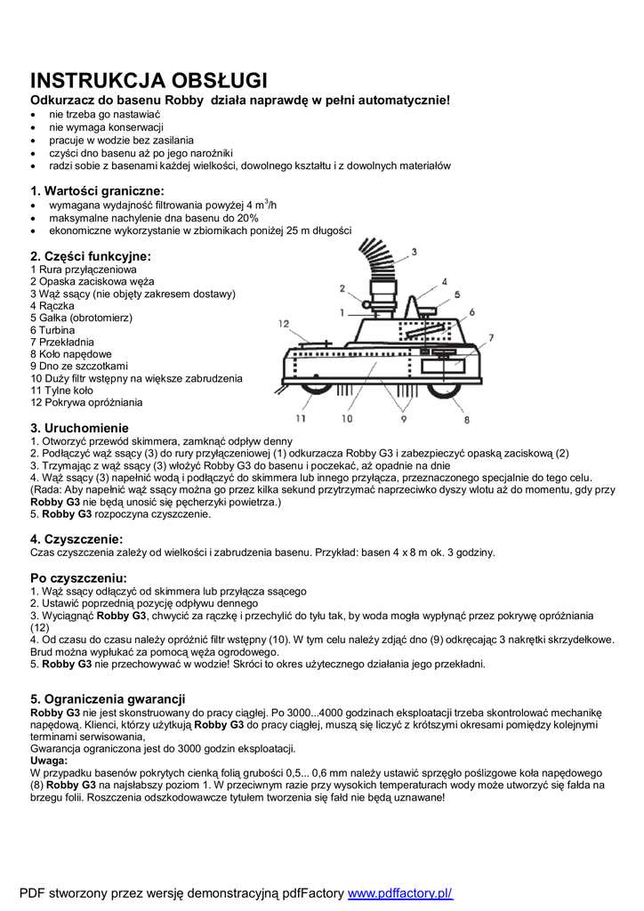 INSTRUKCJA OBSŁUGI Odkurzacz do basenu Robby działa naprawdę w pełni automatycznie! • • • • • nie trzeba go nastawiać nie wymaga konserwacji pracuje w wodzie bez zasilania czyści dno basenu aż po jego narożniki radzi sobie z basenami każdej wielkości, dowolnego kształtu i z dowolnych materiałów 1. Wartości graniczne: • • • wymagana wydajność filtrowania powyżej 4 m 3/h maksymalne nachylenie dna basenu do 20% ekonomiczne wykorzystanie w zbiornikach poniżej 25 m długości 2. Części funkcyjne: 1 Rura przyłączeniowa 2 Opaska zaciskowa węża 3 Wąż ssący (nie objęty zakresem dostawy) 4 Rączka 5 Gałka (obrotomierz) 6 Turbina 7 Przekładnia 8 Koło napędowe 9 Dno ze szczotkami 10 Duży filtr wstępny na większe zabrudzenia 11 Tylne koło 12 Pokrywa opróżniania 3. Uruchomienie 1. Otworzyć przewód skimmera, zamknąć odpływ denny 2. Podłączyć wąż ssący (3) do rury przyłączeniowej (1) odkurzacza Robby G3 i zabezpieczyć opaską zaciskową (2) 3. Trzymając z wąż ssący (3) włożyć Robby G3 do basenu i poczekać, aż opadnie na dnie 4. Wąż ssący (3) napełnić wodą i podłączyć do skimmera lub innego przyłącza, przeznaczonego specjalnie do tego celu. (Rada: Aby napełnić wąż ssący można go przez kilka sekund przytrzymać naprzeciwko dyszy wlotu aż do momentu, gdy przy Robby G3 nie będą unosić się pęcherzyki powietrza.) 5. Robby G3 rozpoczyna czyszczenie. 4. Czyszczenie: Czas czyszczenia zależy od wielkości i zabrudzenia basenu. Przykład: basen 4 x 8 m ok. 3 godziny. Po czyszczeniu: 1. Wąż ssący odłączyć od skimmera lub przyłącza ssącego 2. Ustawić poprzednią pozycję odpływu dennego 3. Wyciągnąć Robby G3, chwycić za rączkę i przechylić do tyłu tak, by woda mogła wypłynąć przez pokrywę opróżniania (12) 4. Od czasu do czasu należy opróżnić filtr wstępny (10). W tym celu należy zdjąć dno (9) odkręcając 3 nakrętki skrzydełkowe. Brud można wypłukać za pomocą węża ogrodowego. 5. Robby G3 nie przechowywać w wodzie! Skróci to okres użytecznego działania jego przekładni. 5. Ograniczenia gwarancji Robby G3 nie jest skonstruowany do pracy ciągłej. Po 3000...4000 godzinach eksploatacji trzeba skontrolować mechanikę napędową. Klienci, którzy użytkują Robby G3 do pracy ciągłej, muszą się liczyć z krótszymi okresami pomiędzy kolejnymi terminami serwisowania, Gwarancja ograniczona jest do 3000 godzin eksploatacji. Uwaga: W przypadku basenów pokrytych cienką folią grubości 0,5... 0,6 mm należy ustawić sprzęgło poślizgowe koła napędowego (8) Robby G3 na najsłabszy poziom 1. W przeciwnym razie przy wysokich temperaturach wody może utworzyć się fałda na brzegu folii. Roszczenia odszkodowawcze tytułem tworzenia się fałd nie będą uznawane! PDF stworzony przez wersję demonstracyjną pdfFactory www.pdffactory.pl/ 6. Szukanie usterek: Jeżeli po dłuższym okresie użytkowania Robby G3 nagle odmówi posłuszeństwa, trzeba będzie sprawdzić wstępnie następujące punkty: Gałka (5) nie obraca się! • Jeżeli daje się obrócić ręką, wówczas zobacz «Wskazówki»! • Jeśli zablokowana, Robby G3 jest uszkodzony. Gałka (5) obraca się, Robby G3 nie posuwa się! • Sprawdzić zazębienie koła zębatego napędu (8). Moduł koła (poz.161) można wymienić na nowy usuwając nakrętki (M 5 ). Robby G3 porusza się tylko po okręgu, po łuku lub prosto! • Robby G3 jest uszkodzony i należy go oddać do naprawy . 7. Wskazówki: Minimalna wydajność ssania dla zapewnienia efektu czyszczenia wynosi 4 m 3/h, co odpowiada 2 obrotom obrotomierza (5) na sekundę. Jeżeli warunek ten nie jest spełniony, należy sprawdzić następujące punkty i je zrealizować: • Czy rzeczywiście zamknięty jest odpływ denny oraz inne równoległe przewody doprowadzające do pompy filtra? • Czy wykonano płukanie zwrotne filtra? • Czy sito łapacza włókien pompy zostało oczyszczone? • Czy wyczyszczono duży filtr wstępny (10) w Robby G3? (patrz punkt 4 «Po czyszczeniu») • Czy wąż ssący jest szczelny? Możliwe sprawdzenie wydajności: Podczas krótkiego zamknięcia przewodu ssącego za pomocą ręki czy piłki tenisowej z dysz nie może wypływać woda. Jeżeli mimo to woda wypływa, oznacza to, że równolegle położone przewody są jeszcze otwarte. 8. Serwis: Poza oczyszczaniem filtra wstępnego (10) Robby G3 nie wymaga konserwacji. W przypadku uszkodzenia Robby G3 (patrz punkt 6 «Szukanie usterek») należy poinformować swojego sprzedawcę techniki basenowej lub punkt serwisowy Robby w danym kraju. Uwaga: Przechowywać oryginalne opakowanie Robby na potrzeby transportu! Odesłanie z punktu serwisowego następuje ze względów bezpieczeństwa wyłącznie w oryginalnym opakowaniu, którego koszt - w przypadku niedostarczenia – będzie dodatkowo obciążać użytkownika. PDF stworzony przez wersję demonstracyjną pdfFactory www.pdffactory.pl/