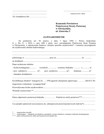 .................................................................. ..................................................... .................................................................. (miejscowość i data) Tel. kontaktowy/fax ……………….…… Komenda Powiatowa Państwowej Straży Pożarnej w Oświęcimiu, ul. Zatorska 2 ZAWIADOMIENIE Na podstawie art. 56 ustawy z dnia 7 lipca 1994 r. Prawo budowlane (t. j. Dz. U. z 2016 r., poz. 690 z późn. zm.) zawiadamiam Państwową Straż Pożarną w Oświęcimiu, o zakończeniu budowy/ zmianie sposobu użytkowania* i zamiarze przystąpienia do użytkowania obiektu budowlanego: ............................................................................................................................................................... ............................................................................................................................................................... położonego w .............................................., przy ul................................................. nr: …......., na działkach................................................................................................................................... Dane techniczne obiektu: - liczba kondygnacji ............ wysokość..............., wymiary budynku: ............ x ............ m - pow. zabudowy: ............... m2, pow. użytkowa.: …...........m2, kubatura: ............ m3 - charakter działalności: ………………………………………………………………....................... ............................................................................................................................................................... Kwalifikacja obiektu*: kategoria ZL ...../ PM (gęstość obciążenia ogniowego: ………..MJ/m2)/ IN. Zagrożenie wybuchem: występuje/brak* Przewidywana liczba użytkowników................................................................................................... Warunki usytuowania **...................................................................................................................... .............................................................................................................................................................. Klasa odporności pożarowej budynku …………… Podział na strefy pożarowe***.....….….…….. ……………………………………………………………………………………………………...... Czy projekt opiniował rzeczoznawca ds. zabezpieczeń przeciwpożarowych (tak/nie*)……...….…. ……………………………………….…. * niepotrzebne skreślić * * wolnostojący – odległość od obiektów sąsiednich, zwarta zabudowa, istniejący budynek (kondygnacja) * * * jedna strefa pożarowa, kilka stref pożarowych (podać ile). UWAGA: W celu weryfikacji zgłoszenia do wniosku należy dołączyć: 1. Kserokopie pozwolenia (pozwoleń) na budowę, 2. Kserokopie warunków ochrony przeciwpożarowej z projektu budowlanego (z opisu architektury). 3. Oświadczenie kierownika budowy.