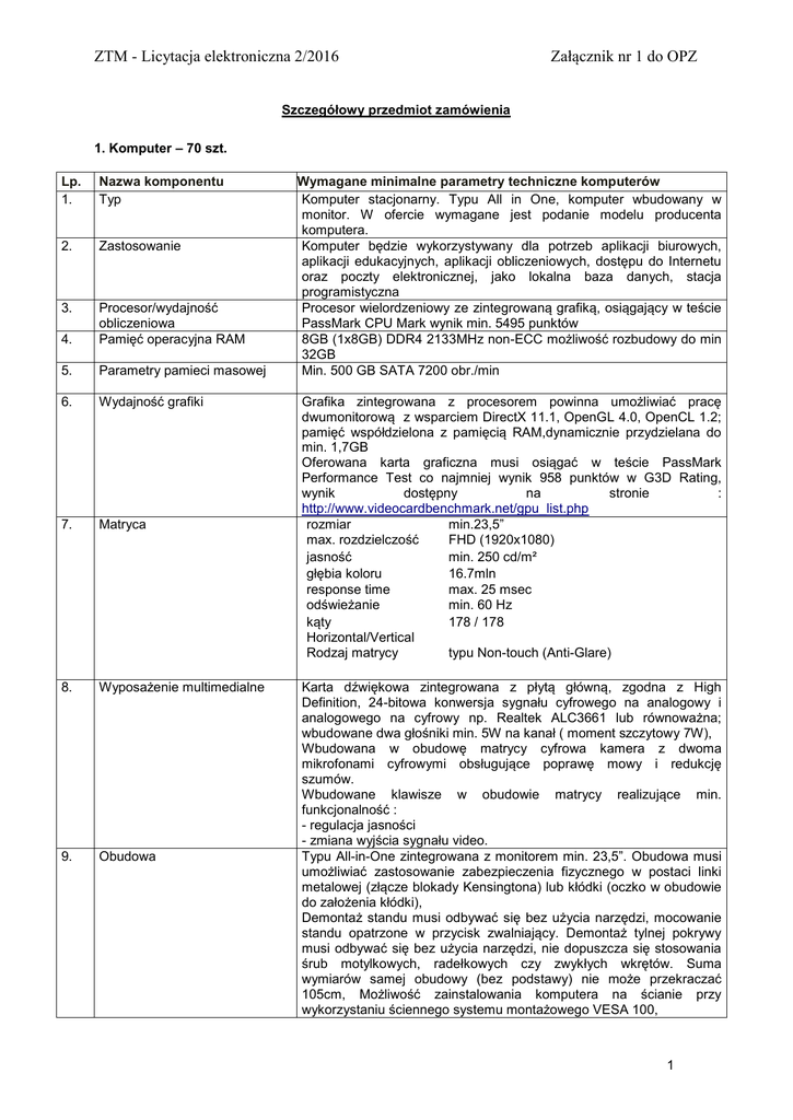 ZTM - Licytacja elektroniczna 2/2016 Załącznik nr 1 do OPZ Szczegółowy przedmiot zamówienia 1. Komputer – 70 szt. Lp. 1. Nazwa komponentu Typ 2. Zastosowanie 3. 4. Procesor/wydajność obliczeniowa Pamięć operacyjna RAM 5. Parametry pamieci masowej 6. Wydajność grafiki 7. Matryca 8. Wyposażenie multimedialne 9. Obudowa Wymagane minimalne parametry techniczne komputerów Komputer stacjonarny. Typu All in One, komputer wbudowany w monitor. W ofercie wymagane jest podanie modelu producenta komputera. Komputer będzie wykorzystywany dla potrzeb aplikacji biurowych, aplikacji edukacyjnych, aplikacji obliczeniowych, dostępu do Internetu oraz poczty elektronicznej, jako lokalna baza danych, stacja programistyczna Procesor wielordzeniowy ze zintegrowaną grafiką, osiągający w teście PassMark CPU Mark wynik min. 5495 punktów 8GB (1x8GB) DDR4 2133MHz non-ECC możliwość rozbudowy do min 32GB Min. 500 GB SATA 7200 obr./min Grafika zintegrowana z procesorem powinna umożliwiać pracę dwumonitorową z wsparciem DirectX 11.1, OpenGL 4.0, OpenCL 1.2; pamięć współdzielona z pamięcią RAM,dynamicznie przydzielana do min. 1,7GB Oferowana karta graficzna musi osiągać w teście PassMark Performance Test co najmniej wynik 958 punktów w G3D Rating, wynik dostępny na stronie : http://www.videocardbenchmark.net/gpu_list.php rozmiar min.23,5” max. rozdzielczość FHD (1920x1080) jasność min. 250 cd/m² głębia koloru 16.7mln response time max. 25 msec odświeżanie min. 60 Hz kąty 178 / 178 Horizontal/Vertical Rodzaj matrycy typu Non-touch (Anti-Glare) Karta dźwiękowa zintegrowana z płytą główną, zgodna z High Definition, 24-bitowa konwersja sygnału cyfrowego na analogowy i analogowego na cyfrowy np. Realtek ALC3661 lub równoważna; wbudowane dwa głośniki min. 5W na kanał ( moment szczytowy 7W), Wbudowana w obudowę matrycy cyfrowa kamera z dwoma mikrofonami cyfrowymi obsługujące poprawę mowy i redukcję szumów. Wbudowane klawisze w obudowie matrycy realizujące min. funkcjonalność : - regulacja jasności - zmiana wyjścia sygnału video. Typu All-in-One zintegrowana z monitorem min. 23,5”. Obudowa musi umożliwiać zastosowanie zabezpieczenia fizycznego w postaci linki metalowej (złącze blokady Kensingtona) lub kłódki (oczko w obudowie do założenia kłódki), Demontaż standu musi odbywać się bez użycia narzędzi, mocowanie standu opatrzone w przycisk zwalniający. Demontaż tylnej pokrywy musi odbywać się bez użycia narzędzi, nie dopuszcza się stosowania śrub motylkowych, radełkowych czy zwykłych wkrętów. Suma wymiarów samej obudowy (bez podstawy) nie może przekraczać 105cm, Możliwość zainstalowania komputera na ścianie przy wykorzystaniu ściennego systemu montażowego VESA 100, 1 ZTM - Licytacja elektroniczna 2/2016 10. Zgodność z systemami operacyjnymi i standardami 11. Bezpieczeństwo Załącznik nr 1 do OPZ Każdy komputer powinien być oznaczony niepowtarzalnym numerem seryjnym umieszonym na obudowie, oraz musi być wpisany na stałe w BIOS. Zasilacz wewnętrzny o mocy max. 155W pracujący w sieci 230V 50/60Hz prądu zmiennego i efektywności min. 85% przy obciążeniu zasilacza na poziomie 50% oraz o efektywności min. 82% przy obciążeniu zasilacza na poziomie 100%. Zasilacz w oferowanym komputerze musi się znajdować na stronie http://www.plugloadsolutions.com/80pluspowersupplies.aspx, do oferty należy dołączyć wydruk potwierdzający spełnienie wymogu 80plus, w przypadku kiedy u producenta występuje kilka zasilaczy które są montowane na etapie produkcji w fabryce załączyć wydruki dla wszystkich zasilaczy. Wydruki 80plus musza być potwierdzone przez producenta lub dołączone oświadczenie producenta komputera iż wskazane zasilacze przez wykonawcę spełniają 80plus. Moduł konstrukcji obudowy w jednostce centralnej komputera powinien pozwalać na demontaż kart rozszerzeń, napędu optycznego i dysku twardego bez konieczności użycia narzędzi (wyklucza się użycia wkrętów, śrub motylkowych, śrub radełkowych). Obudowa musi posiadać posiadać czujnik otwarcia obudowy współpracujący z oprogramowaniem zarządzająco – diagnostycznym. Obudowa musi umożliwiać zastosowanie zabezpieczenia fizycznego w postaci linki metalowej (złącze blokady Kensingtona) oraz kłódki (oczko w obudowie do założenia kłódki).. Wbudowany wizualny system diagnostyczny włączniku POWER, służący do sygnalizowania i diagnozowania problemów z komputerem i jego komponentami, sygnalizacja oparta na zmianie statusów diody LED przycisku POWER [ tzn. barw i miganie ] W szczególności musi sygnalizować: - uszkodzenie lub brak pamięci RAM - uszkodzenie płyty głównej [ w tym również portów I/O, chipset ] - uszkodzenie kontrolera Video - awarię BIOS’u - awarię procesora Oferowany system diagnostyczny nie może wykorzystywać minimalnej ilości wolnych slotów na płycie głównej, wymaganych wnęk zewnętrznych w specyfikacji oraz nie może być uzyskany przez konwertowanie, przerabianie innych złączy na płycie głównej nie wymienionych w specyfikacji a które nie są dedykowane dla systemu diagnostycznego. Każdy komputer powinien być oznaczony niepowtarzalnym numerem seryjnym umieszonym na obudowie, oraz musi być wpisany na stałe w BIOS. Oferowane modele komputerów muszą posiadać certyfikat Microsoft, potwierdzający poprawną współpracę oferowanych modeli komputerów z systemem operacyjnym Windows 7 oraz Windows 8.1 (załączyć wydruk ze strony Microsoft WHCL) Wbudowany, czyli wlutowany (nie dopuszcza się zintegrowanych z płytą główną tzn. układ wykorzystujący jakiekolwiek złącza wyprowadzone na płycie) w płycie głównej dedykowany układ sprzętowy służący do tworzenia i zarządzania wygenerowanymi przez komputer kluczami szyfrowania. Zabezpieczenie to musi posiadać możliwość szyfrowania poufnych dokumentów przechowywanych na dysku twardym przy użyciu klucza sprzęto
