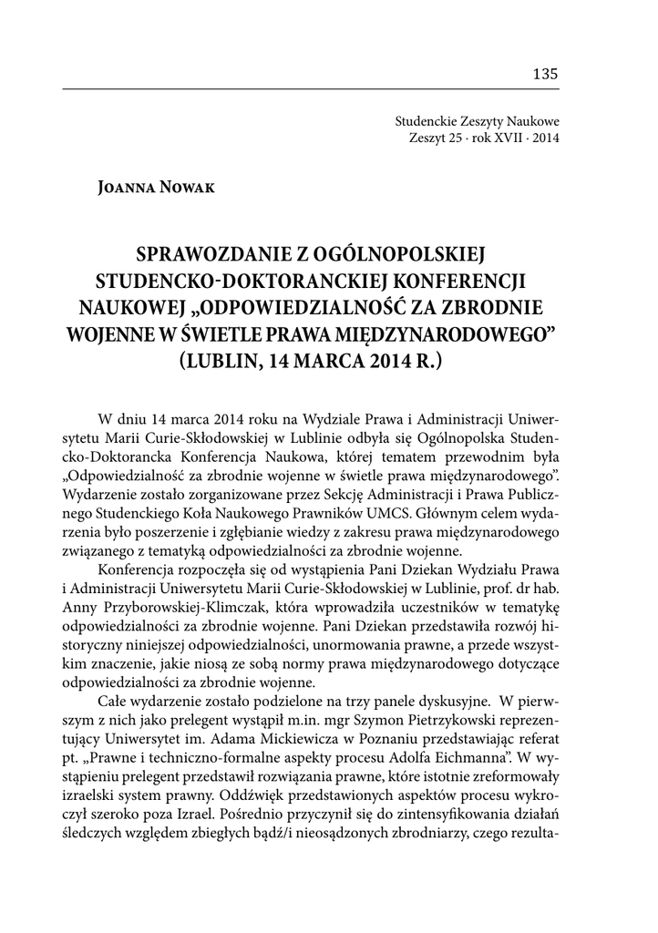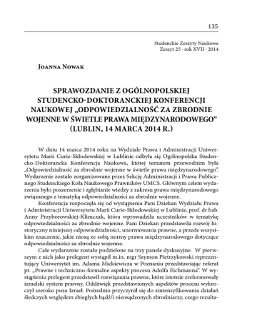 135 Studenckie Zeszyty Naukowe Zeszyt 25 ∙ rok XVII ∙ 2014 Joanna Nowak Sprawozdanie z Ogólnopolskiej Studencko-Doktoranckiej Konferencji Naukowej „Odpowiedzialność za zbrodnie wojenne w świetle prawa międzynarodowego” (Lublin, 14 marca 2014 r.) W dniu 14 marca 2014 roku na Wydziale Prawa i Administracji Uniwersytetu Marii Curie-Skłodowskiej w Lublinie odbyła się Ogólnopolska Studencko-Doktorancka Konferencja Naukowa, której tematem przewodnim była „Odpowiedzialność za zbrodnie wojenne w świetle prawa międzynarodowego”. Wydarzenie zostało zorganizowane przez Sekcję Administracji i Prawa Publicznego Studenckiego Koła Naukowego Prawników UMCS. Głównym celem wydarzenia było poszerzenie i zgłębianie wiedzy z zakresu prawa międzynarodowego związanego z tematyką odpowiedzialności za zbrodnie wojenne. Konferencja rozpoczęła się od wystąpienia Pani Dziekan Wydziału Prawa i Administracji Uniwersytetu Marii Curie-Skłodowskiej w Lublinie, prof. dr hab. Anny Przyborowskiej-Klimczak, która wprowadziła uczestników w tematykę odpowiedzialności za zbrodnie wojenne. Pani Dziekan przedstawiła rozwój historyczny niniejszej odpowiedzialności, unormowania prawne, a przede wszystkim znaczenie, jakie niosą ze sobą normy prawa międzynarodowego dotyczące odpowiedzialności za zbrodnie wojenne. Całe wydarzenie zostało podzielone na trzy panele dyskusyjne. W pierwszym z nich jako prelegent wystąpił m.in. mgr Szymon Pietrzykowski reprezentujący Uniwersytet im. Adama Mickiewicza w Poznaniu przedstawiając referat pt. „Prawne i techniczno-formalne aspekty procesu Adolfa Eichmanna”. W wystąpieniu prelegent przedstawił rozwiązania prawne, które istotnie zreformowały izraelski system prawny. Oddźwięk przedstawionych aspektów procesu wykroczył szeroko poza Izrael. Pośrednio przyczynił się do zintensyfikowania działań śledczych względem zbiegłych bądź/i nieosądzonych zbrodniarzy, czego rezulta- 136 tem były kolejne procesy, zwłaszcza w Niemczech Zachodnich w latach 60. i 70 XX wieku. Zgromadzony materiał miał kolosalne znaczenie dla przyszłych badań nad historią Zagłady, przyczyniając się do gwałtownego rozwoju Holocaust Studies od lat 60. Zeznania świadków oskarżenia – najrozleglejsza tematycznie i czasowo część procesu przyczyniły się do „rehabilitacji” osób ocalonych z Zagłady, rozwoju instytucji zajmujących się nagrywaniem i archiwizacją ich świadectw (jak USC Shoah Foundation) oraz wzrostem znaczenia świadków postępowaniu dowodowym. Natomiast, Justyna Nesterak i Kamil Klamer z Uniwersytetu Marii Curie-Skłodowskiej w Lublinie przedstawili pracę dotyczącą wojny domowej w Bośni, w której scharakteryzowali przebieg czystek etnicznych, masowych mordów, działań wojennych, stanu wojsk, uzbrojenia. Prelegenci dokonali również określenie stosunku państw i organizacji międzynarodowych do toczącej się wojny, przedstawili założenia planu Owena-Stoltenberga, a także odpowiedzialność międzynarodowa Karadzica i Mladicia za dokonane przez nich zbrodnie wojenne. Kolejny etap konferencji zapoczątkowało wystąpienie Aleksandry Klimek i Jonasza Gałęziowskiego (UMCS), którzy zaprezentowali specyfikę działania Trybunału Tokijskiego na arenie międzynarodowej, historia jego powołania, charakterystykę rozpatrywanych przez Trybunał spraw. Nadto, analizie zostało poddane wybrane orzecznictwo Trybunału, rozważona została sprawa osądzenia cesarza Hirohito i jego odpowiedzialności za działania wojenne Japonii. Całość rozważań oscylowała wokół podstawy tematyki, jaką jest określenie odpowiedzialności w prawie międzynarodowym. Omówiona została także kwestia tzw. „odpowiedzialności realnej za zbrodnie wojenne”, co w ostateczności doprowadziło do próby odpowiedzi na pytanie, czy realny wymiar kary za zbrodnie wojenne, ustępował miejsca rozlicznym interesom państw zwycięskich oraz czy był odpowiednio realizowany. W kolejnych wystąpieniach dyskutowano m.in. na temat wykorzystania dzieci w konfliktach zbrojnych czy też zbrodni ludobójstwa w Rwandzie. W ostatnim panelu poruszono tematykę odpowiedzialności za zbrodnie popełnione w czasach Demokratycznej Kampuczy, omówiono odpowiedzialność za zbrodnie ludobójstwa w świetle orzeczeń trybunałów międzynarodowych, a w konsekwencji podsumowano kwestię odpowiedzialności karnej za zbrodnie wojenne, jej rozwój, problemy i aspekty prawne. Po każdym panelu trwała ożywiona dyskusja, a całe wydarzenie spotkało się ze sporym zainteresowaniem słuchaczy z uwagi na poruszane przez prelegentów kwestie, często dość kontrowersyjne. Tym samym, tego typu wydarzenia nie tylko skutkują pogłębieniem wiedzy na temat prawa międzynarodowego, ale są także istotne dla poszerzenia świadomości obywateli o skutkach zbrodni wojennych.