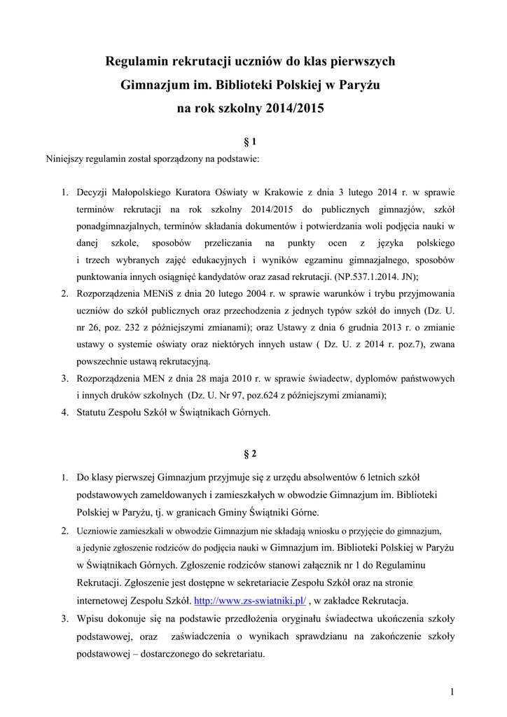Regulamin rekrutacji uczniów do klas pierwszych Gimnazjum im. Biblioteki Polskiej w Paryżu na rok szkolny 2014/2015 §1 Niniejszy regulamin został sporządzony na podstawie: 1. Decyzji Małopolskiego Kuratora Oświaty w Krakowie z dnia 3 lutego 2014 r. w sprawie terminów rekrutacji na rok szkolny 2014/2015 do publicznych gimnazjów, szkół ponadgimnazjalnych, terminów składania dokumentów i potwierdzania woli podjęcia nauki w danej szkole, sposobów przeliczania na punkty ocen z języka polskiego i trzech wybranych zajęć edukacyjnych i wyników egzaminu gimnazjalnego, sposobów punktowania innych osiągnięć kandydatów oraz zasad rekrutacji. (NP.537.1.2014. JN); 2. Rozporządzenia MENiS z dnia 20 lutego 2004 r. w sprawie warunków i trybu przyjmowania uczniów do szkół publicznych oraz przechodzenia z jednych typów szkół do innych (Dz. U. nr 26, poz. 232 z późniejszymi zmianami); oraz Ustawy z dnia 6 grudnia 2013 r. o zmianie ustawy o systemie oświaty oraz niektórych innych ustaw ( Dz. U. z 2014 r. poz.7), zwana powszechnie ustawą rekrutacyjną. 3. Rozporządzenia MEN z dnia 28 maja 2010 r. w sprawie świadectw, dyplomów państwowych i innych druków szkolnych (Dz. U. Nr 97, poz.624 z późniejszymi zmianami); 4. Statutu Zespołu Szkół w Świątnikach Górnych. §2 1. Do klasy pierwszej Gimnazjum przyjmuje się z urzędu absolwentów 6 letnich szkół podstawowych zameldowanych i zamieszkałych w obwodzie Gimnazjum im. Biblioteki Polskiej w Paryżu, tj. w granicach Gminy Świątniki Górne. 2. Uczniowie zamieszkali w obwodzie Gimnazjum nie składają wniosku o przyjęcie do gimnazjum, a jedynie zgłoszenie rodziców do podjęcia nauki w Gimnazjum im. Biblioteki Polskiej w Paryżu w Świątnikach Górnych. Zgłoszenie rodziców stanowi załącznik nr 1 do Regulaminu Rekrutacji. Zgłoszenie jest dostępne w sekretariacie Zespołu Szkół oraz na stronie internetowej Zespołu Szkół. http://www.zs-swiatniki.pl/ , w zakładce Rekrutacja. 3. Wpisu dokonuje się na podstawie przedłożenia oryginału świadectwa ukończenia szkoły podstawowej, oraz zaświadczenia o wynikach sprawdzianu na zakończenie szkoły podstawowej – dostarczonego do sekretariatu. 1 4. Dyrektor Gimnazjum na wniosek o przyjęcie do szkoły - rodziców (prawnych opiekunów) przyjmuje do szkoły ucznia z innego obwodu, w miarę posiadanych wolnych miejsc. 5. Uczniowie spoza obwodu przyjmowani są w liczbie, na którą pozwalają warunki organizacyjne szkoły, na podstawie wyników końcowych w klasie szóstej, wyniku sprawdzianu w klasie szóstej oraz oceny zachowania – ( nie niższej niż dobra ; 4) 6. Uczeń zamieszkały poza obwodem Gimnazjum składa wniosek o przyjęcie do Gimnazjum im. Biblioteki Polskiej w Paryżu w Świątnikach Górnych, stanowiący załącznik nr 2 do Regulaminu Rekrutacji. Wniosek jest dostępny w sekretariacie Zespołu Szkół oraz na stronie internetowej: http://www.zs-swiatniki.pl/, w zakładce Rekrutacja. 7. Laureaci konkursów o zasięgu wojewódzkim i ponad wojewódzkim, których program obejmuje w całości lub poszerza treści podstawy programowej co najmniej jednego przedmiotu, przyjmowani są do gimnazjum niezależnie od kryteriów zawartych w pkt 5. 8. Wszystkie dokumenty należy składać w sekretariacie Zespołu Szkół – nowy budynek, pierwsze piętro, od poniedziałku do piątku w godz. 8:00 - 15:00. 9. Informacje na temat rekrutacji do Gimnazjum im. Biblioteki Polskiej w Paryżu można także uzyskać pod numerem telefonu: (12) 270-50-40, od poniedziałku do piątku w godz. 8:00 15:00. §3 Terminy Przyjmowanie dokumentów od kandydatów – zgłoszenia 1. rodziców lub wniosek rodziców, od 3 marca 2014 r. do 20 czerwca 2014 r. do godz. 15:00 Przedkładanie oryginałów świadectw ukończenia szkoły 2. 3. podstawowej i zaświadczeń o wynikach sprawdzianu. Praca komisji rekrutacyjnej. Podanie wyników postępowania kwalifikacyjnego do 4. publicznej wiadomości w formie list kandydatów. zakwalifikowanych i kandydatów niezakwalifikowanych Potwierdzenie woli podjęcia nauki przez kandydatów 5. umieszczonych na listach zakwalifikowanych do przyjęcia, poprzez dostarczenie oryginału świadectwa ukończenia szkoły od 27 czerwca 2014 do 2 lipca 2014 r. do godz. 15:00 3 lipca – 7 lipca 2014 r. 7 lipca 2014 r. godz. 13:00 do 9 lipca 2014 r. do godz. 15.00 2 podstawowej i oryginału zaświadczenia o wynikach sprawdzianu w klasie szóstej. Podanie do publicznej wiadomości list kandydatów przyjętych 6. i kandydatów nieprzyjętych do Gimnazjum im. Biblioteki godz. 13.00 Polskiej w Paryżu w Świątnikach Górnych. 7. 10 lipca 2014 r. Postępowanie uzupełniające. do 29 sierpnia 2014r. §4 1. Wszystkie klasy gimnazjum realizują podstawę programową kształcenia ogólnego dla gimnazjum. 2. Dla uczniów o sprecyzowanych zainteresowaniach proponujemy: a) oddział językowo – turystyczny, b) oddział informatyczny, c) oddział usportowiony – specjalność gry zespołowe: piłka siatkowa, piłka nożna. 3. Dla uczniów, którzy nie mają jeszcze sprecyzowanych zainteresowań, proponujemy kształcenie w klasach ogólnych. 4. Podstawowym językiem obcym jest język angielski. Drugim językiem obcym, jest do wyboru: język francuski lub język niemiecki. Oddział Informacja Program dodatkowy ogólna – zainteresowania uczniów Ogólnodostępny Wszystkie ---------------- oddziały Ogólnodostępny realizują Językowo - turystyczny podstawę programową Ogólnodostępny kształcenia Informatyczny ogólnego Ogólnodostępny Usportowiony Informacje dodatkowe Dla wszystkich uczniów, którzy nie mają jeszcze sprecyzowanych zainteresowań. Klasa daje możliwość równomiernego rozwijania zainteresowań różnymi dziedzinami nauki. Współpraca z British Council w zakresie przygotowania i zdawania egzaminów państwowych. Dodatkowe zajęcia z języka angielskiego. Wyjazdy, wycieczki międzynarodowe wymiany uczniów. Zajęcia z informatyki od klasy pierws