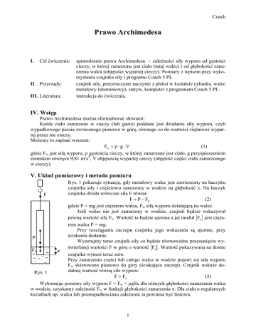 Coach Prawo Archimedesa I. Cel ćwiczenia: II. Przyrządy: III. Literatura: sprawdzenie prawa Archimedesa − zależności siły wyporu od gęstości cieczy, w której zanurzone jest ciało (tutaj walec) i od głębokości zanurzenia walca (objętości wypartej cieczy). Pomiary z wpisem przy wykorzystaniu czujnika siły i programu Coach 5 PL czujnik siły, przezroczyste naczynie z pleksi w kształcie cylindra, walec metalowy (aluminiowy), statyw, komputer z programem Coach 5 PL. instrukcja do ćwiczenia. IV. Wstęp Prawo Archimedesa można sformułować słowami: Każde ciało zanurzone w cieczy (lub gazie) poddane jest działaniu siły wyporu, czyli wypadkowego parcia zwróconego pionowo w górę, równego co do wartości ciężarowi wypartej przez nie cieczy. Możemy to zapisać wzorem: (1) Fw = ρ ⋅ g ⋅ V gdzie Fw jest siłą wyporu, ρ gęstością cieczy, w której zanurzone jest ciało, g przyspieszeniem ziemskim równym 9,81 m/s2, V objętością wypartej cieczy (objętość części ciała zanurzonego w cieczy). V. Układ pomiarowy i metoda pomiaru Rys. 1 pokazuje sytuację, gdy metalowy walec jest zawieszony na haczyku czujnika siły i częściowo zanurzony w wodzie na głębokość x. Na haczyk czujnika działa wówczas siła F równa: F F = P − Fw (2) gdzie P = mg jest ciężarem walca, Fw siłą wyporu działającą na walec. Jeśli walec nie jest zanurzony w wodzie, czujnik będzie wskazywał pewną wartość siły Fo. Wartość ta będzie ujemna a jej moduł Fo jest ciężarem walca P = mg. Przy rozciąganiu zaczepu czujnika jego wskazania są ujemne, przy • ściskaniu dodatnie. P Wyzerujmy teraz czujnik siły co będzie równoważne przesunięciu wyświetlanej wartości F w górę o wartość Fo . Wartość pokazywana na ikonie Fw • x czujnika wynosi teraz zero. Przy zanurzeniu części lub całego walca w wodzie pojawi się siła wyporu Fw skierowana pionowo do góry (ściskająca zaczep). Czujnik wskaże dodatnią wartość równą sile wyporu: Rys. 1 F = Fw (3) Wykonując pomiary siły wyporu F = Fw = ρgSx dla różnych głębokości zanurzenia walca w wodzie, uzyskamy zależność Fw w funkcji głębokości zanurzenia x. Dla ciała o regularnych kształtach np. walca lub prostopadłościanu zależność ta powinna być liniowa. 1 Coach VI. Wykonanie pomiarów. 1. Uruchom program Coach 5 PL. 2. Wybierz z biblioteki czujnik siły z dwoma zakresami (0362bt) (CMA) (-5…5N): kliknij prawym przyciskiem myszy pusty kwadrat palety z czujnikami z lewej strony w dolnej części ekranu. Kliknij opcję menu Dodaj z biblioteki i z okienka wybierz odpowiedni czujnik. 3. Przeciągnij ikonę czujnika na odpowiednie gniazdo konsoli np. do oznaczonego nr 1. 4. W pasku narzędzi (góra) kliknij ikonę Nastawienie pomiaru. Można także wybrać ją z linijki menu Narzędzia. W otworzonym oknie ustaw częstotliwość na ręcznie. Kliknij OK. 5. Kliknij ikonę czujnika prawym przyciskiem myszy, z menu wybierz Prezentuj tabelę i umieść ją np. w lewej górnej części ekranu, klikając lewym przyciskiem myszy w tej części ekranu. 6. Kliknij myszą (lewym przyciskiem ikonę młotka w części ekranu z tabelą. Z otwartego menu wybierz Tworzenie /Edycja tabeli. 7. W otworzonym oknie Tworzenie /Edycja tabeli wybierz: Zbiór danych: C1 (przeważnie kursor podświetla to pole) Źródło danych: Wpis Wielkość: np. x (jeśli wpis jest długością) Jednostka: m (metr) Zatwierdź klikając OK. 8. Kliknij ikonę młotka (w oknie tabeli). Wybierz z menu Prezentuj na wykresie i umieść wykres w drugim oknie (klikając w tym oknie lewym przyciskiem myszy). 9. Kliknij ikonę młotka w oknie wykresu. Z menu wybierz Tworzenie/Edycja wykresu. Ustaw odpowiednie parametry dla zbiorów danych C1, C2 . Mogą to być: C1 Min. 0, Max. 0,25 C2 Oś: pierwsza pionowa Kolor: wg uznania Znacznik: np. duża kropka Linia: brak Zatwierdź klikając OK. 10. Wyzeruj czujnik siły. 11. Zaczep walec na haczyku czujnika siły tak, by znalazł się w całości w naczyniu z pleksi i odczytaj wskazanie czujnika siły wyświetlane na ikonie czujnika i zapisz moduł tej wartości Fo . 12. Ponownie wyzeruj czujnik siły i sprawdź czy wyświetlana wartość na ikonie czujnika wynosi zero. 13. Kliknij lewym przyciskiem myszy zielony przycisk w pasku narzędziowym (u góry). Pojawi się nowy zielony przycisk z cyfrą 1 w środku, a z jego prawej strony czerwony przycisk. Kliknij lewym przyciskiem myszy zielony kwadrat (następuje pomiar wielkości, tutaj siły, przez czujnik). Pojawi się okienko wpisu. Wpisz odpowiednią wielkość, tutaj x i kliknij OK. Na wykresie powinien być widoczny pierwszy punkt. Uwaga: Pomiar wielkości mierzonej czujnikiem dokonywany jest w momencie naciśnięcia zielonego klawisza z cyferką „1”, a nie w chwili akceptacji wpisu przez OK. 14. Nalej wody destylowanej do naczynia z pleksi tak, by walec zanurzył się na pewną głębokość np. na 2 cm i przeprowadź pomiar wg punktu 13. 15. Dolewając wody zmieniaj głębokość zanurzenia walca i przeprowadź pomiary zgodnie z punktem 13. 2 Coach 16. Po zakończeniu wszystkich pomiarów kliknij lewym przyciskiem myszy czerwony kwadrat w pasku narzędziowym. 17. Po wykonaniu poleceń z punktów VII.1 i VII.2 (Opracowanie wyników – patrz niżej) wykonaj pomiary dla cieczy o innej gęstości. VII. Opracowanie wyników 1. Zapisz wyniki w programie Coach 5 w katalogu (projekcie) Pomiary w fizyce. Pozwoli to powracać wielokrotnie do tych danych w celu wykonania ich analizy. W tym celu: • najedź kursorem myszy na ikonę zapisu wyników (lewa strona górnej części ekranu) i kliknij ją lewym przyciskiem myszy. Otworzy się okno Zapisz wyniki jako. • w polu opis umieść swoją nazwę pliku danych, Zapisz również tabelę z danymi i wykres z ekranu w pliku Excel’a (po kliknięciu prawym przyciskiem myszki w polu wykresu wybierz Kopiuj do schowka). Przed skopiowaniem tabeli danych należy ją zaznaczyć. 2. Dopasuj do otrzymanyc
