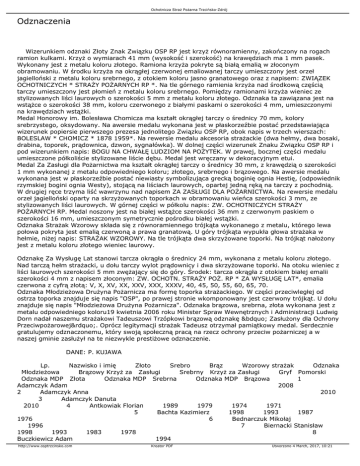 Ochotnicza Straż Pożarna Trzcińsko-Zdrój Odznaczenia Wizerunkiem odznaki Złoty Znak Związku OSP RP jest krzyż równoramienny, zakończony na rogach ramion kulkami. Krzyż o wymiarach 41 mm (wysokość i szerokość) na krawędziach ma 1 mm pasek. Wykonany jest z metalu koloru złotego. Ramiona krzyża pokryte są białą emalią w złoconym obramowaniu. W środku krzyża na okrągłej czerwonej emaliowanej tarczy umieszczony jest orzeł jagielloński z metalu koloru srebrnego, z otokiem koloru jasno granatowego oraz z napisem: ZWIĄZEK OCHOTNICZYCH * STRAŻY POŻARNYCH RP *. Na tle górnego ramienia krzyża nad środkową częścią tarczy umieszczony jest płomień z metalu koloru srebrnego. Pomiędzy ramionami krzyża wieniec ze stylizowanych liści laurowych o szerokości 5 mm z metalu koloru złotego. Odznaka ta zawiązana jest na wstążce o szerokości 38 mm, koloru czerwonego z białymi paskami o szerokości 4 mm, umieszczonymi na krawędziach wstążki. Medal Honorowy im. Bolesława Chomicza ma kształt okrągłej tarczy o średnicy 70 mm, kolory srebrzystego, oksydowany. Na awersie medalu wykonana jest w płaskorzeźbie postać przedstawiająca wizerunek popiersie pierwszego prezesa jednolitego Związku OSP RP, obok napis w trzech wierszach: BOLESLAW * CHOMICZ * 1878 1959*. Na rewersie medalu akcesoria strażackie (dwa hełmy, dwa bosaki, drabina, toporek, prądownica, dzwon, sygnałówka). W dolnej części wizerunek Znaku Związku OSP RP i pod wizerunkiem napis: BOGU NA CHWAŁĘ LUDZIOM NA POŻYTEK. W prawej, bocznej części medalu umieszczone półkoliście stylizowane liście dębu. Medal jest wręczany w dekoracyjnym etui. Medal Za Zasługi dla Pożarnictwa ma kształt okrągłej tarczy o średnicy 30 mm, z krawędzią o szerokości 1 mm wykonanej z metalu odpowiedniego koloru; złotego, srebrnego i brązowego. Na awersie medalu wykonana jest w płaskorzeźbie postać niewiasty symbolizująca grecką boginię ognia Hestię, (odpowiednik rzymskiej bogini ognia Westy), stojącą na liściach laurowych, opartej jedną ręką na tarczy z pochodnią. W drugiej ręce trzyma liść wawrzynu nad napisem ZA ZASŁUGI DLA POŻARNICTWA. Na rewersie medalu orzeł jagielloński oparty na skrzyżowanych toporkach w obramowaniu wieńca szerokości 3 mm, ze stylizowanych liści laurowych. W górnej części w półkolu napis: ZW. OCHOTNICZYCH STRAŻY POŻARNYCH RP. Medal noszony jest na białej wstążce szerokości 36 mm z czerwonym paskiem o szerokości 16 mm, umieszczonym symetrycznie pośrodku białej wstążki. Odznaka Strażak Wzorowy składa się z równoramiennego trójkąta wykonanego z metalu, którego lewa połowa pokryta jest emalią czerwoną a prawa granatową. U góry trójkąta wypukła głowa strażaka w hełmie, niżej napis: STRAŻAK WZOROWY. Na tle trójkąta dwa skrzyżowane toporki. Na trójkąt nałożony jest z metalu koloru złotego wieniec laurowy. Odznakę Za Wysługę Lat stanowi tarcza okrągła o średnicy 24 mm, wykonana z metalu koloru złotego. Nad tarczą hełm strażacki, u dołu tarczy wylot prądownicy i dwa skrzyżowane toporki. Na otoku wieniec z liści laurowych szerokości 5 mm zwężający się do góry. Środek: tarcza okrągła z otokiem białej emalii szerokości 4 mm z napisem złoconym: ZW. OCHOTN. STRAŻY POŻ. RP * ZA WYSŁUGĘ LAT*, emalia czerwona z cyfrą złotą: V, X, XV, XX, XXV, XXX, XXXV, 40, 45, 50, 55, 60, 65, 70. Odznaka Młodzieżowa Drużyna Pożarnicza ma formę toporka strażackiego. W części przeciwległej od ostrza toporka znajduje się napis "OSP", po prawej stronie wkomponowany jest czerwony trójkąt. U dołu znajduje się napis "Młodzieżowa Drużyna Pożarnicza". Odznaka brązowa, srebrna, złota wykonana jest z metalu odpowiedniego koloru19 kwietnia 2006 roku Minister Spraw Wewnętrznych i Administracji Ludwig Dorn nadał naszemu strażakowi Tadeuszowi Trzópkowi brązową odznakę „ Zasłużony dla Ochrony Przeciwpożarowej”. Oprócz legitymacji strażak Tadeusz otrzymał pamiątkowy medal. Serdecznie gratulujemy odznaczonemu, który swoją społeczną pracą na rzecz ochrony przeciw pożarniczej a w naszej gminie zasłużył na te niezwykle prestiżowe odznaczenie. DANE: P. KUJAWA Lp. Nazwisko i imię Złoto Srebro Brąz Wzorowy strażak Odznaka Młodzieżowa Brązowy Krzyż za Zasługi Srebrny Krzyż za Zasługi Gryf Pomorski Odznaka MDP Złota Odznaka MDP Srebrna Odznaka MDP Brązowa 1 Adamczyk Adam 2008 2 Adamczyk Anna 2010 3 Adamczyk Danuta 2010 4 Antkowiak Florian 1989 1979 1974 1971 5 Bachta Kazimierz 1998 1993 1987 1976 6 Bednarczuk Mikołaj 1996 7 Biernacki Stanisław 1998 1993 1983 1978 8 Buczkiewicz Adam 1994 http://www.osptrzcinsko.com Kreator PDF Utworzono 4 March, 2017, 10:21 Ochotnicza Straż Pożarna Trzcińsko-Zdrój 9 Budnik Jan 10 1991 1995 1983 1978 Bułgajewski Adam 1985 11 Cacek Antoni 1995 1989 1983 1971 12 Cacek Bolesław 1989 1984 13 Chloupek Jarosław 14 Chloupek 2008 2002 15 1974 2008 2002 Norbert Chyjek Hubert 16 Cyrkowniak Michał 1995 1989 1984 17 Dadacz Ryszard 1993 1989 1985 1984 18 Dyląg Mieczysław 1983 1978 1976 1979 19 Gołaś Zbigniew 1985 20 Grabowicz Aleksandra 2010 21 Grabowicz Katarzyna 2010 22 Gronek Grzegorz 2008 23 Habiak Andrzej 2006 2000 2000 24 Jakimowicz Wincenty 1984 1978 1974 25 Jasionowski Bolesław 1979 26 Jasionowski Władysław 1974 1971 1971 27 Kantor Eugeniusz 2002 1998 1998 28 Kasprzyk Mieczysław 2000 1997 1991 1984 29 Kasprzyk Rafał 30 Kluczyński Henryk 1996 1990 1976 31 Korycki Ryszard 2002 1997 1989 32 Korycki Władysław 2002 1996 1990 1980 33 Korzeniewska Angela 2010 34 Kubiak Krystyna 1996 1991 1985 1987 35 Kujawa Mirosław 1997 36 Kujawa Paweł 2008 2002 1998 1995 2010 37 Kujawa Stanisław 1986 1978 1974 1965 38 Lewandowski Feliks 1978 39 Lizurej Aleksandra 2010 40 Łogin Wojciech 2001 1986 1980 1997 2005 1987 41 Łusiak Aleksandra 2010 42 Marcjanik Henryk 1984 1971 43 Marcjanik Zenon 1997 1994 44 Marek Adam 2008 x 45 Mucha Wiktoria 2010