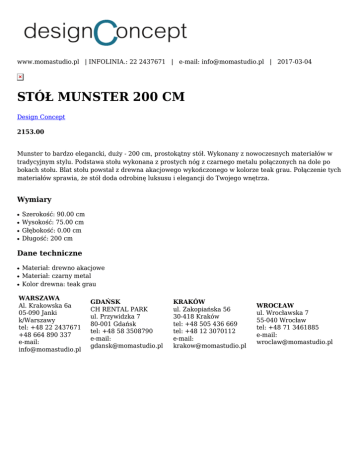 www.momastudio.pl | INFOLINIA.: 22 2437671 | e-mail: [email protected] | 2017-03-04 STÓŁ MUNSTER 200 CM Design Concept 2153.00 Munster to bardzo elegancki, duży - 200 cm, prostokątny stół. Wykonany z nowoczesnych materiałów w tradycyjnym stylu. Podstawa stołu wykonana z prostych nóg z czarnego metalu połączonych na dole po bokach stołu. Blat stołu powstał z drewna akacjowego wykończonego w kolorze teak grau. Połączenie tych materiałów sprawia, że stół doda odrobinę luksusu i elegancji do Twojego wnętrza. Wymiary ● ● ● ● Szerokość: 90.00 cm Wysokość: 75.00 cm Głębokość: 0.00 cm Długość: 200 cm Dane techniczne ● ● ● Materiał: drewno akacjowe Materiał: czarny metal Kolor drewna: teak grau WARSZAWA Al. Krakowska 6a 05-090 Janki k/Warszawy tel: +48 22 2437671 +48 664 890 337 e-mail: [email protected] GDAŃSK CH RENTAL PARK ul. Przywidzka 7 80-001 Gdańsk tel: +48 58 3508790 e-mail: [email protected] KRAKÓW ul. Zakopiańska 56 30-418 Kraków tel: +48 505 436 669 tel: +48 12 3070112 e-mail: [email protected] WROCŁAW ul. Wrocławska 7 55-040 Wrocław tel: +48 71 3461885 e-mail: [email protected]