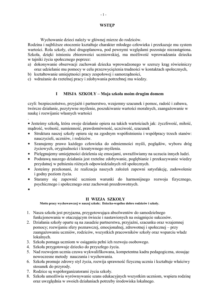 -1- WSTĘP Wychowanie dzieci należy w głównej mierze do rodziców. Rodzina i najbliższe otoczenie kształtuje charakter młodego człowieka i przekazuje mu system wartości. Rola szkoły, choć drugoplanowa, pod pewnymi względami pozostaje niezastąpiona. Szkoła, dzięki istnieniu zbiorowości uczniowskiej, ma możliwość wprowadzania dziecka w tajniki życia społecznego poprzez: a) dokonywanie obserwacji zachowań dziecka wprowadzonego w szerszy krąg rówieśniczy oraz udzielanie mu pomocy w celu przezwyciężenia trudności w kontaktach społecznych, b) kształtowanie umiejętności pracy zespołowej i samorządności, c) wdrażanie do rzetelnej pracy i zdobywania potrzebnej mu wiedzy. I MISJA SZKOŁY – Moja szkoła moim drugim domem czyli: bezpieczeństwo, przyjaźń i partnerstwo, wzajemny szacunek i pomoc, radość i zabawa, twórcze działanie, pozytywne myślenie, poszukiwanie wartości moralnych, zaangażowanie w naukę i rozwijanie własnych wartości . Jesteśmy szkołą, która swoje działanie opiera na takich wartościach jak: życzliwość, miłość, mądrość, wolność, sumienność, prawdomówność, uczciwość, szacunek Struktura naszej szkoły opiera się na zgodnym współistnieniu i współpracy trzech stanów: nauczycieli, uczniów, i rodziców. Szanujemy prawo każdego człowieka do odmienności myśli, poglądów, wyboru dróg życiowych, oryginalności i kreatywnego myślenia. Pielęgnujemy umiejętności dzielenia się emocjami, uwrażliwiamy na uczucia innych ludzi. Podstawą naszego działania jest rzetelne zdobywanie, pogłębianie i przekazywanie wiedzy przydatnej w pełnieniu różnych odpowiedzialnych ról społecznych. Jesteśmy przekonani, że realizacja naszych założeń zapewni satysfakcję, zadowolenie i godny poziom życia. Staramy się zapewnić uczniom warunki do harmonijnego rozwoju fizycznego, psychicznego i społecznego oraz zachowań prozdrowotnych. II WIZJA SZKOŁY Motto pracy wychowawczej w naszej szkole; Dziecko-wspólne dobro rodziców i szkoły. 1. Nasza szkoła jest przyjazna, przygotowująca absolwentów do samodzielnego funkcjonowania w otaczającym świecie i nastawionych na osiągnięcie sukcesów. 2. Działania szkoły oparte są na zasadzie partnerstwa, przyjaźni, szacunku oraz wzajemnej pomocy; rozwijaniu sfery poznawczej, emocjonalnej, zdrowotnej i społecznej – przy zaangażowaniu uczniów, rodziców, wszystkich pracowników szkoły oraz wsparciu władz lokalnych. 3. Szkoła pomaga uczniom w osiąganiu pełni ich rozwoju osobowego. 4. Szkoła przygotowuje dziecko do przyszłego życia. 5. Nad rozwojem ucznia czuwa wykwalifikowana, kompetentna kadra pedagogiczna, stosując nowoczesne metody nauczania i wychowania. 6. Szkoła promuje zdrowy styl życia, rozwija sprawność fizyczną ucznia i kształtuje właściwy stosunek do przyrody. 7. Rodzice są współorganizatorami życia szkoły. 8. Szkoła umożliwia wyrównywanie szans edukacyjnych wszystkim uczniom, wspiera rodzinę oraz uwzględnia w swoich działaniach potrzeby środowiska lokalnego. -2- 9. Działania wychowawcze szkoły zmierzają do kreowania postawy dobrego Europejczyka oraz rozwijania tolerancji wobec innych narodów i religii. 10. Wszyscy pracownicy szkoły są wychowawcami; swoją postawą tworzą atmosferę sprzyjającą rozwojowi osobowości ucznia. 1. 2. 3. 4. 5. 6. 7. 8. 9. III MODEL ABSOLWENTA Absolwent nasze szkoły: Jest przygotowany do dalszego kształcenia, posiada ogólną wiedzę i kluczowe umiejętności. Jest przygotowany do pracy indywidualnej i zespołowej. Wykorzystuje nabyte wiadomości i umiejętności w praktycznym działaniu. Pracuje nad własnym rozwojem, budując swój system wartości, rozwija swoje pasje i zainteresowania. Posiada umiejętności społeczne- komunikacji, negocjacji, współpracy, aktywności, zdrowej rywalizacji-i jest asertywny. Jest aktywny i twórczy- podejmuje próby prezentacji i obrony swojego zdania, szanuje tych, którzy mają odmienne poglądy. Uczestniczy w kulturze środowiska, ma świadomość tradycji oraz swojej w niej roli. Jest wrażliwy na otaczającą przyrodę, piękno natury, szanuje człowieka i środowisko. Uczestniczy w promocji zdrowego stylu życia, dba o rozwój fizyczny i umysłowy. IV WYCHOWANIE SZKOLNE MA NA UWADZE ROZWÓJ UCZNIÓW WE WSZYSTKICH SFERACH JEGO OSOBOWOŚCI, TRAKTUJĄC GO INTEGRALNIE. Sfera osobowości Cele ucznia wychowawcze -1-2Rozwój -poznanie zasad duchowy wiary, -poznanie dorobku kultury, -kształcenie postawy twórczej, -myślenie refleksyjne, -zdolność do głębokiego kontaktu z drugim człowiekiem Kształcenie -pracowitość, woli rzetelność, wytrwałość, -odpowiedzialność, -aktywność, -stawianie celów i osiąganie ich, -animacja działań Formy realizacji -3na zajęciach katechezy, rekolekcjach godzinach wychowawczych, Odpowiedzialni -4Nauczyciel religii, wychowawcy, n-le historii, j. polskiego w trakcie wszystkich zajęć poprzez uwzględnianie w ocenie pracy, punktualności wykonania nakładu pracy i formy jej prezentacji, szczególnie zaś w pracach grupowych, w działalności samorządowej uczniów n-le, uczniowie, opiekunowie organizacji uczniowskich i samorządu uczniowskiego Uwagi -5- -3- Rozwój intelektualny Kształcenie zdolności spostrzegania i kojarzenia Rozwój moralny Ukierunkowanie uczuć, emocji Wychowanie -poszukiwanie prawdy, -przezwyciężanie lenistwa myślowego, -poznanie swoich uzdolnień, -rozszerzanie swoich zainteresowań -umiejętność przyswajania wiedzy, -umiejętność poszukiwania informacji, -umiejętność wypowiadania się i dyskutowania, -budowa struktur myślowych -wyostrzenie zmysłów, -umiejętność obserwacji, -ćwiczenie pamięci, -zdolność kojarzenia -myślenie wartościujące, -umiejętność oceny własnych zachowań, -gotowość do poświęceń, -odwaga cywilna, -świadome posłuszeństwo, -autentyzm działania, otwartość, ufność -umiejętność służenia pomocą innym w różnych trudnych s