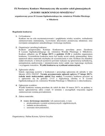 IX Powiatowy Konkurs Matematyczny dla uczniów szkół gimnazjalnych „WZORY SKRÓCONEGO MNOŻENIA” organizowany przez II Liceum Ogólnokształcące im. rotmistrza Witolda Pileckiego w Mikołowie Regulamin konkursu: 1. Cel konkursu: Konkurs ma na celu usystematyzowanie i pogłębienie wiedzy uczniów, rozbudzenie zainteresowania matematyką, wyzwolenie aktywności poznawczej młodzieży oraz rozwijanie umiejętności samodzielnego i twórczego myślenia. 2. Organizacja i przebieg konkursu: Konkurs przeprowadza Komisja Konkursowa powołana przez Dyrektora II Liceum Ogólnokształcącego im. rotmistrza Witolda Pileckiego w Mikołowie. Konkurs odbędzie się 27 lutego 2017r o godzinie 13:30 w siedzibie organizatora konkursu. Uczestnikiem konkursu może być każdy uczeń szkoły gimnazjalnej, który opanował zakres materiału niezbędny do uczestniczenia w nim. Konkurs ma charakter zadań otwartych, w których uczniowie powinni wykazać się sprawnością rachunkową, umiejętnością analizowania i interpretowania treści zadań oraz logicznego myślenia i wyciągania wniosków. Wyniki konkursu są wynikami ostatecznymi. 3. Zgłoszenie szkoły: Szkoły zapoznają uczniów z konkursem i przesyłają zgłoszenia do udziału w nim faksem: (032) 2262247. Termin przyjmowania zgłoszeń upływa 17 lutego 2017r. (szkoła może maksymalnie zgłosić trzy osoby). Uczestnicy konkursu proszeni są o zgłoszenie się do godziny 13:15 z legitymacją szkolną w II Liceum Ogólnokształcącym im. rotmistrza Witolda Pileckiego w Mikołowie w dniu konkursu. 4. Ogłoszenie wyników: Wyniki konkursu zostaną przesłane do szkół do dnia 10 marca 2017r. na podany w karcie zgłoszeniowej adres e-mail. O terminie i szczegółach wręczenia nagród zainteresowani zostaną powiadomieni. 5. Zakres materiału: wzory skróconego mnożenia i ich zastosowanie, w tym: o przekształcanie wyrażeń arytmetycznych i algebraicznych, o zadania na dowodzenie, o usuwanie niewymierności. Organizatorzy: Halina Korona, Sylwia Grzyśka KARTA ZGŁOSZENIA IX Powiatowy Konkurs Matematyczny „WZORY SKRÓCONEGO MNOŻENIA” dla uczniów szkół gimnazjalnych Nazwa szkoły .............................................................................................................................. Adres ........................................................................................................................................... ...................................................................................................................................................... Telefon/fax................................................................................................................................... E-mail szkoły (obowiązkowo) .................................................................................................. Lp. Imię i nazwisko uczestnika klasa Nauczyciel prowadzący 1 2 3 Miejscowość i data pieczęć szkoły