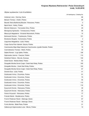 Krajowa Wystawa Retrieverów i Psów Dowodnych Łódź, 14.05.2016 Wykaz wystawców / List of exhibitors Nr katalogowy / Catalog No. Andersen Jens - Herning, Dania 66 Banach Tomasz - Chełm, Polska 86 Beszter Alena Bartłomiej Beszter- Warszawa, Polska 3 Bęcki Karol - Kalisz, Polska 94 Bieniok Katarzyna - Tarnowskie Góry, Polska 20 Bieregowoj Agnieszka - Tomaszowice, Polska 96 Błaszczyk Magdalena - Grodzisk Mazowiecki, Polska 14 Borkowski Damian - Trzebieszów, Polska 101 Brodowicz Brygida - Komorowice, Polska 2 Ciążyńska Magdalena - Łódź, Polska 129 Czajor Sonia Piotr Ułamek- Gdynia, Polska 91 Czechowska Maja Maja Katarzyna Czechowska- Ignatki-Osiedle, Polska 15 Czerniakiewicz Tomasz - Marki, Polska 34 Dąbek Roman - Ługi Ujskie, Polska 126 Dąbrowska Joanna - Cierpice, Polska 110 Deldehed Helene - Skovde, Szwecja 132 Distel Daniel - Bielsko-Biała, Polska 62 Dowgiałło Monika Sonia Czajor- Osiek Nad Wisłą, Polska 100 Dowgiałło Monika - Osiek Nad Wisłą, Polska 102 Dowgiałło Monika Sonia Czajor- Osiek Nad Wisłą, Polska 87 Drobnik Ewa - Łódź, Polska 41 Dudkowiak Irmina - Drzonków, Polska 81 Dudkowiak Irmina - Drzonków, Polska 75 Dudkowiak Irmina - Drzonków, Polska 54 Dudkowiak Irmina - Drzonków, Polska 115 Dudkowiak Irmina - Drzonków, Polska 116 Eysymontt Dorota - Warszawa, Polska 30 Eysymontt Dorota - Warszawa, Polska 25 Ferenc Krzysztof - Warszawa, Polska 77 Fościak Marek - Mysłakowice, Polska 61 Fromm Pedersen Randi - Stakroge, Dania 67 Fromm Pedersen Randi - Stakroge, Dania 72 Fuchs Monika - Biała Piska, Polska 21 Galbarczyk-Gąsiorowska Luiza - Błonie, Polska 10 Gęsiewska Aneta - Choroszcz, Polska Gierkowska Agnieszka - Warszawa, Polska Gilińska-Veitch Agnieszka - Magdalenka, Polska 4 53 124 Golińska Agnieszka - Morawica, Polska 13 Gorzelak-Mrówka Dorota - Justynów, Polska 12 Grab Joanna - Kołobrzeg, Polska 32 Grab Joanna - Kołobrzeg, Polska 48 Grobelna Karolina - Poznań, Polska 122 Grosset Joanna - Marki, Polska 131 Grundkowska Małgorzata - Wieliczka, Polska 60 Hakamies Karlsson Jeanette - Skokloster, Szwecja 133 Hanysz Aleksandra Arkadiusz Tracz- Milicz, Polska 105 Hoff Władysław - Łódź, Polska 68 Husar Beata - Słupsk, Polska 84 Ivanyukov Sergey - Moscow, Rosja 50 Ivanyukov Sergey - Moscow, Rosja 29 Jaguścik Krzysztof - Dąbrowa Górnicza, Polska 70 Janik Agnieszka - -, Polska 23 Janik Agnieszka - -, Polska 31 Kaczor Aleksandra - Sosnowiec, Polska 128 Kaczor Przemysław - Sosnowiec, Polska 130 Karolak Dominika - Łódź, Polska 117 Kendall Herr - 467 CR 131 Gainesville, USA 109 Klekowska Aneta - Radomsko, Polska 57 Klimczak Ewelina - Zduńska Wola, Polska 24 Kłudkowski Przemysław - Lipno, Polska 92 Kochaniecki Jacek - Ślesin, Polska 83 Kotulska Marzena - Piaseczno, Polska 52 Kowalczyk Agnieszka Beata Urbańczyk-Zając- Kraków, Polska 64 Kowalczyk Krzysztof - Opole, Polska 106 Kowalska Katarzyna - Józefów, Polska 108 Krasicka Barbara - Toruń, Polska 103 Krasicka Barbara - Toruń, Polska 112 Krasicka Barbara - Toruń, Polska 89 Król Gabriela - Łódź, Polska Kubacka Anna - Kobylnica, Polska Kubasiewicz Lena - Józefosław, Polska 123 43 121 Kula Joanna - Kotlin, Polska 99 Kunikowska Adrianna - Gdynia, Polska 18 Kunikowska Adrianna - Gdynia, Polska 17 Kwiecińska-Pawlak Ilona - Szadek, Polska 80 Leder-Pietrzko Anna - Łódź, Polska Lisowska Maria Magdalena Izabela Serek- Tomaszowice, Polska 125 74 Lisowska Maria Magdalena - Tomaszowice, Polska 118 Lisowska Maria Magdalena - Tomaszowice, Polska 104 Łopatka Renata - Oborniki, Polska 114 Łopatka Renata - Oborniki, Polska 82 Łukaszczyk Agnieszka Anita Wojniak-Kołodziejak- Lublin, Polska 28 Łukaszczyk Agnieszka - Lublin, Polska 44 Łyszkowski Jakub Elżbieta Gańko-Łyszkowska- Stare Babice, Polska 42 Marcinkowski Tadeusz - Lipce Reymontowskie, Polska 85 Masternak-Świątczak Grażyna - Łąck, Polska 1 Meissner Anna - Łódź, Polska 5 Miżejewski Jacek - Aleksandrów Łódzki, Polska 47 Moskwa Dorota - Skierniewice, Polska 40 Niedzielska Barbara Małgorzata Santorek- Łódź, Polska 16 Niedzielska Barbara - Łódź, Polska 8 Nowak Robert - Czeladź, Polska 51 Osuch Małgorzata, Przemysław - Puszczykowo, Polska 58 Paporn Chaiyot - Bangkok, Tajlandia 69 Pawlak-Szymczak Monika - Poznań, Polska 6 Pawlak-Szymczak Monika - Poznań, Polska 9 Petrova Svetlana - Vologda, Rosja Petrova Svetlana Victor Petrov- Vologda, Rosja 79 111 Piechuta Magdalena - Jeżowe, Polska 63 Piegat Bernadeta - Warszawa, Polska 38 Połetek Aneta - Wrocław, Polska 33 Pstrokoński Artur - Piotrków Trybunalski, Polska 27 Saczuk Ewa - Warszawa, Polska 120 Sar Urszula - Radom, Polska 19 Sar Urszula - Radom, Polska 7 Seytyagyaev Edem - Kiev, Ukraina Sobczak Elzbieta - Myszków, Polska 56 107 Stanaszek Magdalena, Ewelina Ewelina Stanaszek- Karczew, Polska 37 Staniek Kamila - Skierniewice, Polska 55 Staniszewska Magdalena - Kołobrzeg, Polska 36 Suchy Mariusz - Łódź, Polska 93 Susha Natalliia - Minsk, Białoruś 46 Susha Natalliia - Minsk, Białoruś 26 Szulc Michał Beata Staniszewska- Częstochowa, Polska 22 Szymiczek Jarosław - Zebrzydowice, Polska 45 Świtońska Katarzyna - Łódź, Polska Ułamek Piotr - Gdynia, Polska Wasilewski Wiesław - Dobiegniew, Polska 119 78 113 Waszkiewicz Marek - Janów, Polska 71 Waszkiewicz Marek - Janów, Polska 98 Waszkiewicz Marek - Janów, Polska 73 Waszkiewicz Marek - Janów, Polska 59 Wawrowski Jerzy - Białystok, Polska 49 Wąsik Wioletta - Sadowne, Polska 35 Wieruszewska Agata - Łódź, Polska 39 Wiktorowicz Artur - Łask, Polska 90 Wiktorowicz Artur - Łask, Polska 88 Wilska Martyna - Warszawa, Polska 11 Wszółkowska-Pęcherczyk Dorota - Wieluń, Polska 97 Zawiła Anna - Starachowice, Polska 65 Żak-Rosowska Dominika - Sandomierz, Polska 127 Żurawska Agnieszka - Częstochowa, Polska 95 Żurawska Agnieszka - Częstochowa, Polska 76